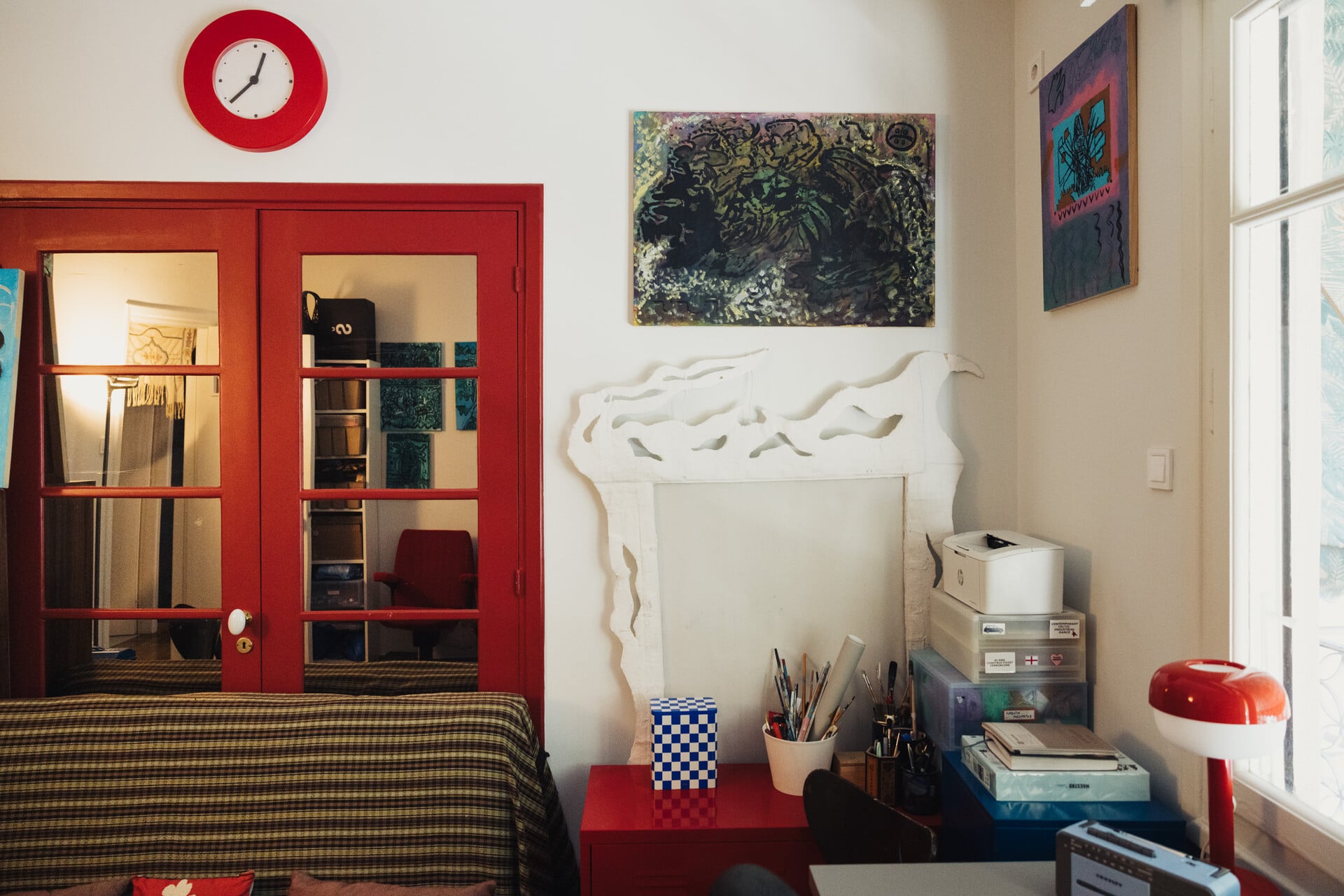 Το διαμέρισμα των εικαστικών Βαγγέλη Τζολάκη και Τάνιας Καπόγλου είναι από αυτά τα αγαπησιάρικα σπίτια που τα νιώθεις αμέσως σαν φιλόξενη αγκαλιά. Πηγαίνω από δωμάτιο σε δωμάτιο και συνειδητοποιώ ότι χρειάζεσαι χρόνο για να το εξερευνήσεις, αφού και οι δύο είναι «συλλέκτες αναμνήσεων» και τους αρέσει να συγκεντρώνουν ό,τι τους προκαλεί συγκίνηση.