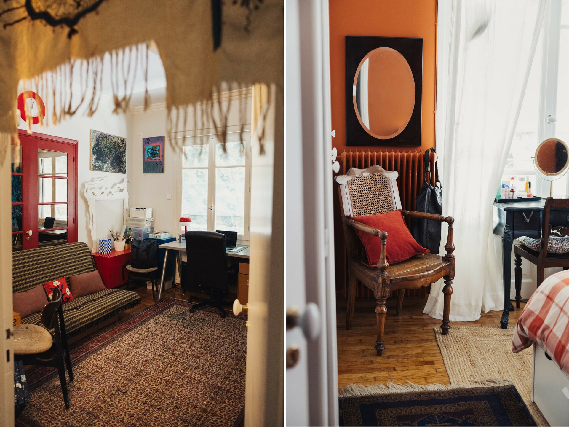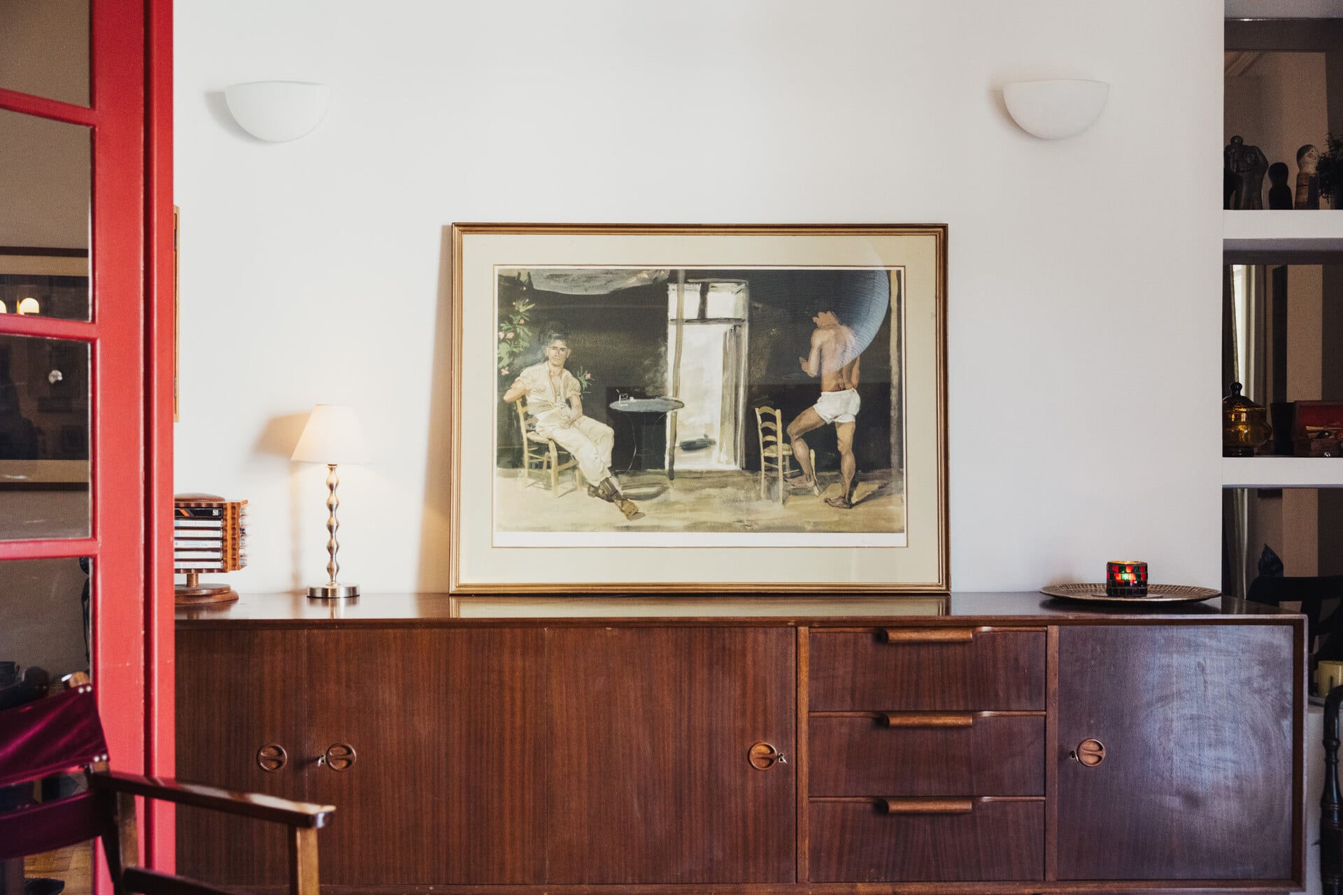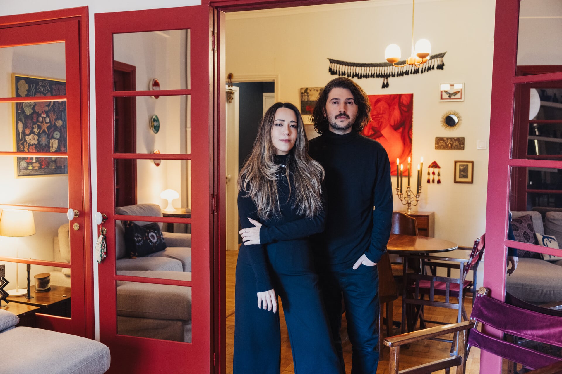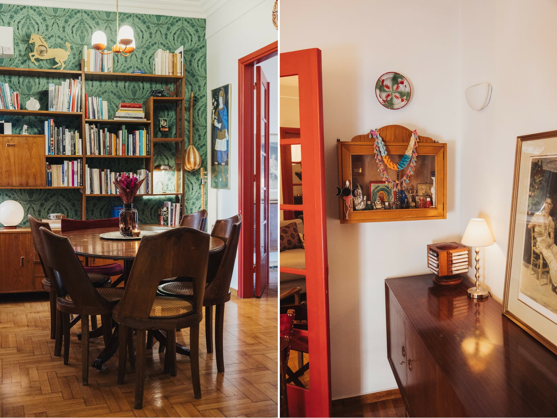 Το διαμέρισμα έχει όμορφες αντίκες, οικογενειακά τους κειμήλια, επιλογές από το Facebook marketplace και από flea markets, στα οποία πηγαίνουν ακούραστα. Το σαλόνι έχει δύο κλειστές πόρτες που τις έχουν βάψει σε ένα ωραίο, βαθύ κόκκινο χρώμα. Οι τοίχοι έχουν μια οικεία απόχρωση που κάνει διάλογο με την πράσινη ταπετσαρία, η οποία είναι αγορασμένη στο Λονδίνο. Ένα vintage ρολό βρήκε τον σωστό τοίχο και ντύνει όμορφα τη γεμάτη βιβλιοθήκη.