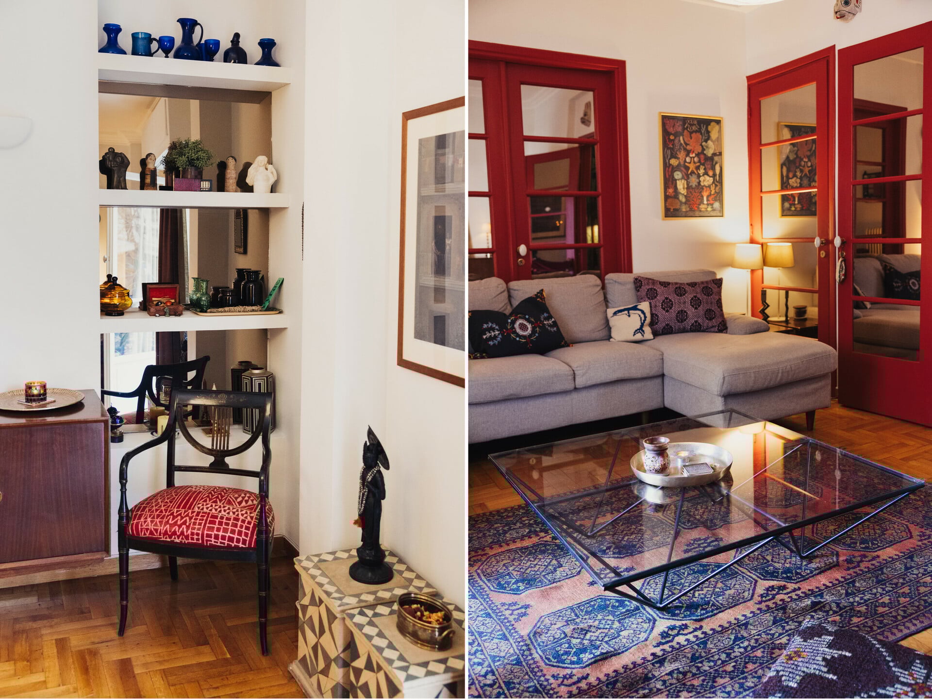Μου δείχνουν μια αγιογραφία που θυμίζει Φαϊτάκη, την οποία έτρεχαν μέσα στη νύχτα ώστε να προλάβουν προτού την πάρει κάποιος άλλος. Ο καναπές ήρθε από το προηγούμενο διαμέρισμα. Δεν θυμούνται από πού είναι αγορασμένος, μόνο ότι είναι βολικός. Κάποια άλλα έπιπλα μεταφέρθηκαν από το σπίτι τους στο Λονδίνο, όπου έζησαν δέκα χρόνια. Μου εξηγούν ότι η λογική τους δεν είναι «αγοράζω για να γεμίσω», αλλά «επιλέγω ό,τι με συγκινεί». Κάθε αντικείμενο έχει περάσει από φίλτρο, από διάλογο, από αναζήτηση. Στα ράφια έχουν τοποθετήσει μικρές συλλογές: μπλε γυαλικά και, χαμηλότερα, κεραμικά της Βερναδάκη και κάποια αντικείμενα του παππού και της γιαγιάς της Τάνιας.