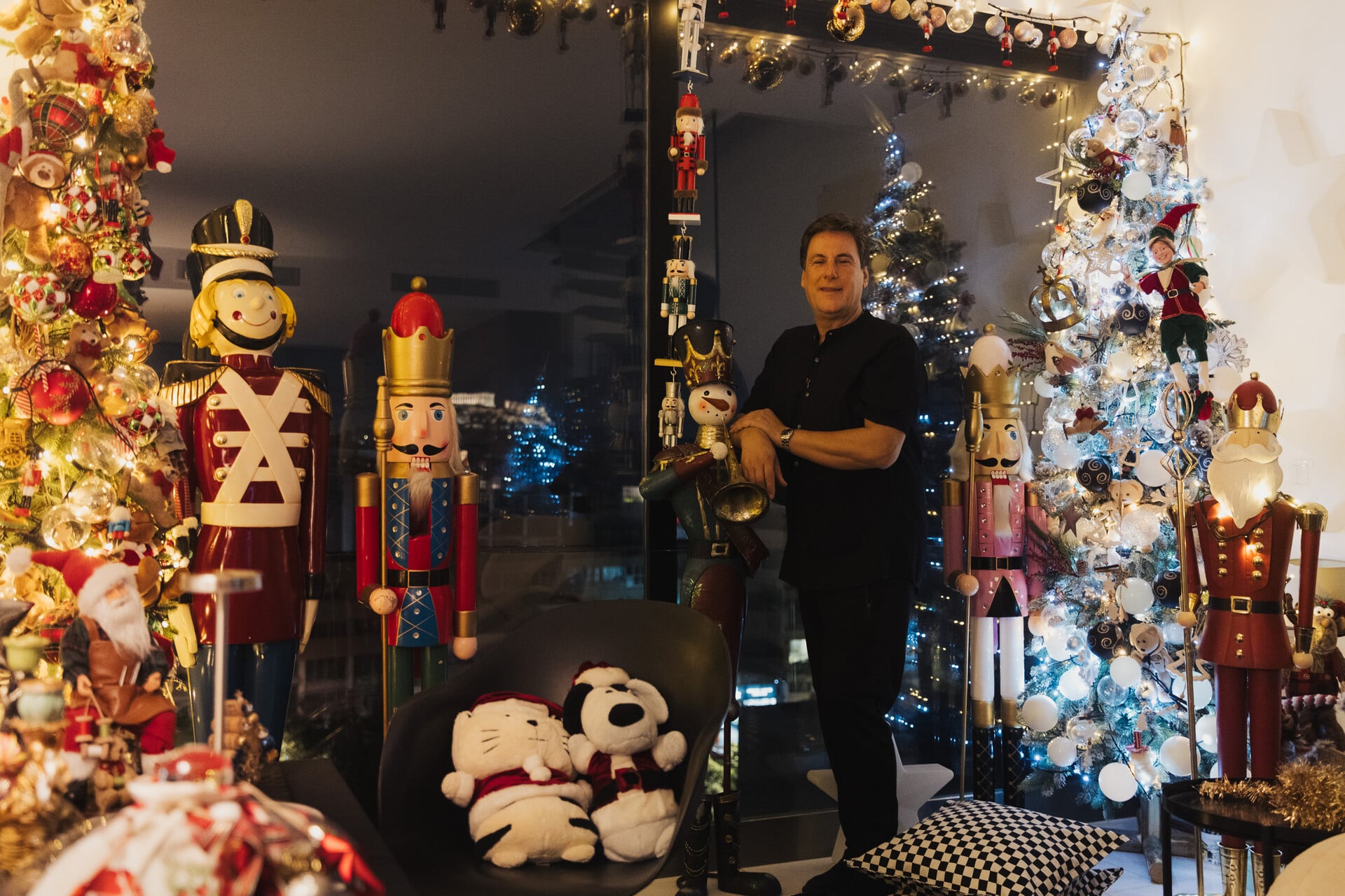 Ανεβαίνω στο ρετιρέ της πολύ μοντέρνας πολυκατοικίας του και μένω με το στόμα ανοιχτό. Είναι ένα σπίτι που τον διάκοσμό του θα τον ζήλευε το πολυκατάστημα Harrods του Λονδίνου, ένα ζωντανό παραμύθι, μια κατάσταση χριστουγεννιάτικης έκστασης. «Τι είναι εδώ;» τον ρωτάω. «Ο αλώβητος χώρος της παιδικής ηλικίας», λέει ποιητικά και πραγματικά έχω χαζέψει. Πέντε μεγάλα δέντρα πάνω από δύο μέτρα ύψος το καθένα, γεμάτα με κάθε λογής στολίδια. Θεματικά δέντρα: ένα με Playmobil, ένα άλλο με σπάνια στολίδια. Άγγελοι, καρυοθραύστες και όποιο καλόγουστο χριστουγεννιάτικο στολίδι μπορείς να σκεφτείς. Και ενώ το διαμέρισμα έχει συγκλονιστική θέα την Ακρόπολη, όλα αυτά τα λαμπιόνια την κάνουν να μοιάζει με άλλο ένα στολίδι του διάκοσμου.