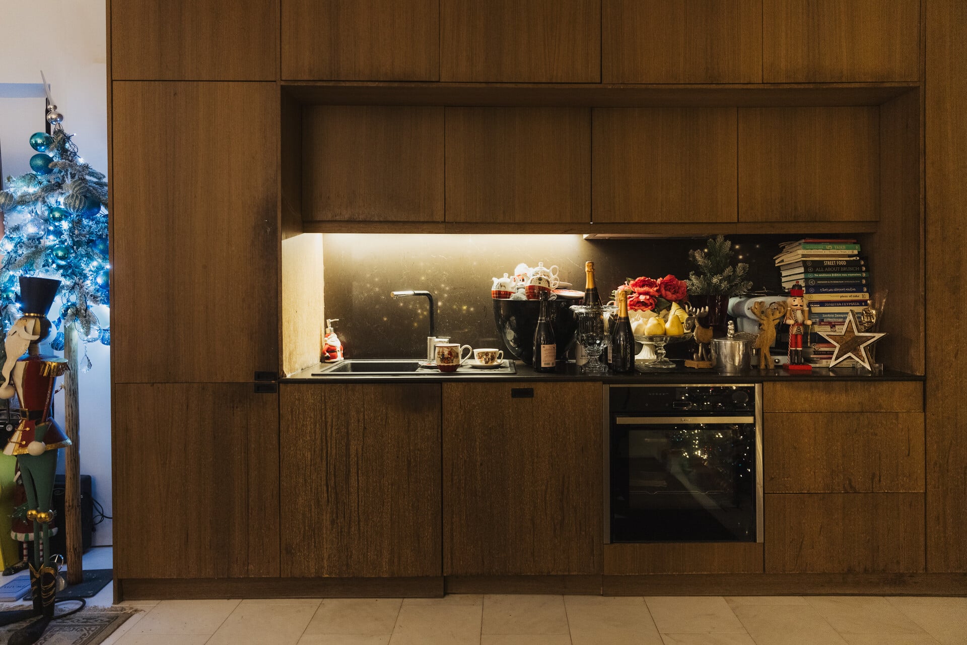 Πέφτει το μάτι μου στο όμορφο σερβάν του. Το περίμενε πάνω από δυο μήνες, γιατί ήρθε από τη Σουηδία. Του αρέσει πολύ το σκανδιναβικό design. Η πολυκατοικία είχε στο δάπεδο τσιμεντοκονία, αλλά ο Χρήστος προτίμησε τα μάρμαρα Άριστον εκ Δράμας, που είναι εξαιρετικής ποιότητας. Οι σκάλες είναι από μαύρο χαλαζία, όπως και ο πάγκος της κουζίνας.