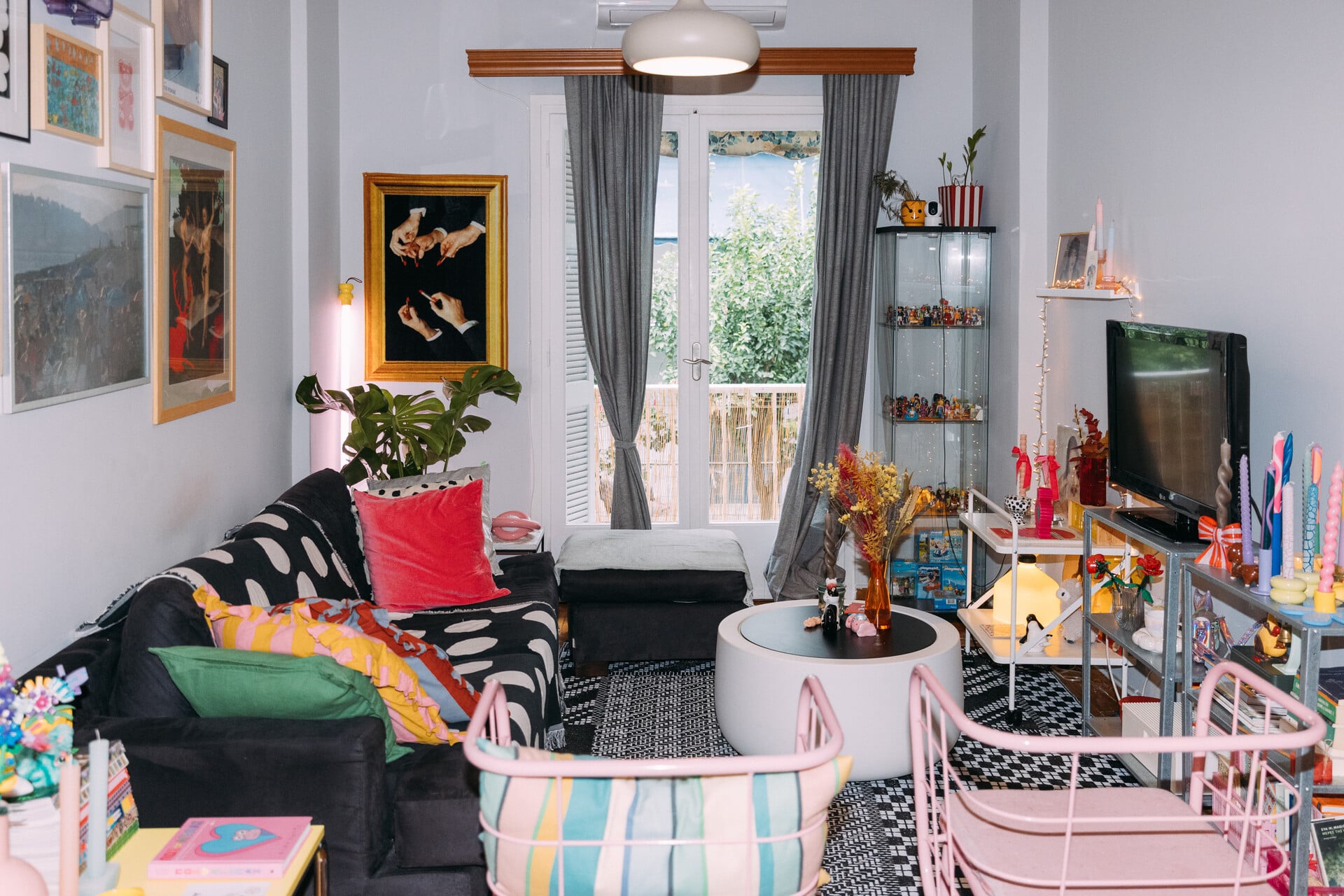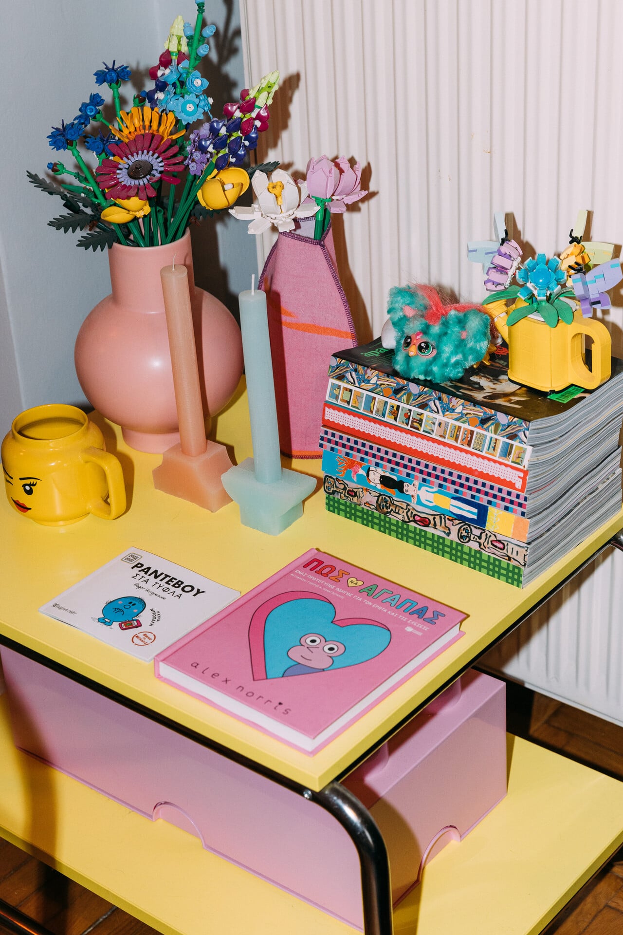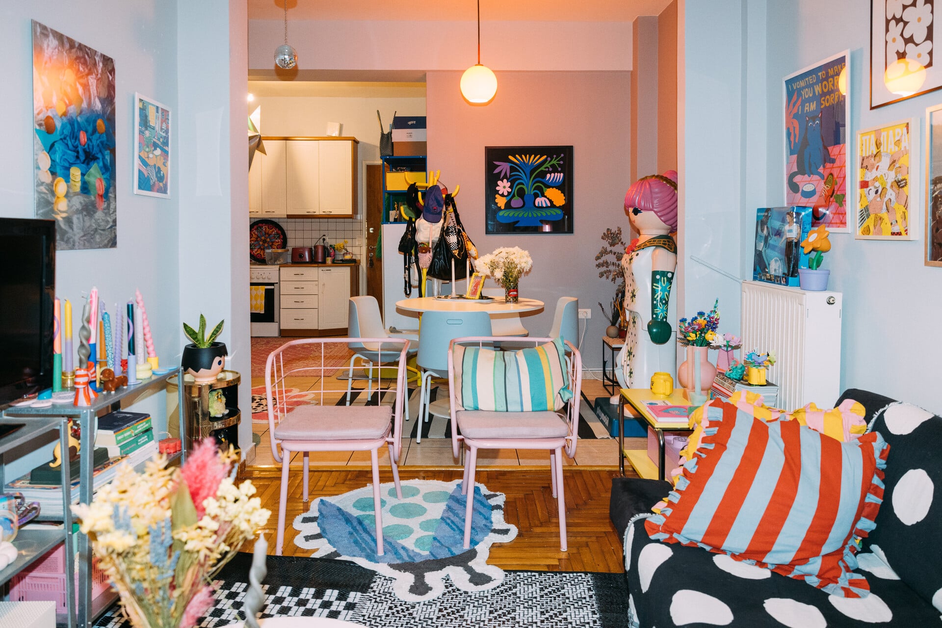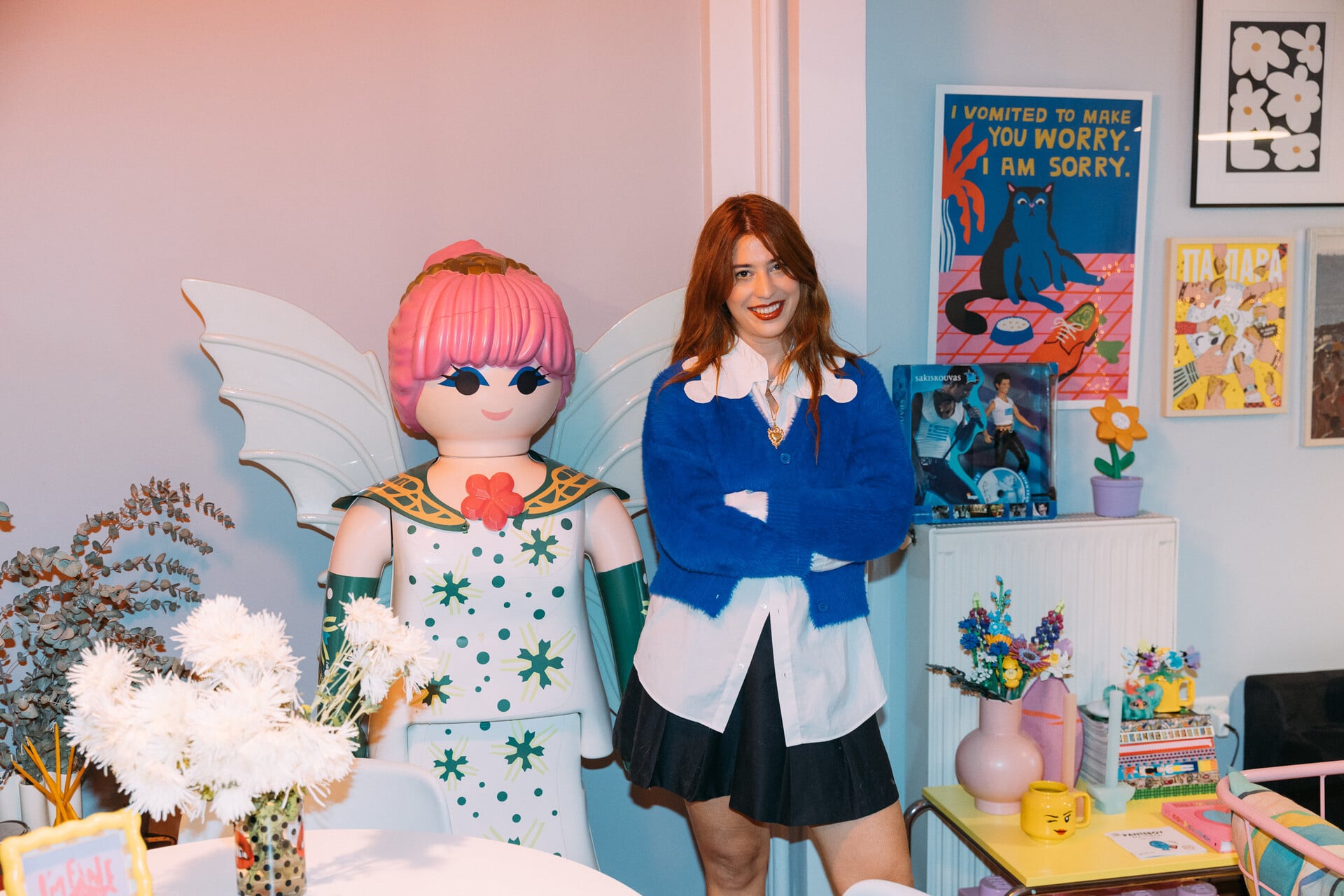 Εt voilà, λίγες εβδομάδες μετά, να ’μαι στο διαμέρισμά της στο Παγκράτι. Μου ανοίγει την πόρτα και ένα σύμπαν σαν τσιχλόφουσκα ξετυλίγεται μπροστά μου. Είναι το σπίτι που θα ήθελα να έχει η φιλενάδα των παιδικών μου χρόνων, όπου θα παίζαμε με Lego και κούκλες όλη μέρα.