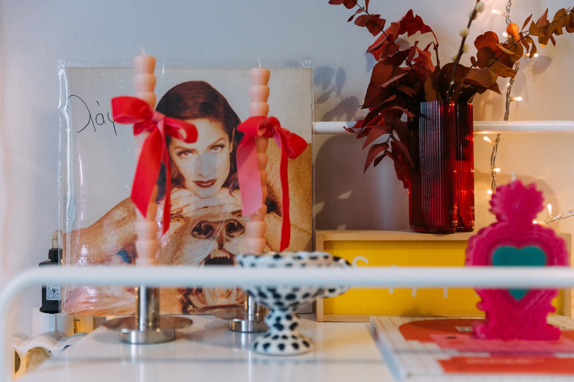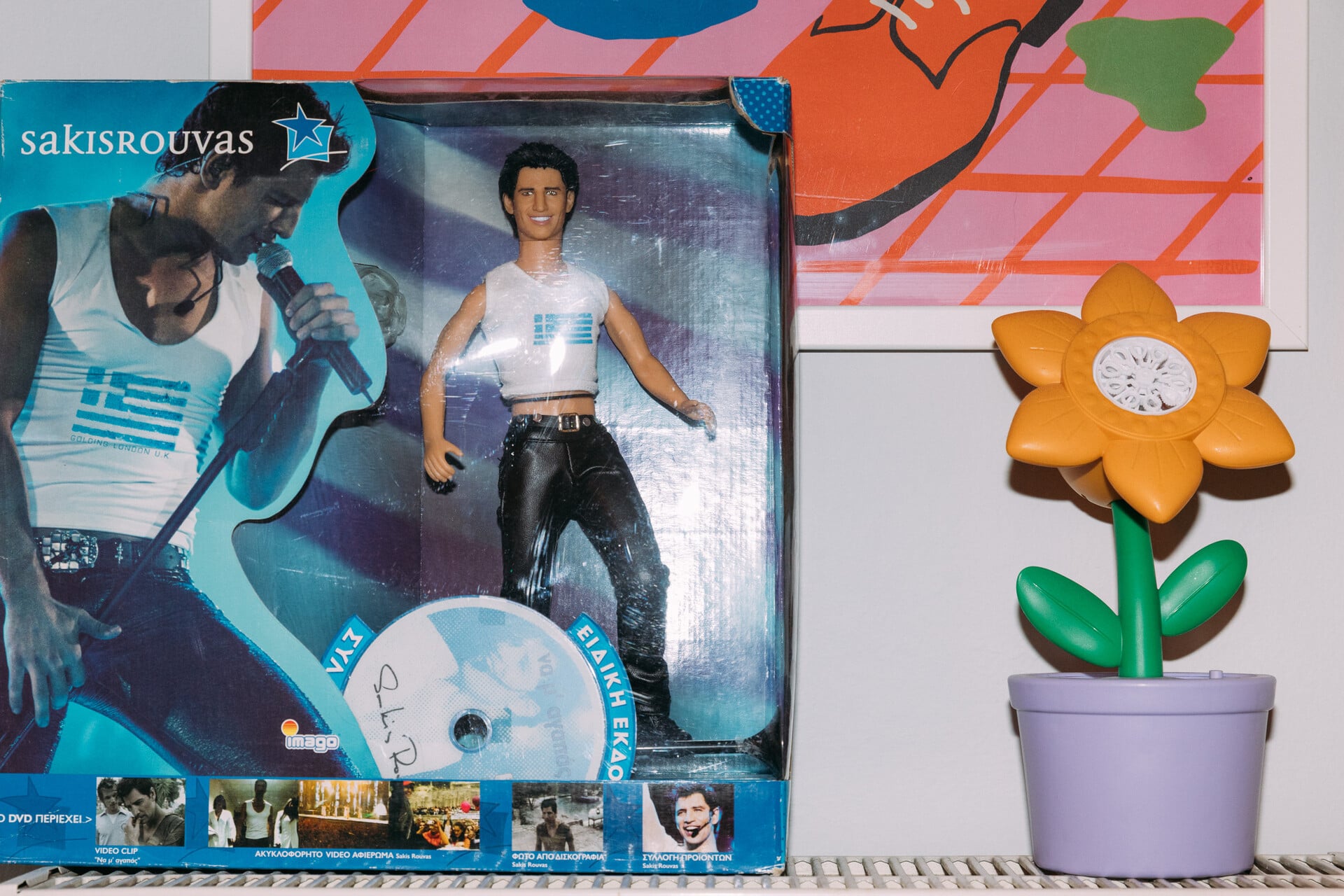 Κι αυτό το τσαντάκι που έχει βάλει για διακοσμητικό σε ένα από τα ράφια της; Πρόκειται για τη θήκη της φωτογραφικής μηχανής Polaroid. «Περνούσα την ιριδίζουσα φάση μου, όποτε σε αυτό το ράφι έβαλα όλα τα ιριδίζοντα αντικείμενα. Εκεί είναι το ράφι της Άννας Βίσση. Είμαι “βισσικιά”, την αγαπώ», δηλώνει και μου δείχνει μια σύνθεση με δίσκους που έχει ως θεματική την τραγουδίστρια.