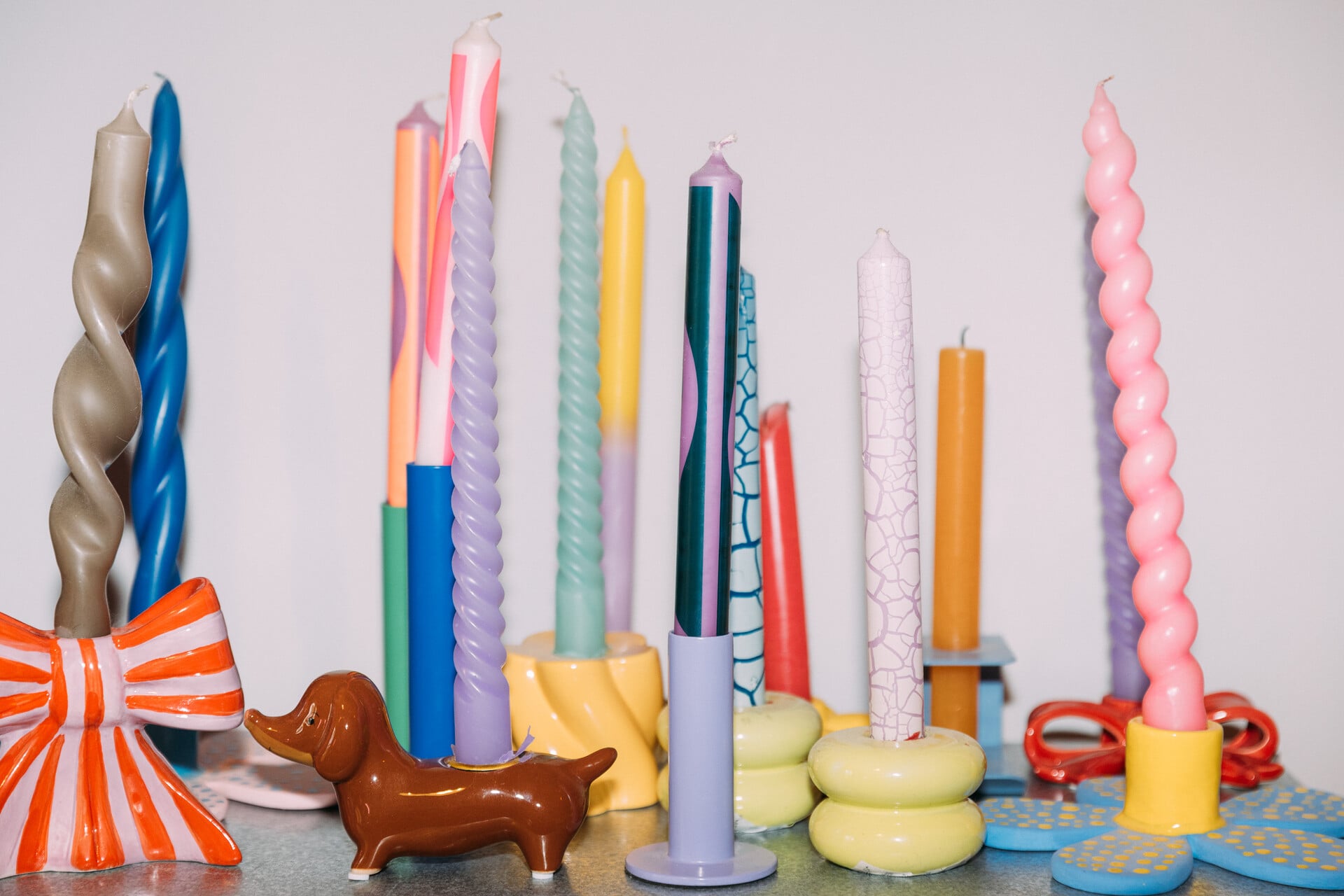 Της ζητάω να μου μιλήσει για τις συλλογές της, γιατί παρατηρώ ότι βάζει τα πράγματα σε σύνολα. Μου εξηγεί ότι της προκύπτουν τυχαία: «Να, βρήκα ένα ωραίο κερί, μετά σκέφτηκα ότι το κερί χρειάζεται ένα κηροπήγιο, μετά πήρα άλλο ένα κηροπήγιο και κάπως έτσι βρέθηκα με δεκαπέντε κηροπήγια. Τα έβαλα σε ένα ράφι όλα μαζί να κάνουν παρέα».