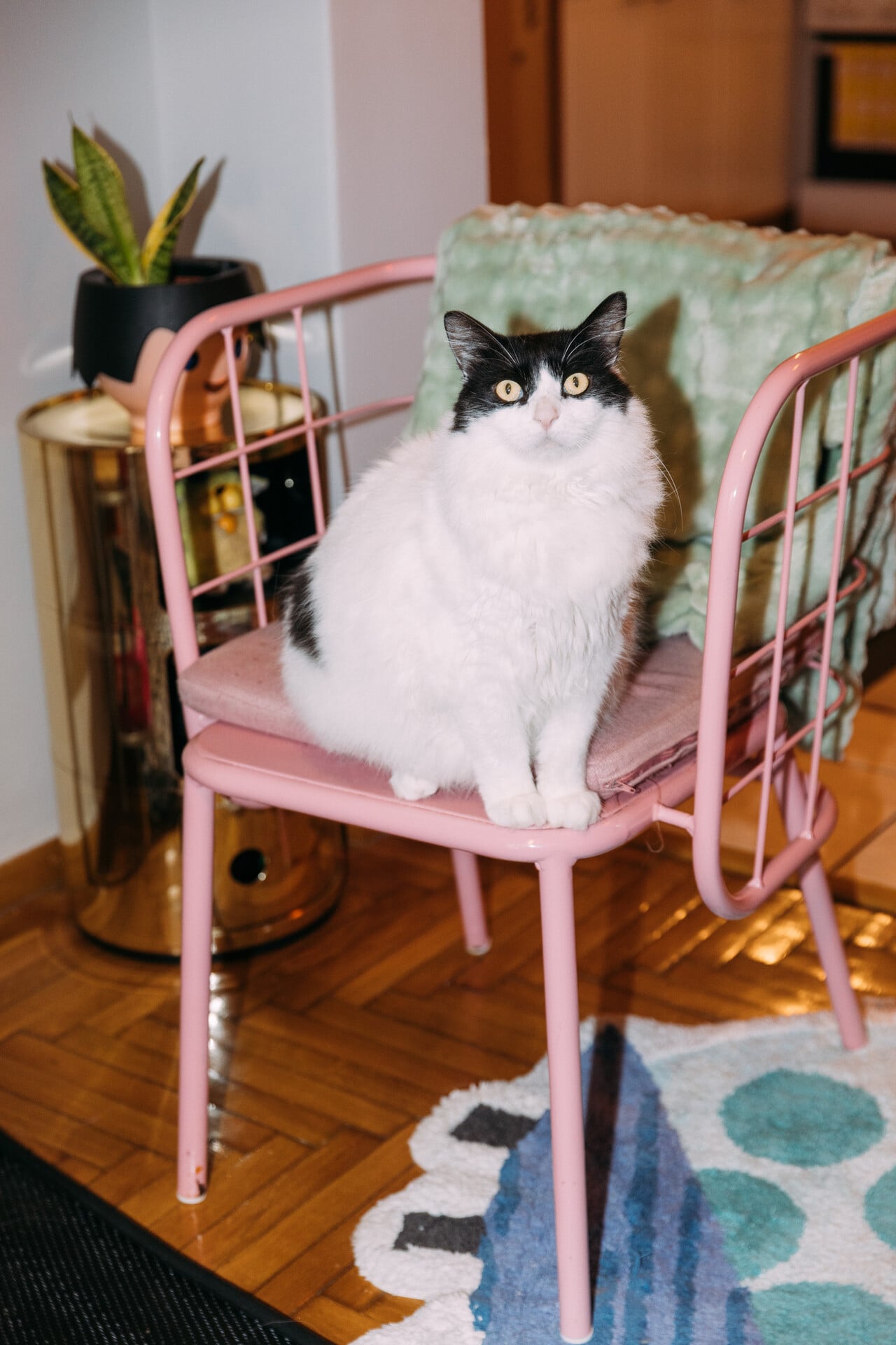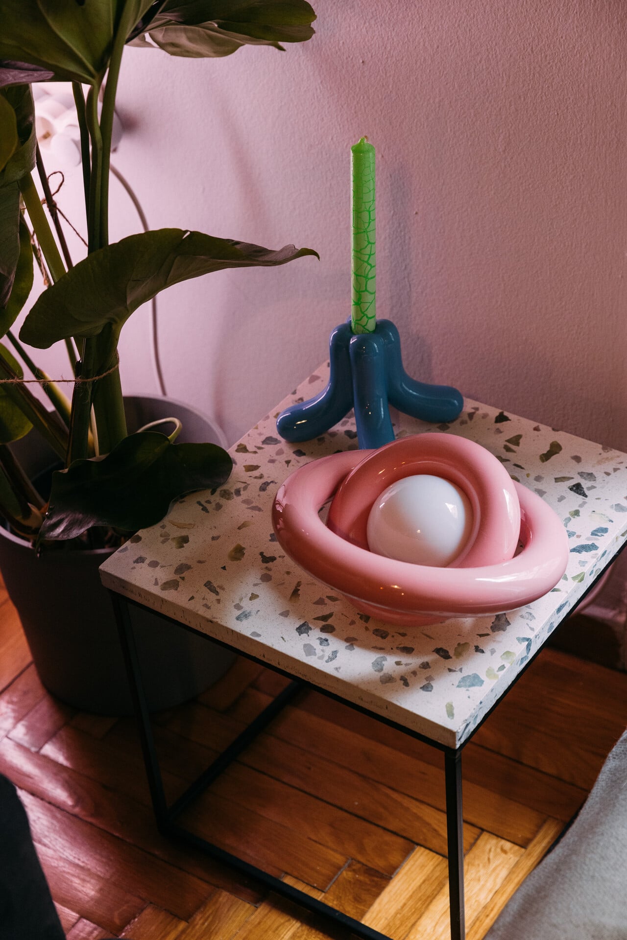 Μιλάμε για τα έπιπλά της. Μου λέει ότι έχει κάνει ένα πάντρεμα από πιο φτηνά έπιπλα μαζί με πιο ιδιαίτερα κομμάτια. «Δεν μπορώ να κάνω εκπτώσεις σε κάποια πράγματα. Αυτό το Kartell χρυσό κομοδίνο το ήθελα χρυσό, δεν θα διαπραγματευόμουν μεταξύ αυτού και κάποιου που έβρισκα πιο φτηνό στο marketplace σε άλλο χρώμα». O καναπές της είναι παλιός, τον βρήκε στο σπίτι όταν ήρθε, τον είχαν αφήσει. Το μόνο που του έκανε ήταν έναν βιολογικό καθαρισμό. Το τραπέζι τής το έδωσε ο φίλος της ο Μίλτος από το Studio Materiality, όπως και τις γαλάζιες καρέκλες. Οι δυο ροζ καρέκλες είναι από ένα καφέ απέναντι από το μαγαζί∙ της τις έδωσαν όταν άλλαξαν διακόσμηση.