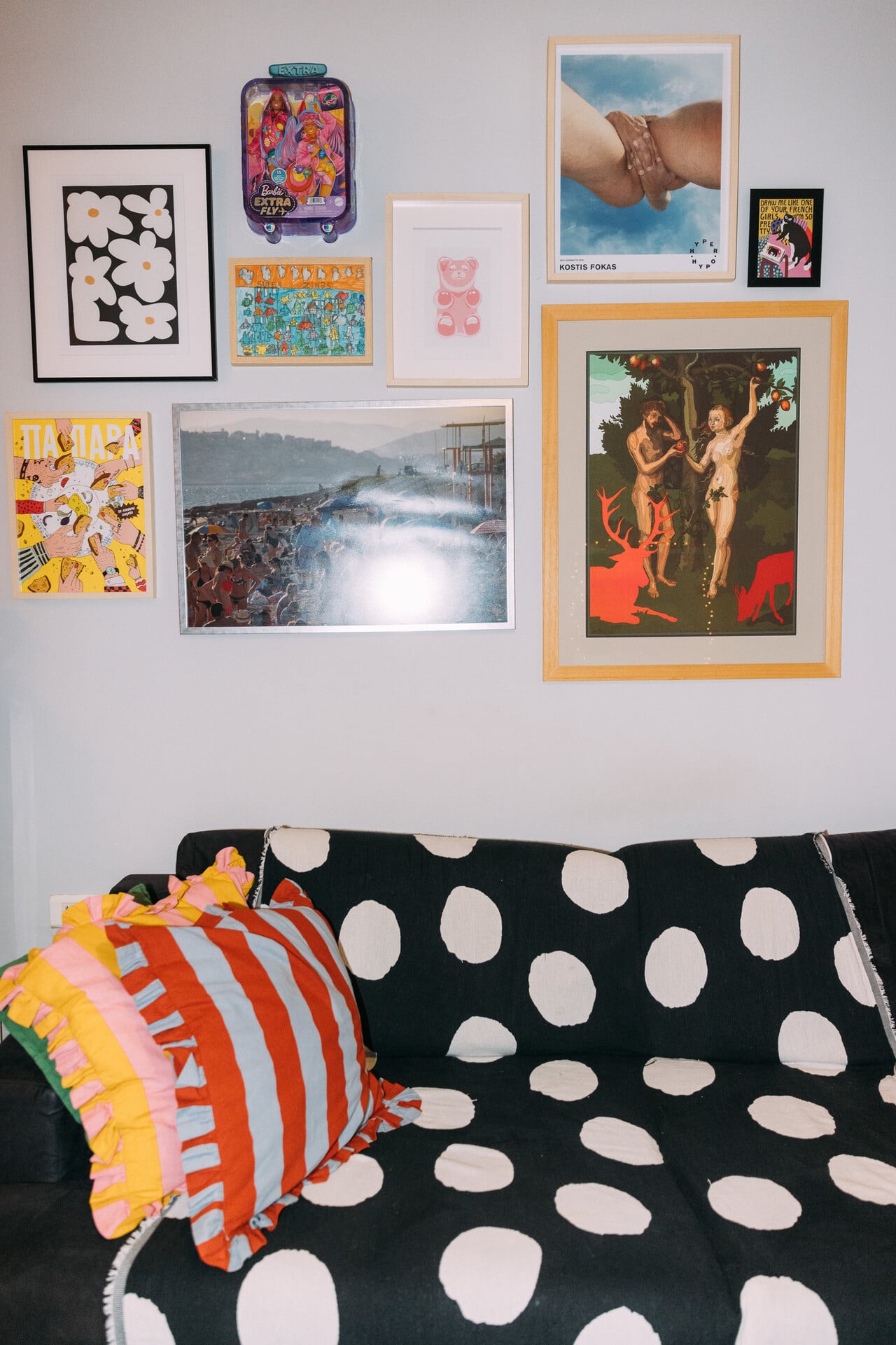 Όσο για την τέχνη, δηλώνει λάτρης, αλλά προς το παρόν έχει την τέχνη που αντέχει το πορτοφόλι της. Εύχεται στο μέλλον να έχει περισσότερα έργα. Μου δείχνει όμως με καμάρι μια φωτογραφία της Αλίνας Λέφα και μια μεταξοτυπία της Ιωάννας Χατζηανδρέου. Μια φωτογραφία του Κωστή Φωκά, μια ζωγραφιά του μικρού της αδελφού και μια συσκευασία δώρου Βarbie, δώρο μιας φίλης της για τα Χριστούγεννα. «Πάντως τον τοίχο τον γέμισες», παρατηρώ. «Αυτό ήταν το ζητούμενο. Κάτω οι άσπροι τοίχοι, ναι στον πλουραλισμό», λέει με πάθος, σαν να πρόκειται για μανιφέστο.