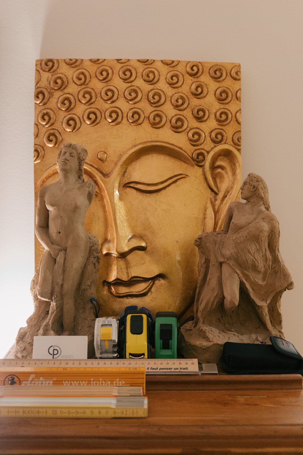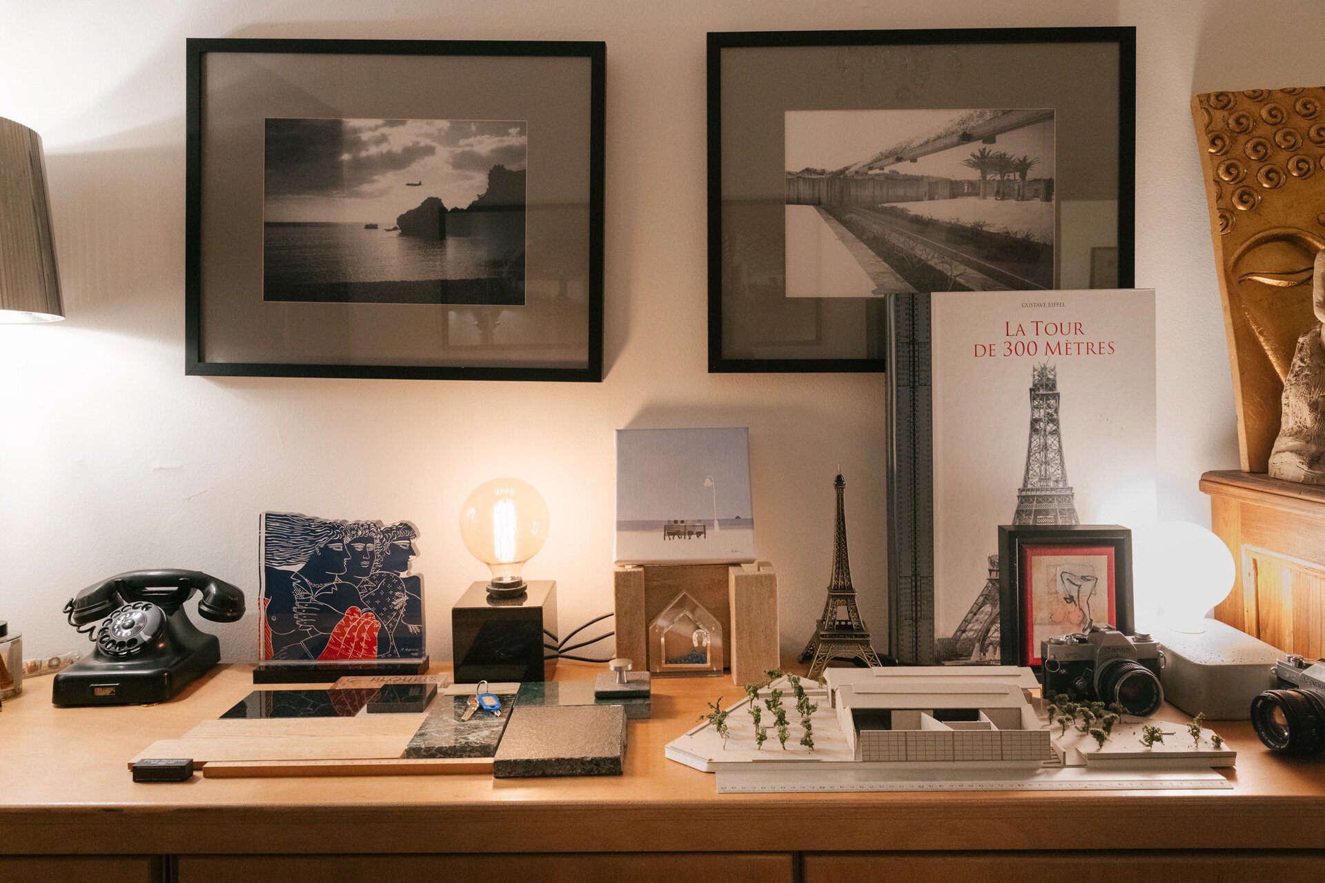 Μαθαίνω ότι σε αυτό το διαμέρισμα μετακόμισε το 2008. Ήταν έρωτας με την πρώτη ματιά. Το είδε και αμέσως φαντάστηκε πώς ήθελε να γίνει. Αυτή είναι η δουλειά του και είναι λογικό, παρατηρώ. «Έκανα αμέσως την κάτοψη και οραματίστηκα πώς μπορεί να λειτουργήσει συνολικά». Το εντυπωσιακό ήταν η ταχύτητα με την οποία έγιναν όλα – μέσα σε είκοσι μέρες. Σε πέντε μέρες είχε αδειάσει το γραφείο του, είχε αφήσει το προηγούμενο σπίτι και έστησε το καινούργιο. «Μόλις το ολοκλήρωσα, αγόρασα ένα εισιτήριο, πήγα στο Παρίσι και ήπια ένα ωραίο κρασί στην υγειά μου και στο νέο ξεκίνημα», θυμάται.