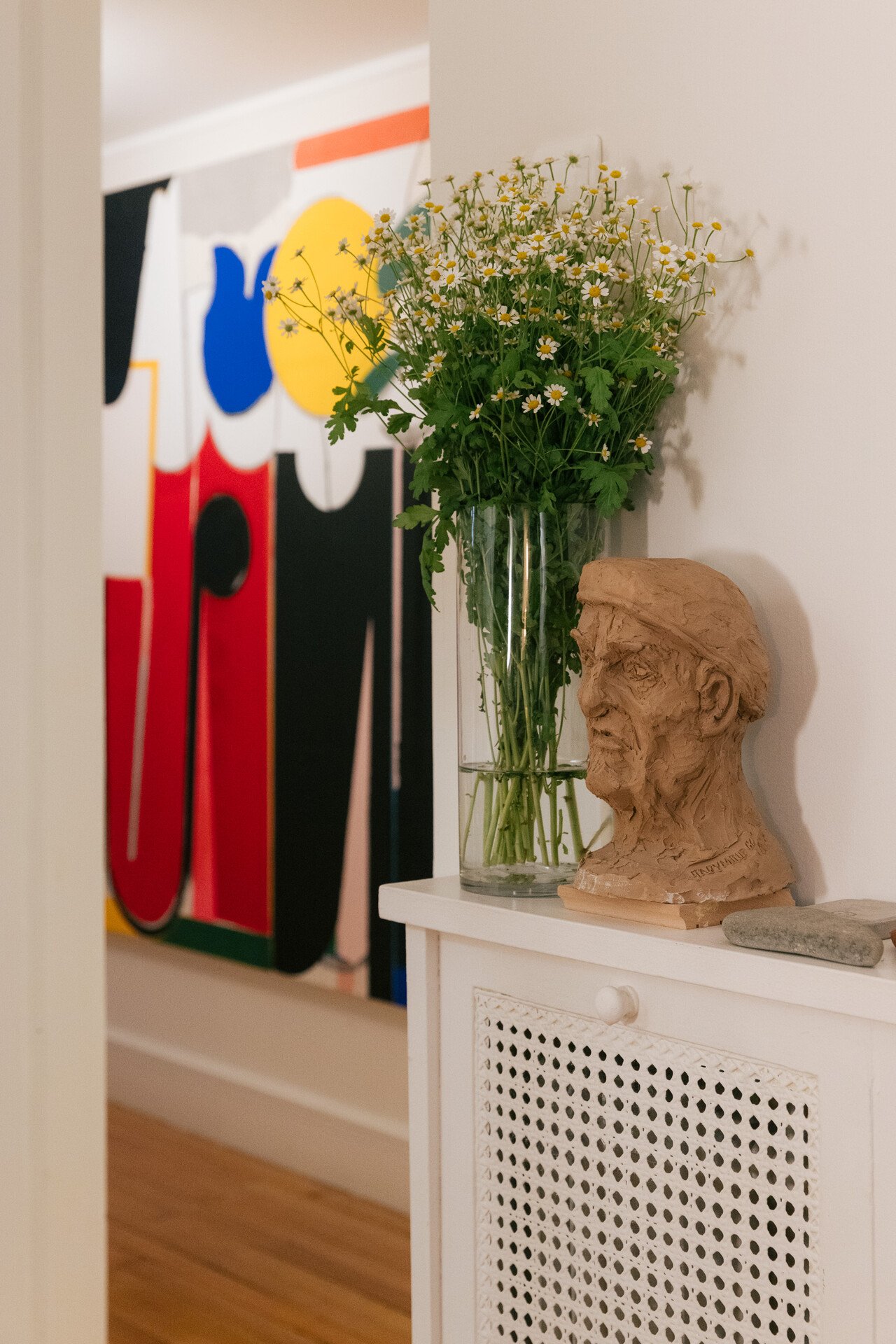 Το έπιπλο-αντίκα της εισόδου είναι μια κλασική συρταριέρα συμβολαιογράφου. «Είναι αρχειοθήκη από το Μοναστηράκι, απ’ τον φίλο μου τον Κωνσταντάρα, που βρίσκει πολύ ωραίες αντίκες», λέει.