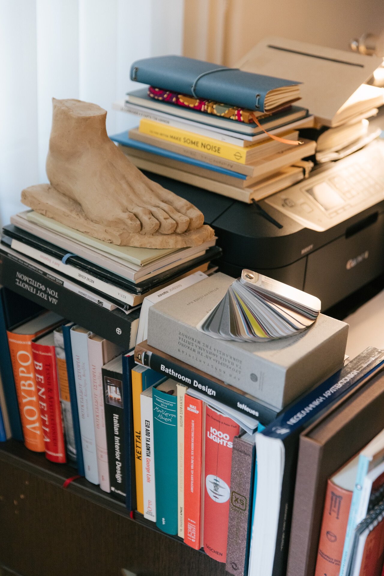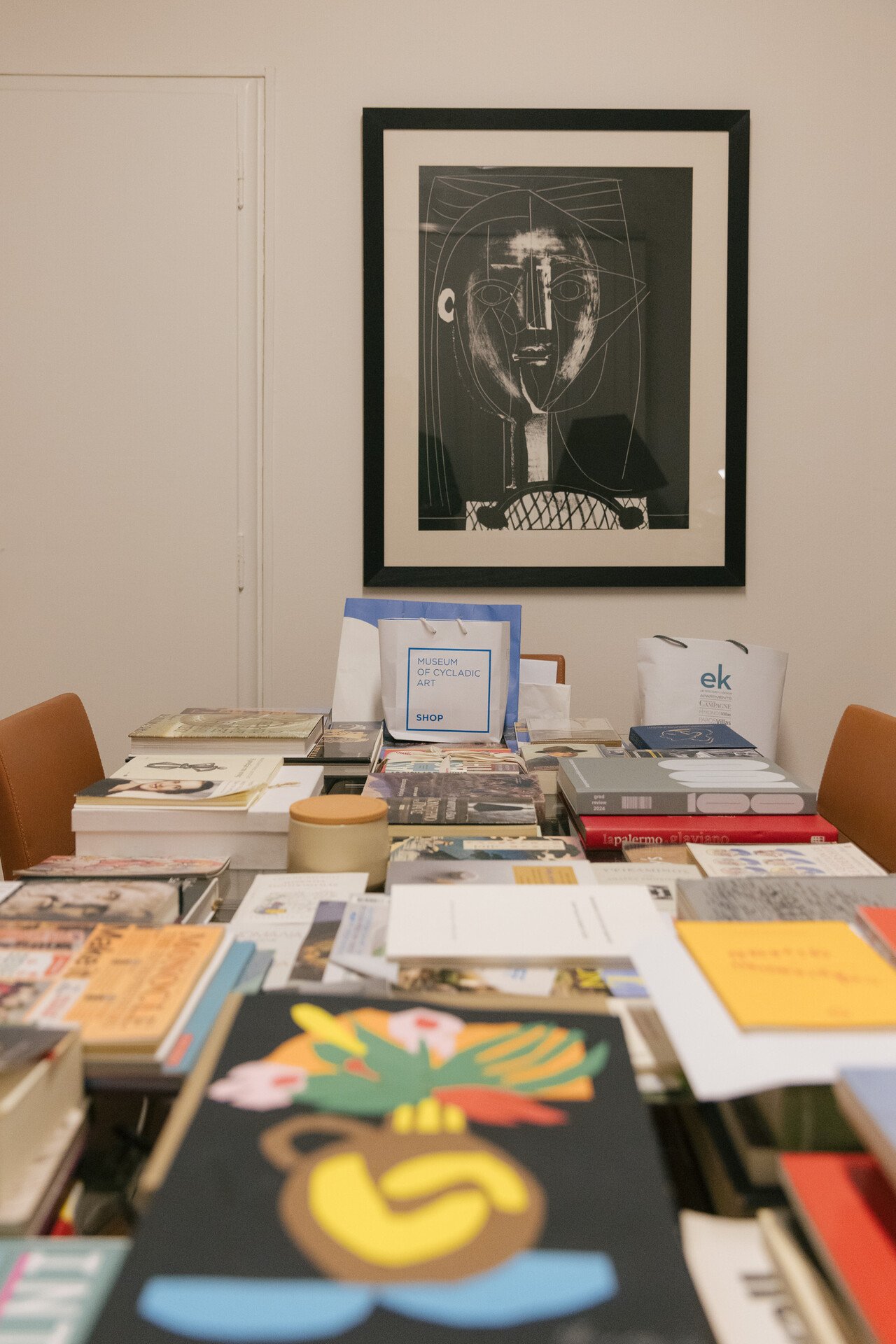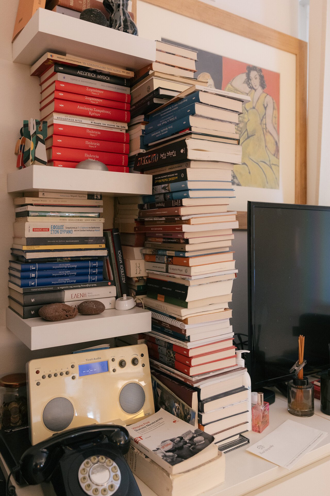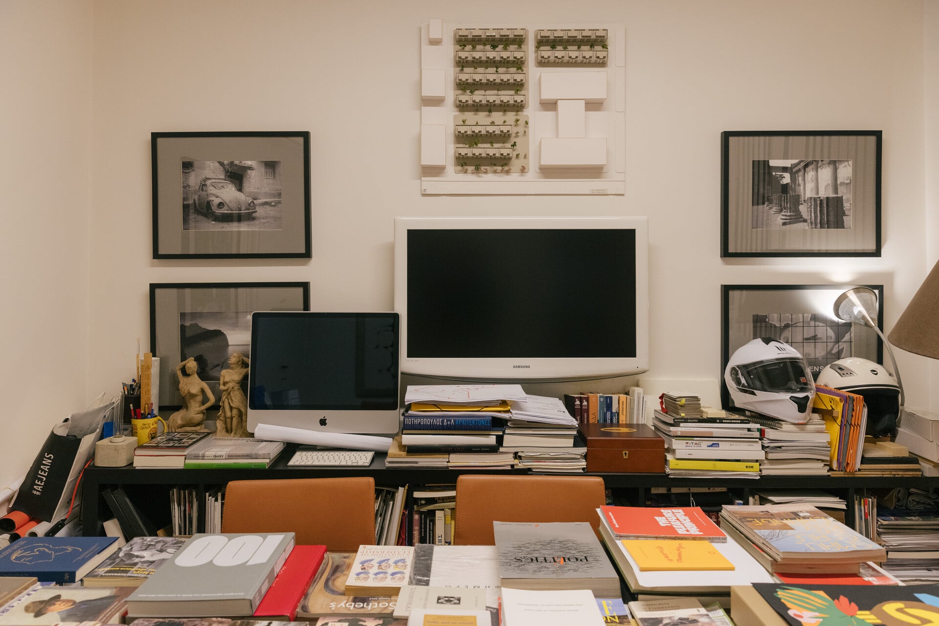Πριν φύγω, μου λέει «έλα να δεις κάτι». Με πηγαίνει στο μέσα δωμάτιο και μου δείχνει ένα γραφείο γεμάτο με βιβλία που τα έχει τοποθετήσει σαν installation. «Τι είναι αυτό;» ρωτάω εντυπωσιασμένη. Μου εξηγεί πως το καλοκαίρι είχε ένα σοβαρό ατύχημα. Έπαθε στις διακοπές του στη Μήλο ένα συντριπτικό κάταγμα και χρειάστηκε εγχείρηση. Πέρασε μεγάλη ταλαιπωρία και έμεινε ενάμιση μήνα σε κέντρο αποκατάστασης. Κάθε φίλος που ερχόταν τού έφερνε ένα βιβλίο, τα περισσότερα σχετικά με την αρχιτεκτονική και το design. Οπότε, λέει, δημιούργησε στο γραφείο του ένα υποθετικό μνημείο φίλιας με αυτά τα εβδομήντα βιβλία που του έφεραν. «Είναι κάτι σαν ιερό τοτέμ φιλίας που με συγκινεί ακόμα. Δεν ξέρω πόσο θα το κρατήσω. Είναι για να θυμάμαι ότι η αγάπη είναι η μοναδική κατάσταση ίασης. Άνθρωποι που τους περίμενα δεν ήρθαν ποτέ, και με άλλους που νόμιζα ότι είχαμε χαθεί ξαναβρεθήκαμε συγκινητικά».