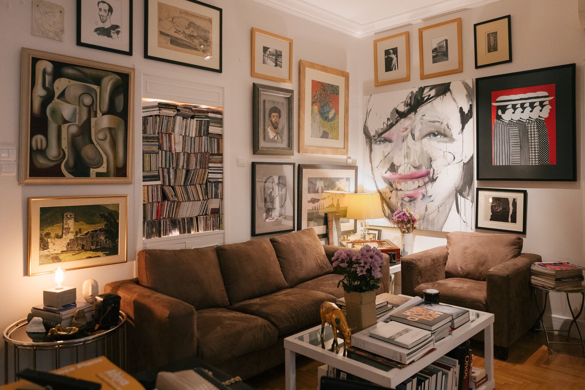 Τον ρωτάω για τα έργα τέχνης – είναι η ψυχή ενός σπιτιού, υποστηρίζει. Ξεχωρίζω έναν πίνακα του Αλέξανδρου Βασμουλάκη με τίτλο «Λολίτα». Έχει, επίσης, Φίλιππο Θεοδωρίδη, Γκίκα, Γαΐτη. Οι φωτογραφίες είναι όλες δικές του, απ' όταν σπούδαζε φωτογραφία. Το ίδιο και ένα ωραίο φαγιούμ που το είχε ζωγραφίσει, λέει, στα μαθήματα που έκανε στο Μουσείο Μπενάκη. «Έχω αγαπήσει τα φαγιούμ απ’ τον Τσαρούχη», μου εξηγεί. Ένα άλλο έργο είναι του Σικελιώτη. Παρατηρώ πως έχει και αρκετά γλυπτά από την εποχή που έκανε μαθήματα γλυπτικής με τον αείμνηστο Αρμακόλα. «Έφτιαχνα γυναικεία σώματα με τέλειες αναλογίες (βραζιλιάνικες) και ο δάσκαλος με τη σπάτουλα μού τα χαλούσε για να φαίνονται πιο γήινα. Εγώ όμως τα επανέφερα για να έχουν το στήθος και τα οπίσθια που φανταζόμουν».