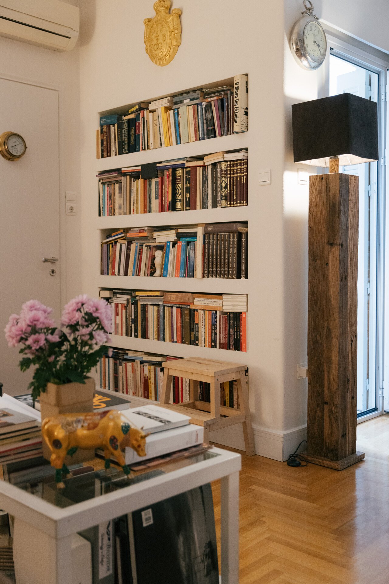 Παρατηρώ την ωραία βιβλιοθήκη του. Μου εξηγεί ότι τη σχεδίασε ο ίδιος, όπως και το γραφείο, τον καναπέ, το coffee table. Του λέω ότι πρέπει να φτιάχνει έπιπλα και να τα πουλάει. Ρωτάω αν επιδίωξε να είναι σπίτι και γραφείο μαζί. «Ναι, το ήθελα “γραφειόσπιτο”», μου λέει. Για χρόνια λειτουργούσε αλλού το γραφείο του και θυμάται να τρέχει απ’ το γραφείο στο σπίτι και να χάνει χρόνο. Οπότε προτίμησε το «δύο σε ένα». Του λέω ότι έχει μοιράσει έξυπνα τον χώρο και πως δεν φαίνεται εκ πρώτης όψεως πως πρόκειται για σπίτι. «Αυτή ήταν η πρόκληση, να γίνει προσωπικό, αλλά να μη φαίνεται προσωπικό», μου απαντάει.