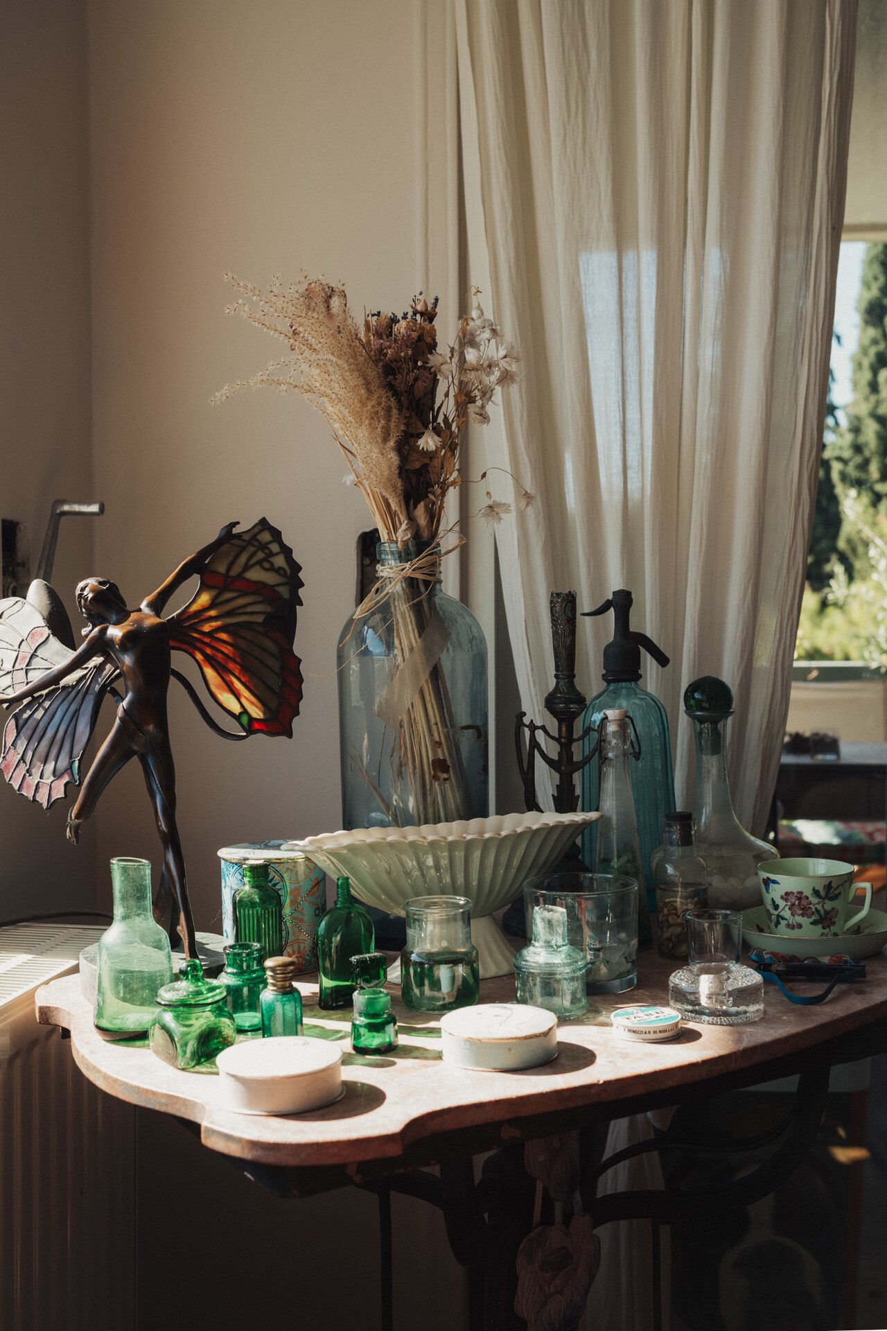 «Τα έχεις μετρήσει;», τη ρωτάω. «Όχι, δεν μετράω ποτέ τίποτα», απαντάει αφοπλιστικά και με χιούμορ. «Τους άλλους θησαυρούς πώς τους απέκτησες;». «Πηγαίνοντας στα παζάρια, στις ανοιχτές αγορές, στις αντικερί για τα μπουκάλια, ανακάλυπτα και άλλα πράγματα. Εμπιστεύομαι αυτό που πιάνει το μάτι μου», λέει.