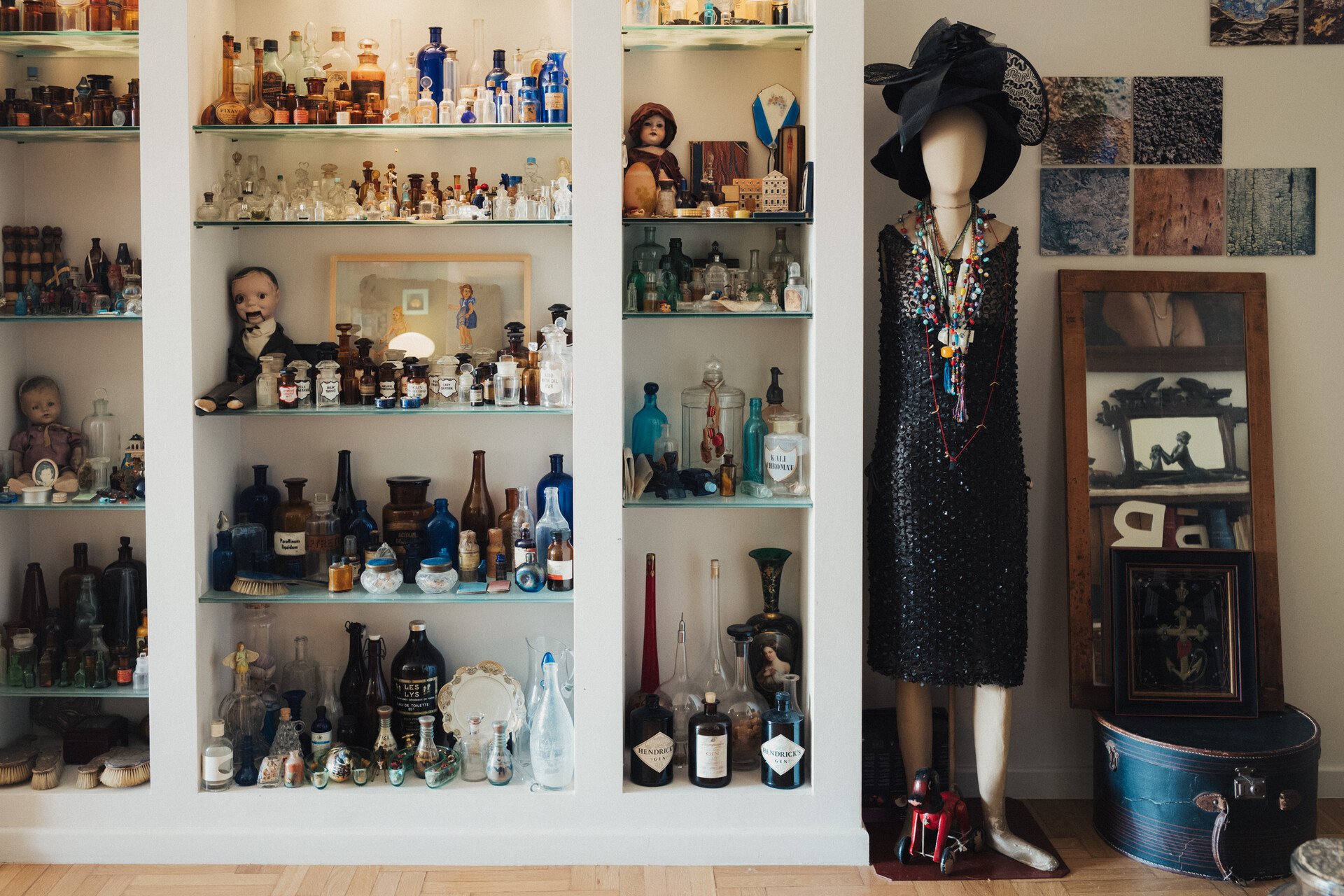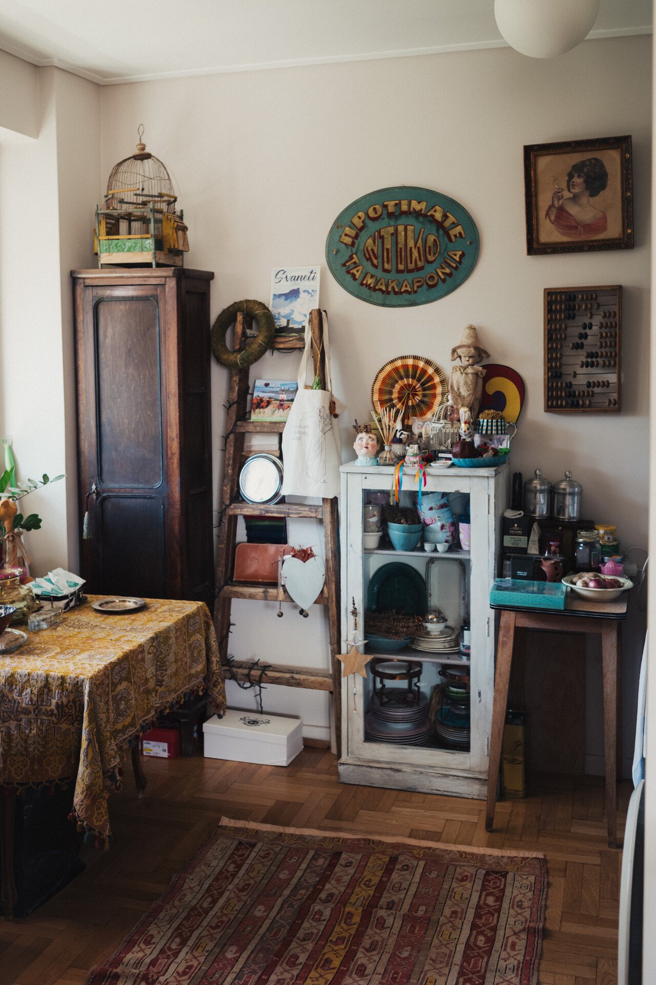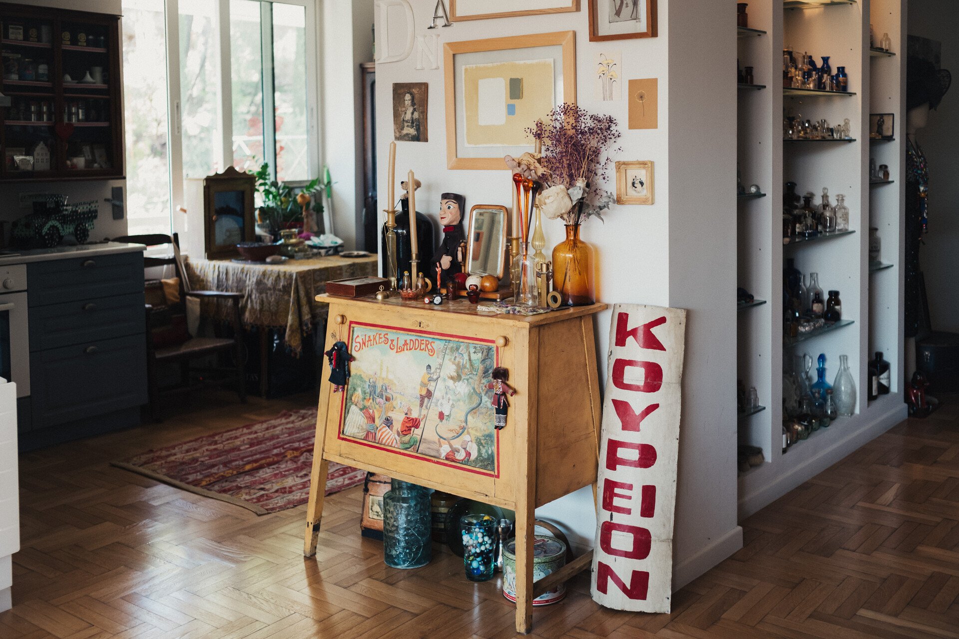 Το διαμέρισμα όμως δεν μας εντυπωσιάζει μόνο για την προνομιακή του θέση, αλλά και γιατί μοιάζει με μια χρονοκάψουλα που μας μεταφέρει σε ένα τρυφερό χθες. Είναι ένα σπίτι κυριολεκτικά γεμάτο από συλλογές αντικειμένων. Εδώ βρίσκεις ό,τι μπορείς να φανταστείς. Υπάρχει τόσο πολλή πληροφορία που νιώθω σαν την Αλίκη μόλις προσγειώθηκε στη Χώρα των Θαυμάτων.