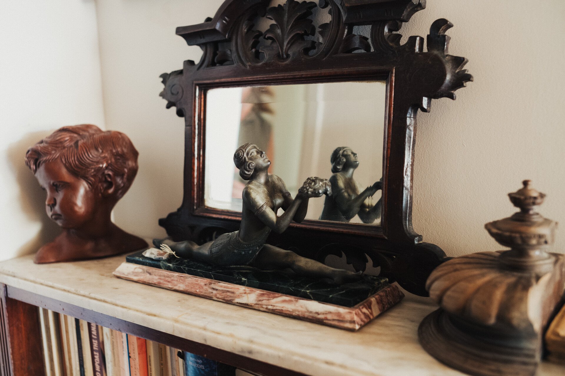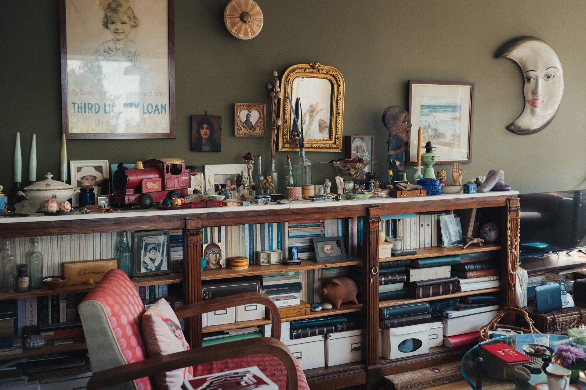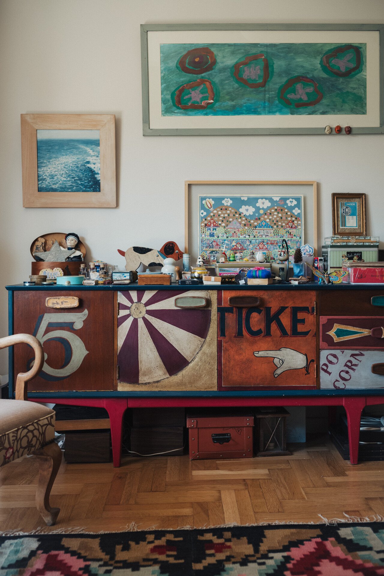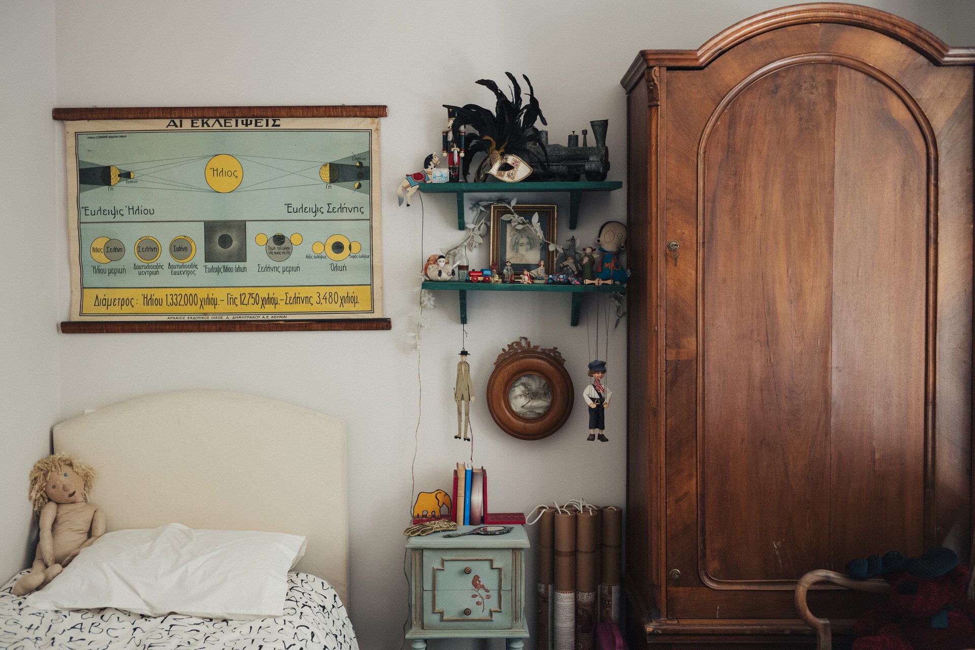Το διαμέρισμα όμως δεν μας εντυπωσιάζει μόνο για την προνομιακή του θέση, αλλά και γιατί μοιάζει με μια χρονοκάψουλα που μας μεταφέρει σε ένα τρυφερό χθες. Είναι ένα σπίτι κυριολεκτικά γεμάτο από συλλογές αντικειμένων. Εδώ βρίσκεις ό,τι μπορείς να φανταστείς. Υπάρχει τόσο πολλή πληροφορία που νιώθω σαν την Αλίκη μόλις προσγειώθηκε στη Χώρα των Θαυμάτων.