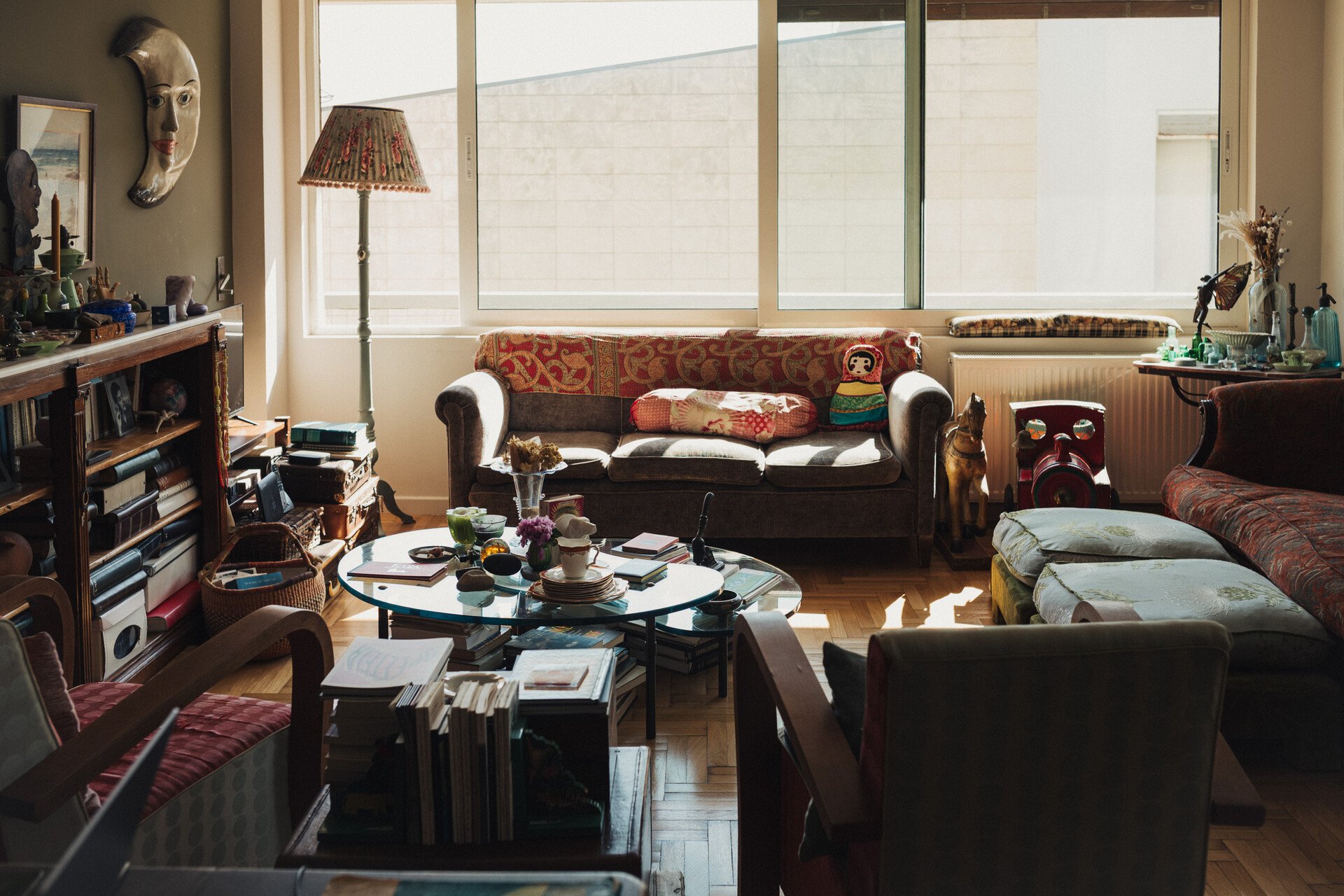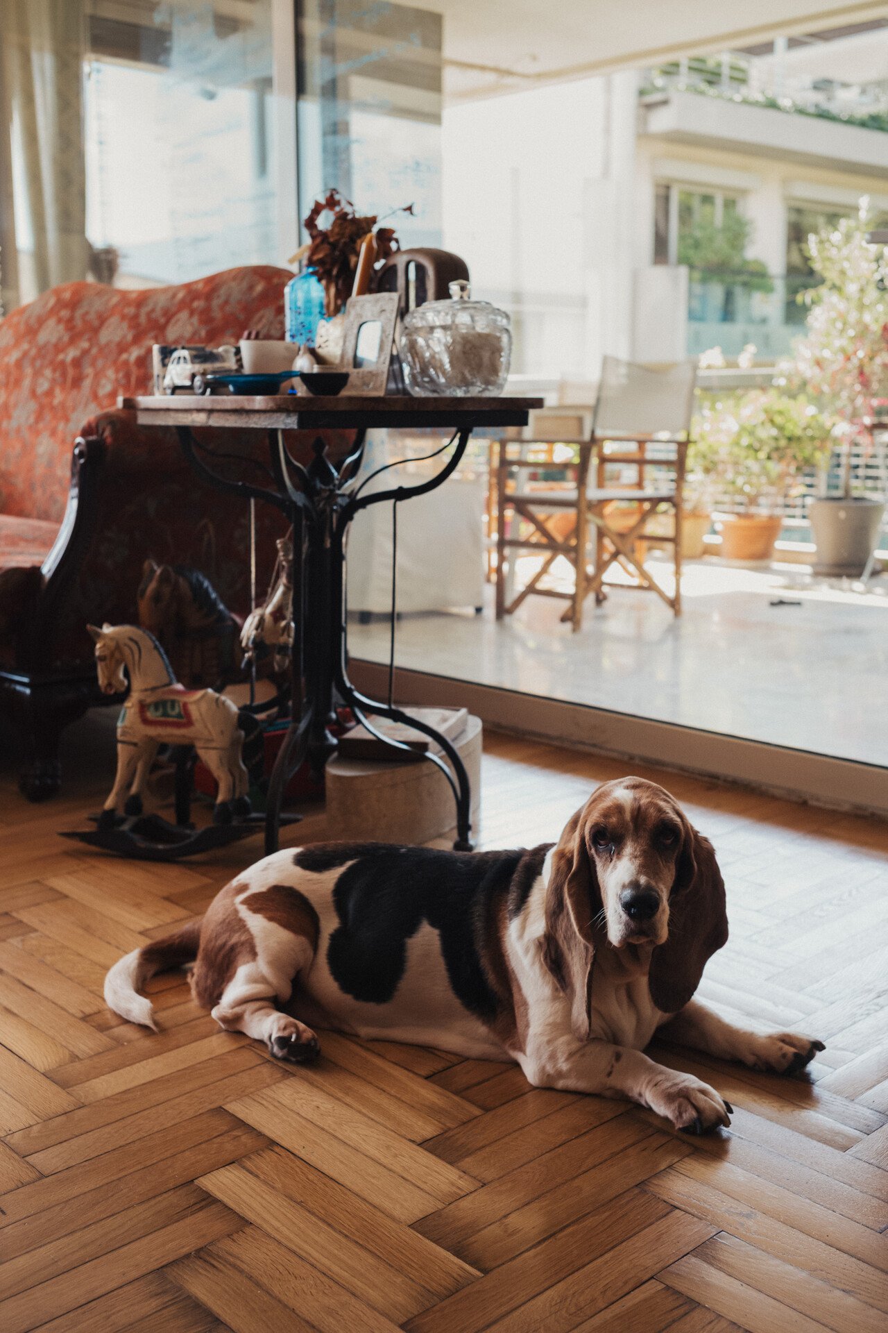 Τις art deco πολυθρόνες τις βρήκε πεταμένες στον δρόμο. «Έβαλα ένα ωραίο πουά ύφασμα και αμέσως απέκτησαν έναν ανάλαφρο χαρακτήρα. Βέβαια, το ύφασμα το έχουν διαλύσει τα σκυλιά», εξηγεί, αλλά δεν μπορεί να φανταστεί τη ζωή της χωρίς ζώα. Τη ζωή τη μετράει με βάση το ποιον σκύλο είχε και πότε. Της λέω ότι κάνω ακριβώς το ίδιο και χαμογελάμε συνωμοτικά. Ο καναπές που είναι απέναντί μου είναι από το πατρικό της. «Είναι εξήντα πέντε χρονών!», αναφωνεί, σαν να του κάνει κάθε χρόνο γενέθλια. Παλιά, θυμάται, ήταν ντυμένος με πράσινο βελούδο· άλλαξε το ύφασμα και είναι ο καναπές στον οποίο κάθεται πλέον περισσότερο, αφού εδώ κάνει και τις ψυχοθεραπευτικές της συνεδρίες.
