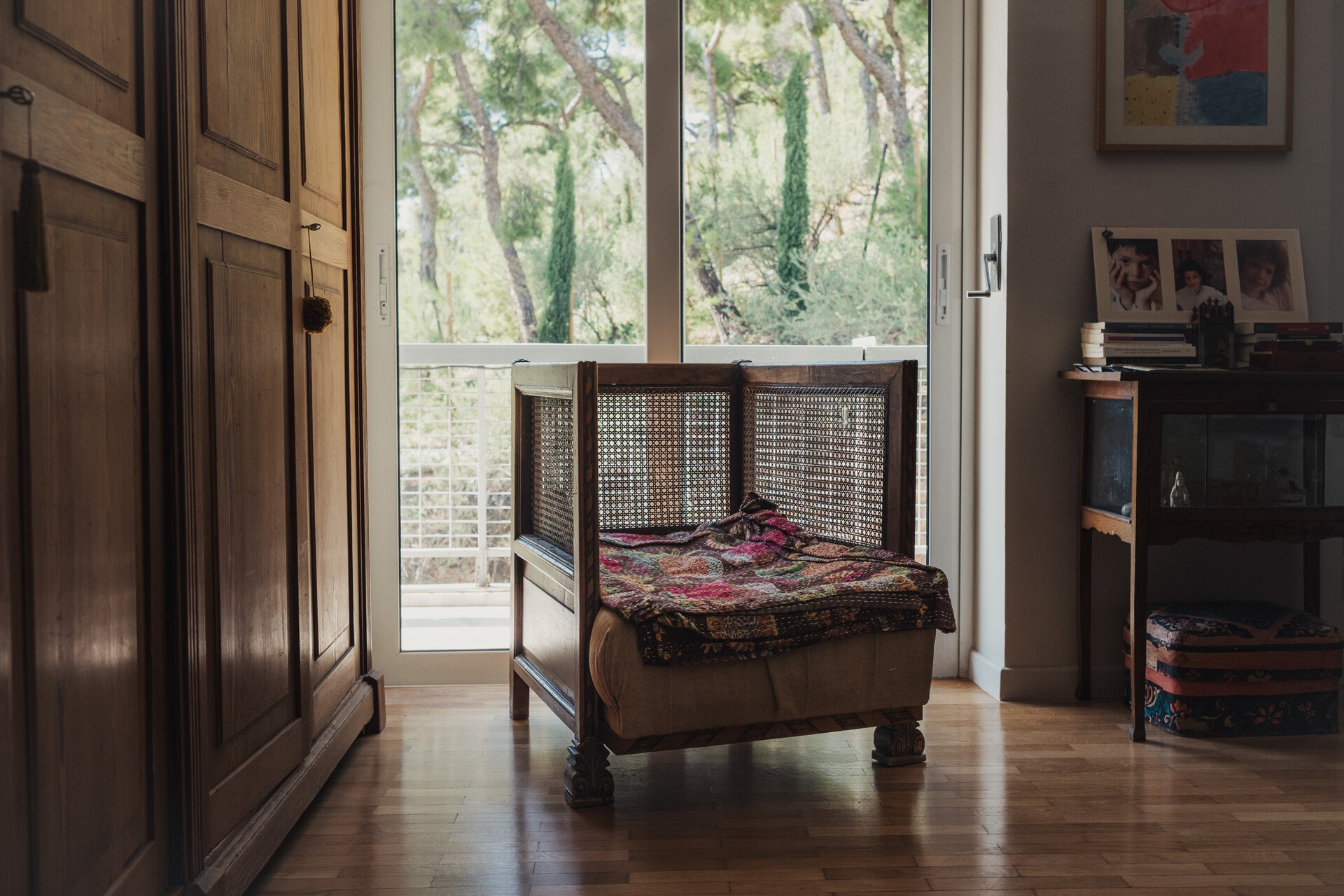 Παρατηρώ ένα-ένα τα καλόγουστα έπιπλα. Μου λέει ότι είναι συνδεδεμένα με αναμνήσεις. «Θυμάμαι για το καθένα το συναίσθημα που μου προκάλεσε τη στιγμή που το πρωτοείδα. Αυτά τα έπιπλα είναι η διαδρομή μου στον χρόνο», λέει. Της ζητάω να μου μιλήσει για τον καναπέ της, που είναι αντίκα. Της τον έδωσε μια φίλη όταν έκλεισε την επιχείρησή της. «Είναι πολύ παλιός, βικτοριανού στυλ, και το ύφασμά του είναι κι αυτό πολύ παλιό. «Μου αρέσει τόσο πολύ αυτό το ύφασμα με τους πελαργούς», σχολιάζει και συμφωνώ. Τον έχει ταιριάξει με κάτι ωραία σκαμπό που τα μαξιλάρια τους τα είχε αποκτήσει τριάντα χρόνια πριν και είναι σαν να περίμεναν αυτόν τον καναπέ.