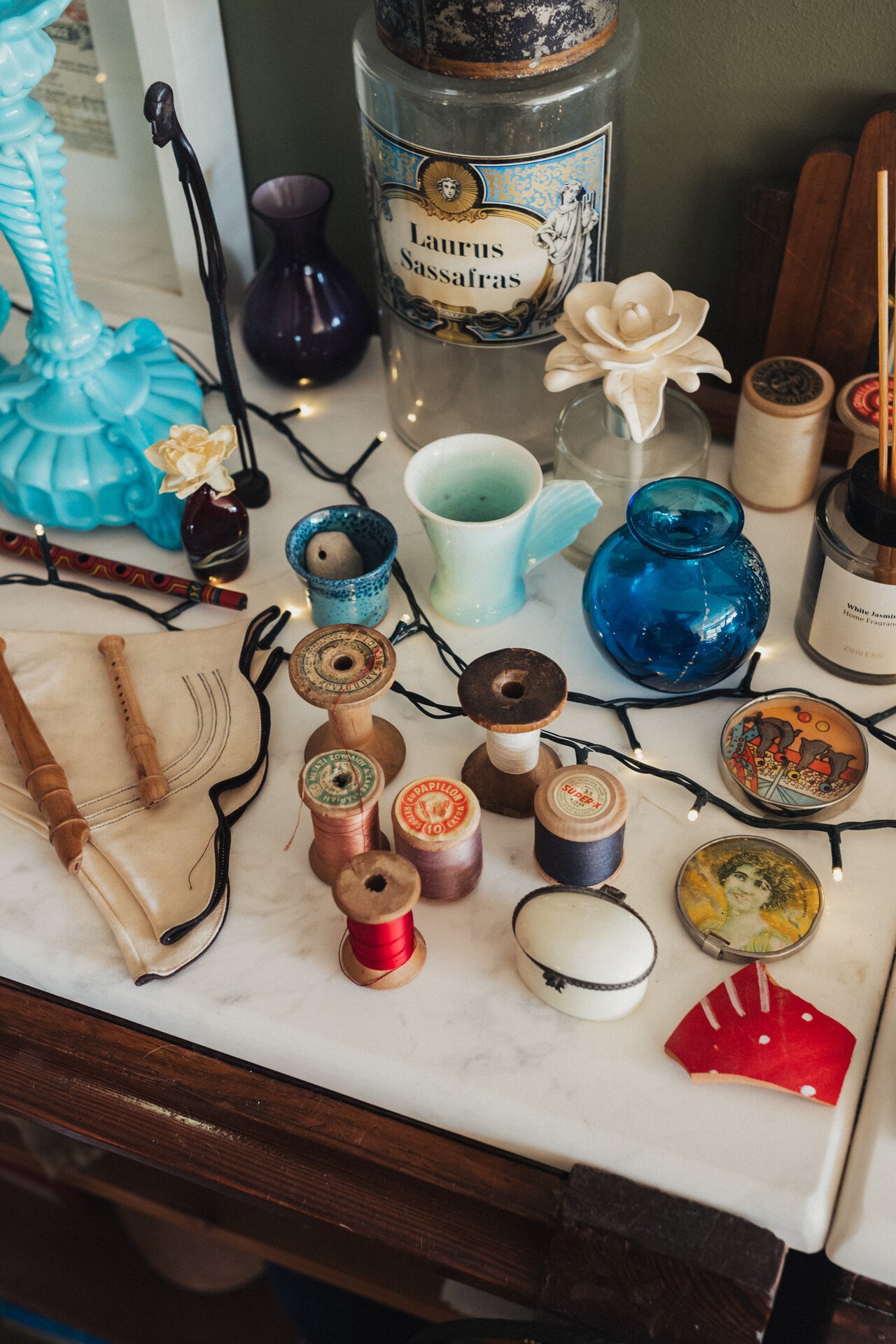 «Τι είναι λοιπόν για σένα όλα αυτά τα μπουκαλάκια;» τη ρωτάω, μιας και μου έδωσε την καλύτερη πάσα. «Είναι προφανές ότι συλλέγω πράγματα. Είμαι μοναχοπαίδι και οι συλλογές είναι η παρέα των μοναχοπαιδιών. Είχα έναν πατέρα επίσης συλλέκτη και μέρος της σχέσης μας ήταν να πηγαίνουμε κάθε Κυριακή στο Μοναστηράκι. Εκείνος μάζευε πιο καλά πράγματα. Αντίκες, βάζα, πίνακες. Εγώ έγινα σταδιακά συλλέκτρια των ευτελών πραγμάτων». «Των ευτελών;», εκπλήσσομαι γιατί στα μάτια μου όλα μοιάζουν πολύτιμα. «Αυτό που με συγκινεί σε κάθε πράγμα είναι να βλέπω από πίσω τον κόπο και το μεράκι που έβαλε το ανθρώπινο χέρι», λέει.