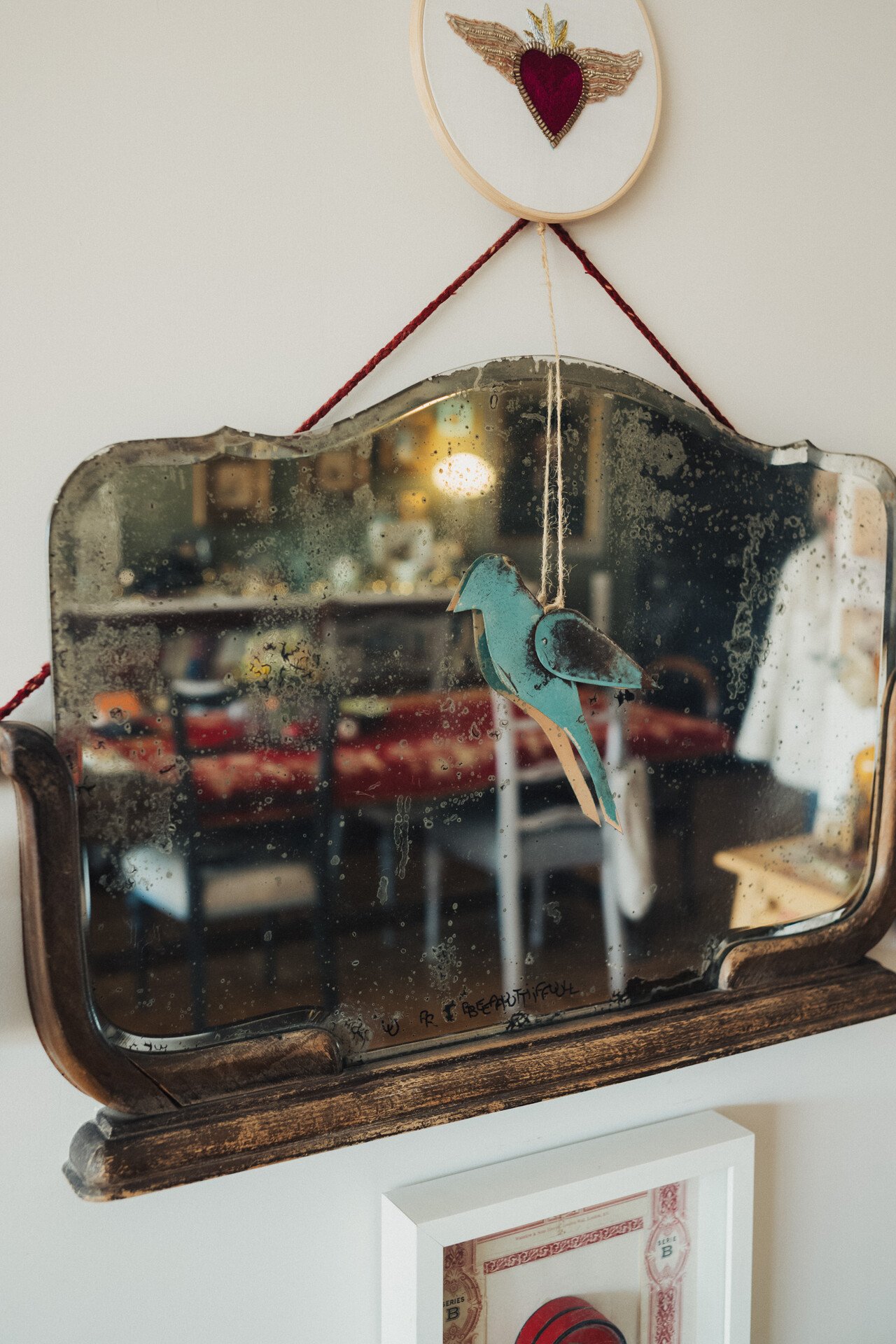 Άραγε, ξεχωρίζει κάποια άλλη από τις συλλογές της; Σκέφτεται λίγο και μου απαντάει ότι τη συγκινούν οι κουβαρίστρες. «Οι παλιές, οι ξύλινες, γιατί πέρα απ’ την ομορφιά που έχει το ξύλο έτσι όπως είναι σμιλεμένο, σου λένε μια ιστορία. Μπορείς δηλαδή να φανταστείς εκείνη την κυρία που έβαζε μέσα στις κάλτσες ένα ξύλινο αυγό για να τις μαντάρει. Αυτές τις εικόνες αγαπώ», μου λέει. Εγώ πάλι νιώθω ότι έχω φέρει τον δωδεκάχρονο εαυτό μου σε ένα σπίτι γεμάτο μαγεία και κανονικά, αν ήμουν εντελώς αυθόρμητη, θα τσίριζα από χαρά. Τη ρωτάω αν κατά καιρούς συλλέγει άλλα πράγματα, αν έχει τις εμμονές της. Κουνάει το κεφάλι καταφατικά. Αυτό το διάστημα έχει κολλήσει με κεντήματα θρησκευτικού χαρακτήρα, αλλά με κάποια που είναι κάπως κακότεχνα, μπορεί και ανορθόγραφα. Μου δείχνει με καμάρι ένα πολύ όμορφο καδραρισμένο κέντημα που γράφει «πήστις», με ήτα. «Δεν είναι υπέροχο;», ρωτάει. Το βρήκε στα σκουπίδια μια μέρα που έβρεχε. Εγώ πάλι σκέφτομαι ότι είμαι άτυχη γιατί στα σκουπίδια δεν βρίσκω ποτέ τίποτα της προκοπής.