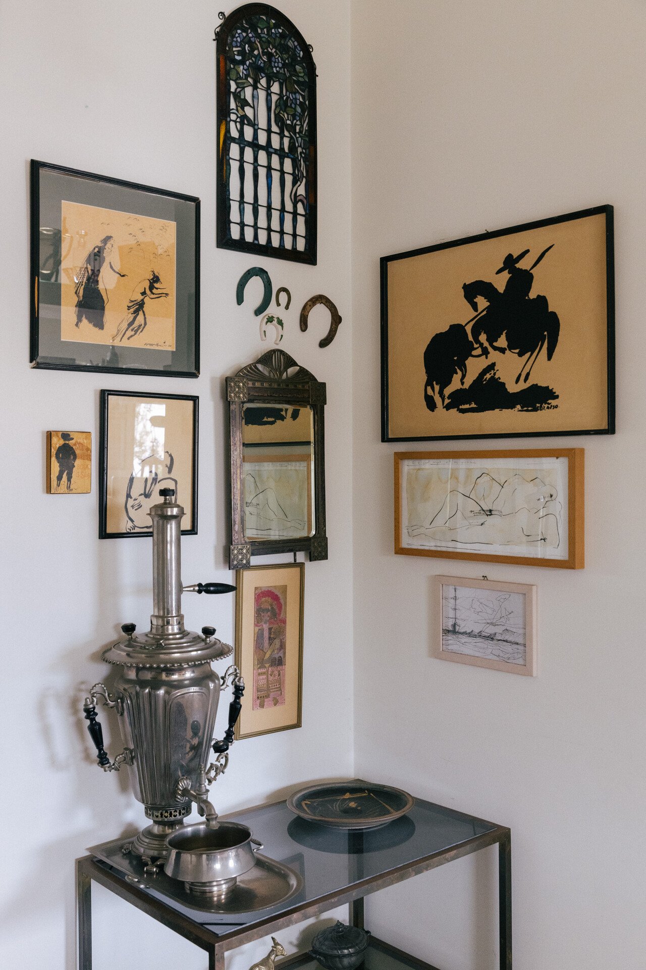 O Δον Κιχώτης είναι λιθογραφία του Πικάσο. «Αυτό ειναι ένα έργο που έφτιαξε ένας Χιλιανός καλλιτέχνης για τους γονείς μου, γιατί τους βρήκε πολύ ερωτευμένους», λέει, «κι αυτό είναι του Δημήτρη Καραΐσκου, που το έκανε σχεδόν χωρίς να σηκώσει το πενάκι του από το χαρτί».