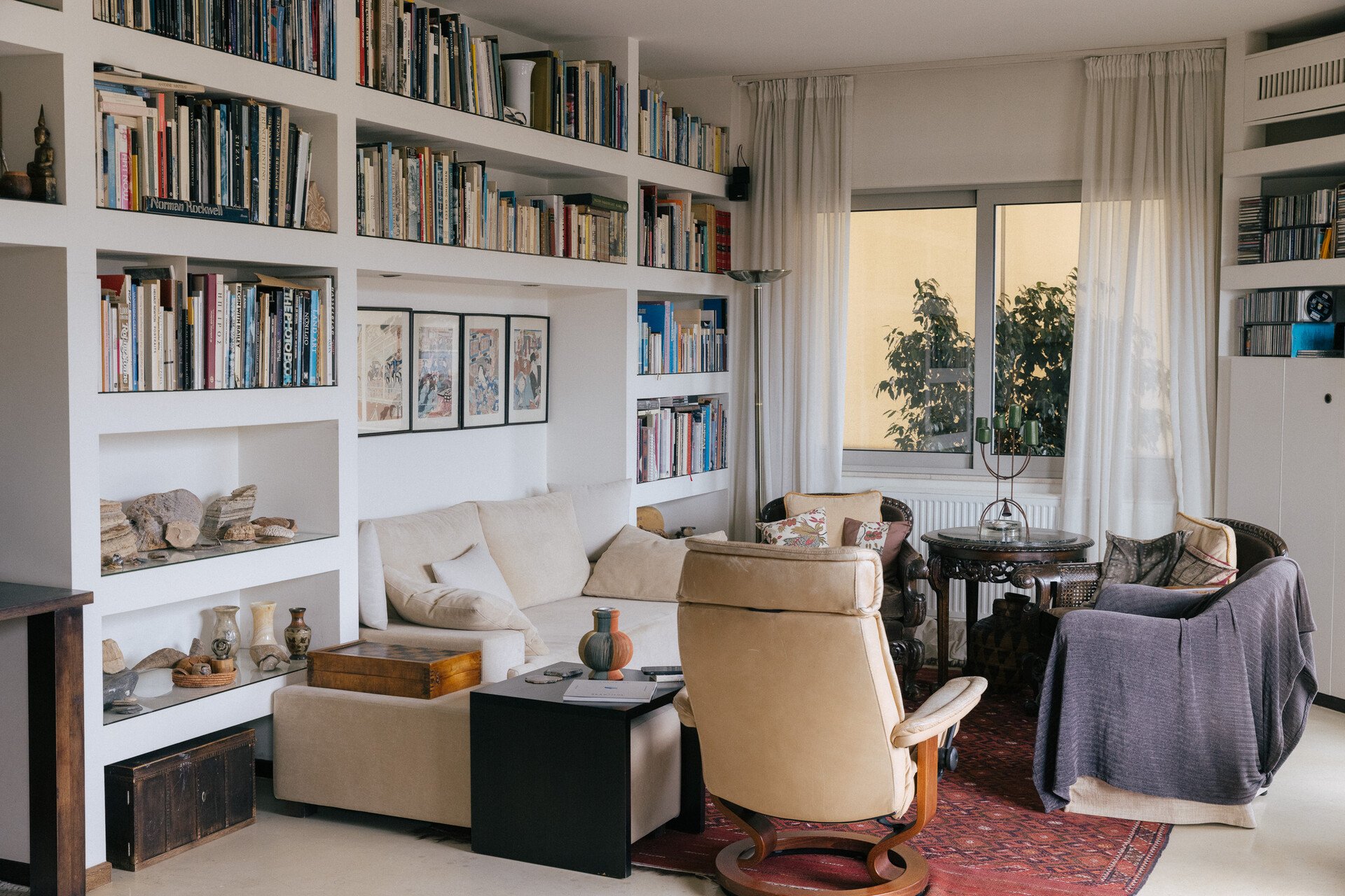 «Αυτό», μου λέει και δείχνει ένα ντελικάτο τραπεζάκι, «είναι αρ νουβό, της μαμάς μου». «Τι ωραία σουβέρ», παρατηρώ. «Αυτά τα σουβέρ ειναι της Ντένιας Παναγάκη από μάρμαρο Τήνου», εξηγεί. «Ο καναπές που κάθομαι τι είναι;» ρωτάω. Μου εξηγεί ότι φτιάχτηκε κατά παραγγελία με δικό της σχέδιο γιατί ήθελε τα συγκεκριμένα μέτρα, να χωράει στο άνοιγμα της βιβλιοθήκης και σε αυτές τις διαστάσεις. Παρατηρώ τα πολλά βιβλία που έχει. Μου λέει ότι έχει έρωτα με τα βιβλία. Με πηγαίνει στην κρεβατοκάμαρά της, που κι εκεί έχει μια βιβλιοθήκη· είναι σαν διαχωριστικό αλλά και σαν ένα πολύ ωραίο μπουντουάρ. Κλείνει την πόρτα και μου λέει ότι το υπνοδωμάτιο είναι μόνο για ύπνο και ξεκούραση, δεν περνά εκεί τις ώρες της.