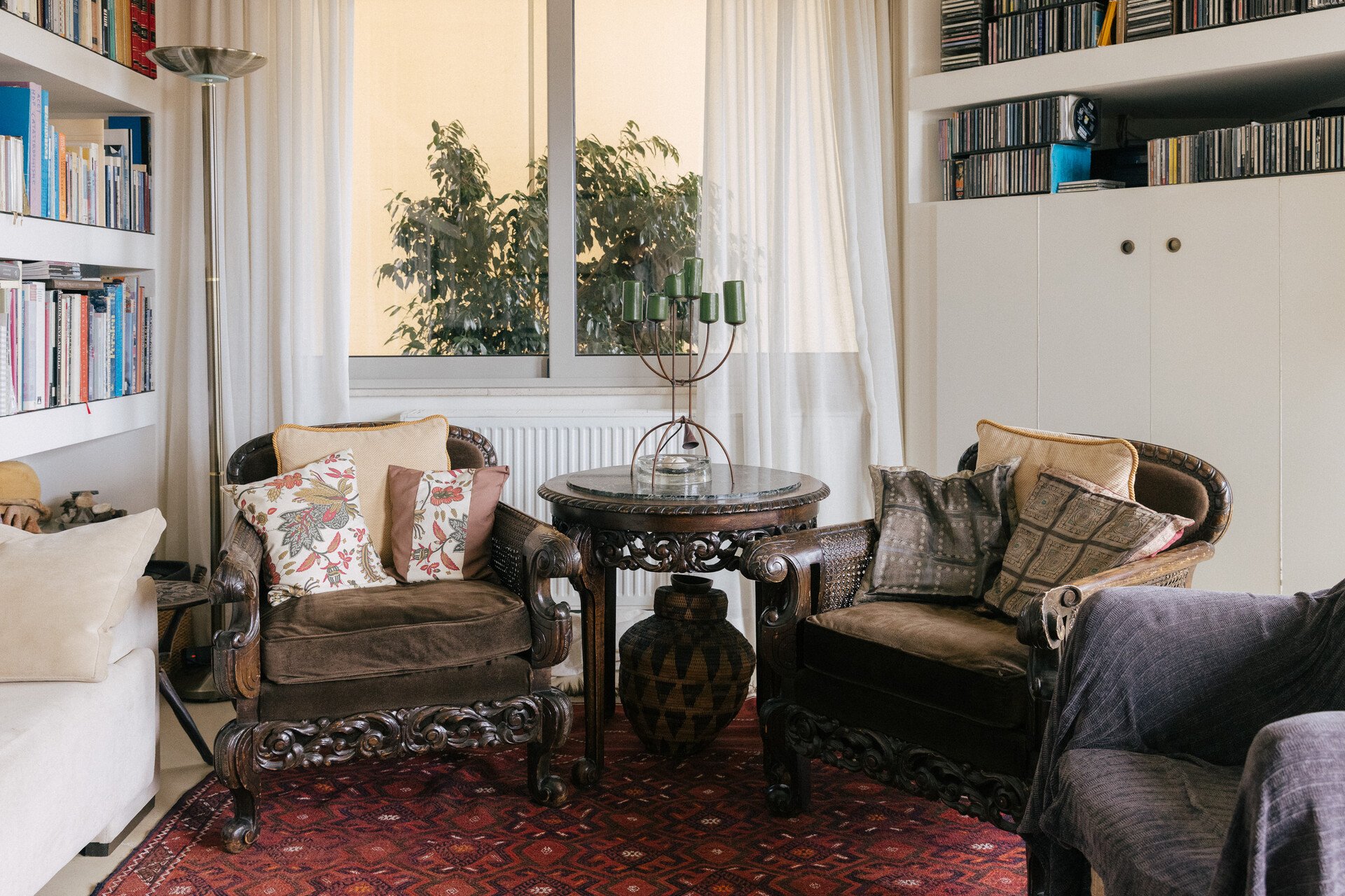 «Αυτή η πολυθρόνα είναι design;» ρωτάω. «Είναι, αλλά δεν θυμάμαι όνομα, είναι σκανδιναβικού design, από flea market στη Νορβηγία», εξηγεί .Την είχε αγοράσει πριν από πολλά χρόνια ο πατέρας της. «Του άρεσε πολύ να ψαχουλευει πράγματα και να ανακαλύπτει θησαυρούς», λέει. Την αγαπά πολύ γιατί είναι και εξαιρετικά βολική. «Κάτσε να δεις». Κάνω το τέστ και είναι πράγματικα σαν να σε αγκαλιάζει.