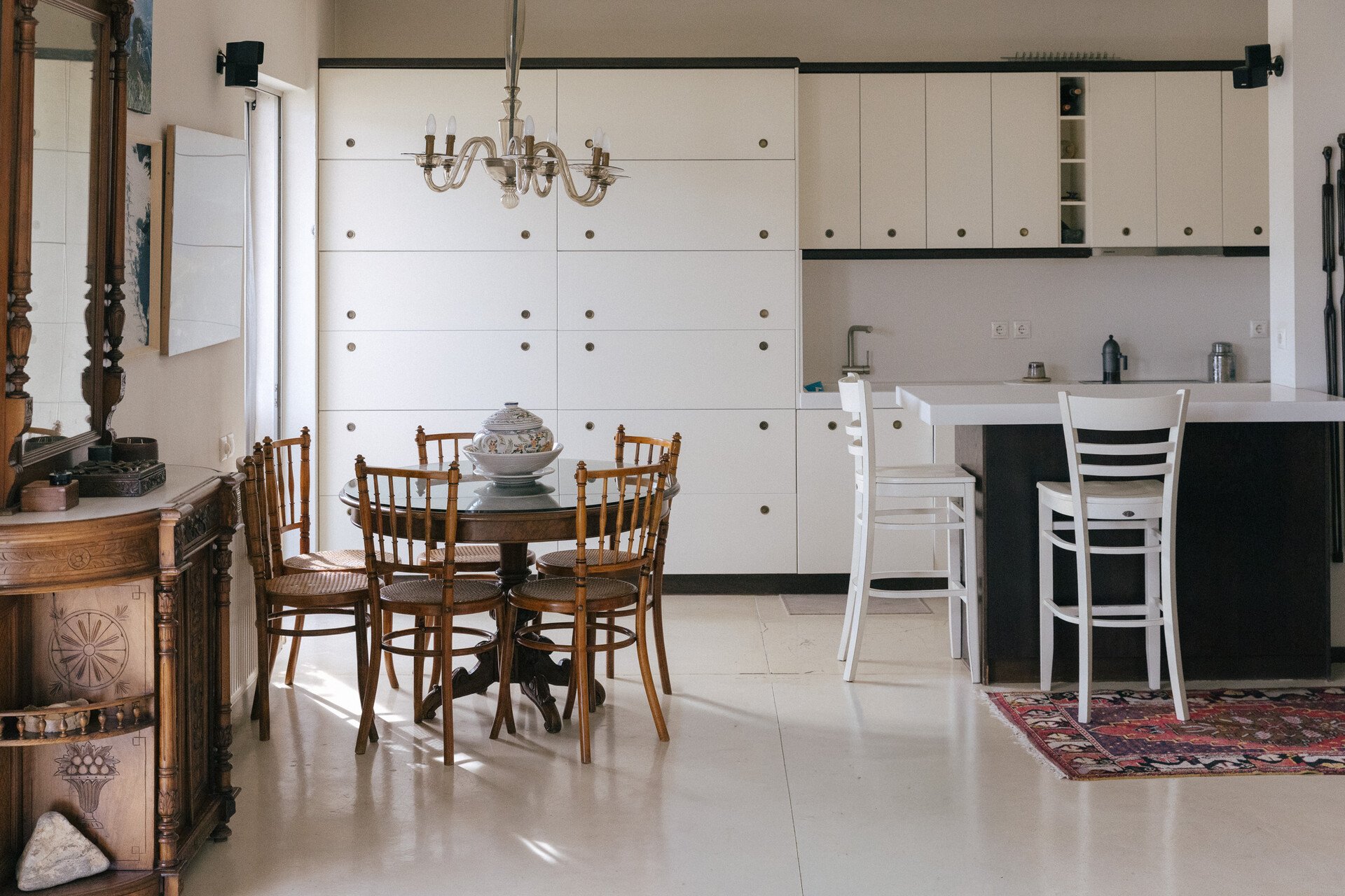 Έτσι δημιούργησε μια πιο μοντέρνα εκδοχή του σπιτιού. Τη ρωτάω για το πάτωμα που δένει πολύ όμορφα με τη μοντέρνα κουζίνα και τα ντουλάπια. Χρειάστηκε να αλλάξει όλες τις σωληνώσεις, οπότε έσπασε τα πατώματα. Αλλού ήταν πλακάκι, αλλού μάρμαρο, αλλά η ίδια ήθελε κάτι πιο χυτό, πιο ενιαίο και μοντέρνο. «Έτσι κάναμε αυτό το πάτωμα που λέγεται “κουρασανίτ”, που είναι άμμος και κόλλα, και βγήκε αυτό». Το κοιτά σαν να το παρατηρεί ξανά. «Ήταν καλή επιλογή. Μεγάλωσε ο χώρος», λέει. Εμένα πάλι μου αρέσει η λέξη κουρασανίτ. «Je suis kourasanit avec toi», της λέω και γελάμε.
