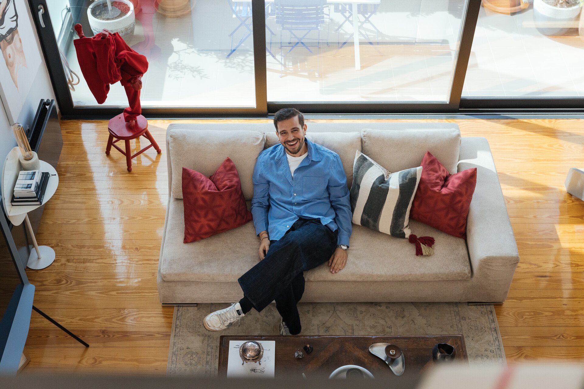 Η θέα απ’ το κρεβάτι του είναι υπέροχη. Σαν να μπαίνει όλο το αστικό τοπίο μέσα στο διαμέρισμα. «Θα είναι ωραία τη νύχτα», του λέω, «με τα φώτα της πόλης». «Βλέπεις μέχρι τον Πειραιά», παρατηρεί και μου δείχνει με το χέρι προς τα εκεί. Το κρεβάτι του είναι της εταιρείας Koimisoo. Το λατρεύει γιατί κάνει τέλειο ύπνο. «Θες να ξαπλώσεις να το δεις;» λέει, κι εγώ που δεν χάνω τέτοιες ευκαιρίες κάνω το τεστ και ενθουσιάζομαι. «Είναι σαν να πέφτεις σε σύννεφα», μονολογώ.