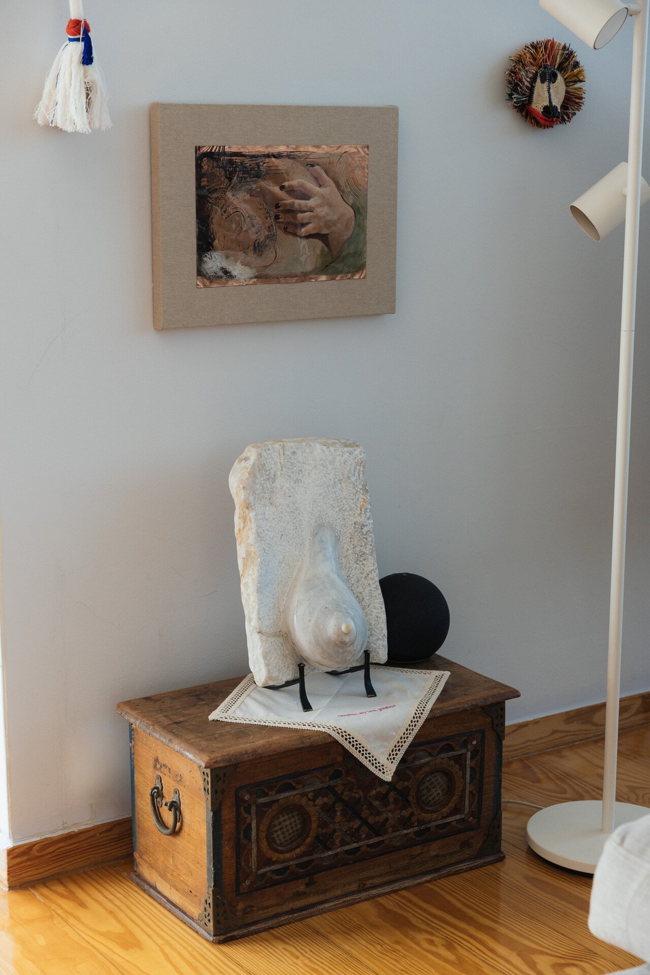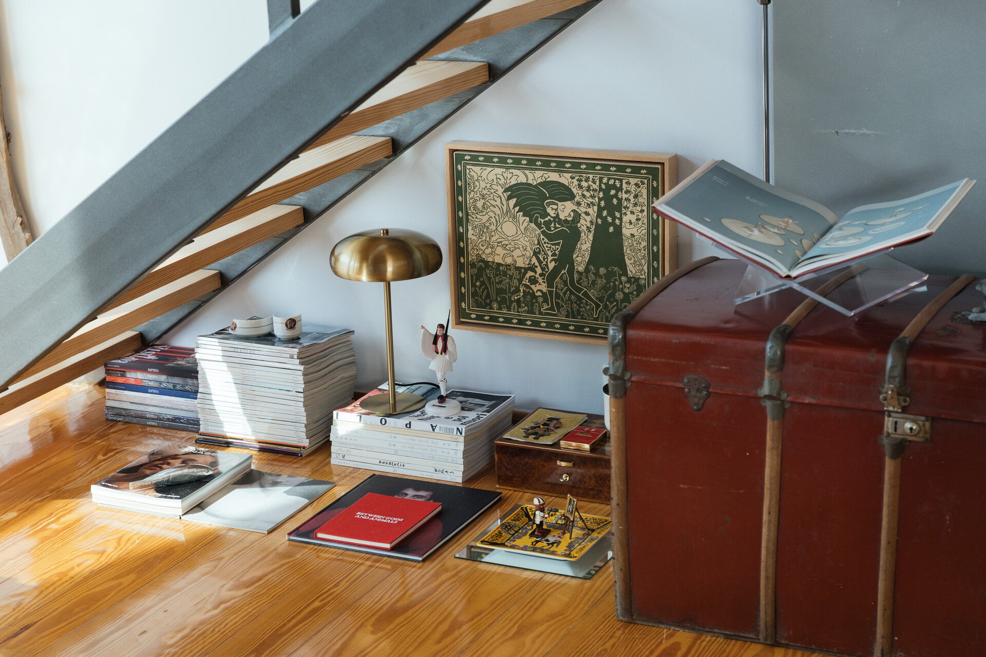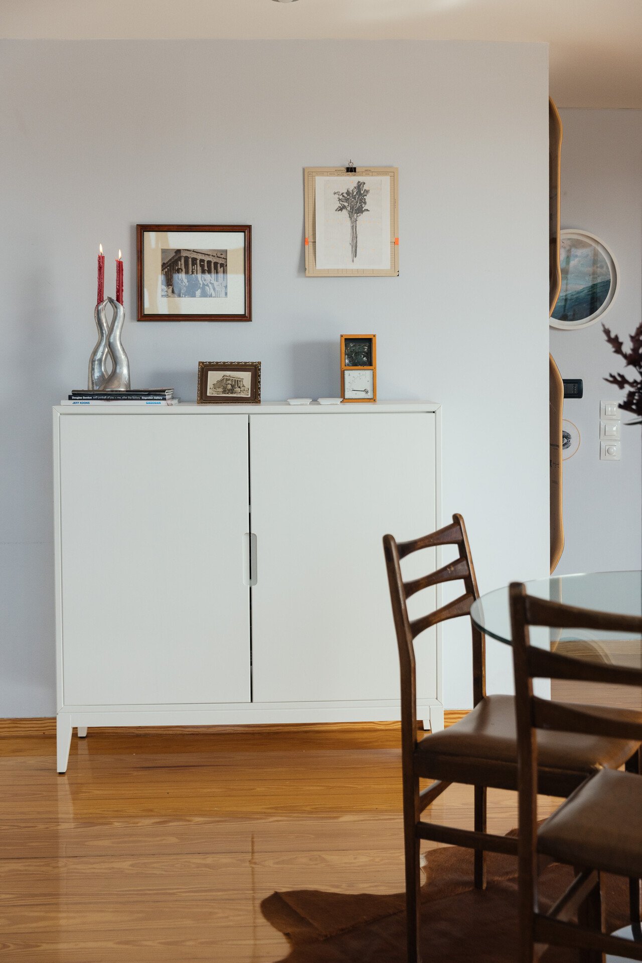 Το φωτιστικό το έχει φτιάξει ο ίδιος. Σ’ έναν τοίχο δίπλα στην τραπεζαρία έχει μια μεγάλη φωτογραφία με την προγιαγιά του και τον προπάππου του στην Ακρόπολη και από κάτω μια άλλη με τη μαμά του και τη θεία του. «Μ αρέσουν κάποια αντικείμενα με ρετρό αισθητική, αλλά μ’ αρέσει να έχω στον χώρο μου αντικείμενα και φωτογραφίες από ανθρώπους που αγαπώ». Το μάτι μου πέφτει σε δυο σπασμένα αντικείμενα που τα έχει τοποθετήσει με τάξη κάτω απ’ την σκάλα. Τα βρήκε στο πάτωμα σε ένα εγκαταλελειμμένο ξενοδοχείο Ξενία και είναι πράγματι σερβίτσια από το Ξενία των ’70s. «Και τα κρατάς ακόμα και σπασμένα;» «Ναι, δηλώνουν μεταφορικά την πτώση των Ξενία αλλά και το ράγισμα στον χρόνο» λέει ποιητικά.
