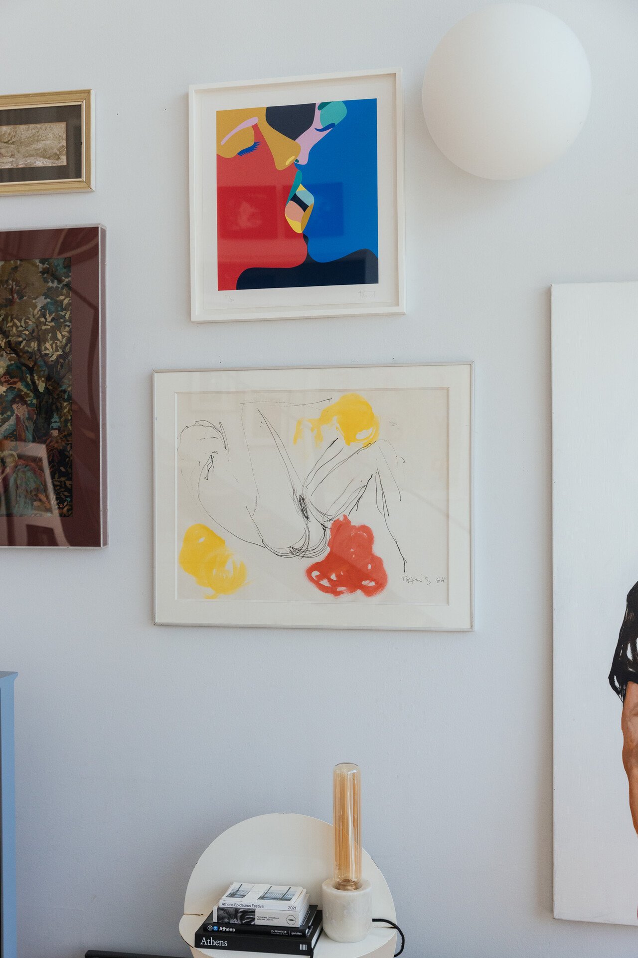 Το κόκκινο γλυπτό είναι το «Acrobat on Stool» του Λάππα. Μου δείχνει και ένα αγαπημένο έργο του Στρατή Ταυλαρίδη. Του ζητάω πληροφορίες για μια όμορφη γκραβούρα. Του την πούλησε ένας κύριος που έφτιαχνε κορνίζες στον Πειραιά και δεν θυμόταν καν την ιστορία της, όπως μου λέει. Το κέντημα ήταν της γιαγιάς του, σκέφτηκε να το βάλει σε κορνίζα από πλεξιγκλάς για να γίνει πιο μοντέρνο.