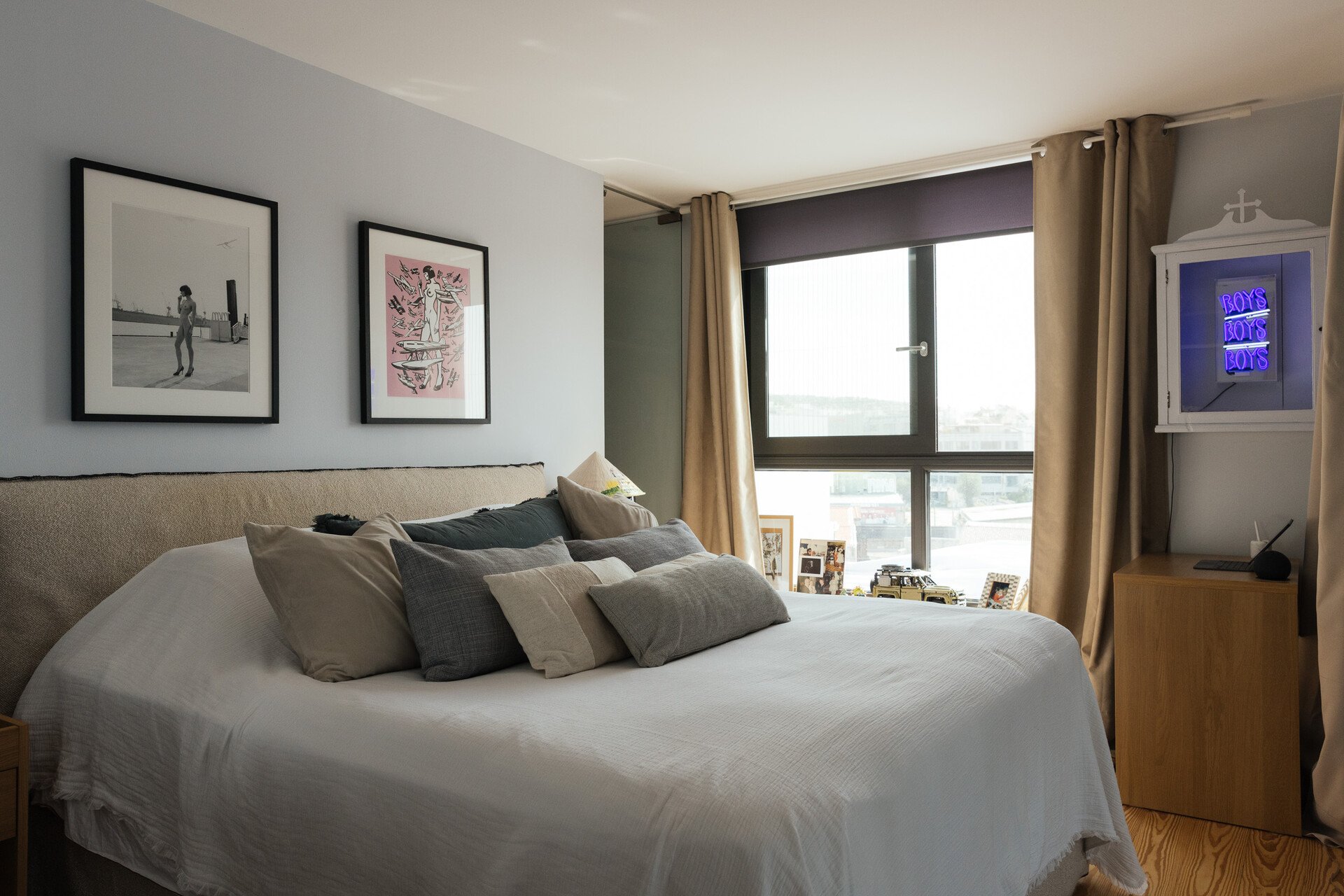 Η θέα απ’ το κρεβάτι του είναι υπέροχη. Σαν να μπαίνει όλο το αστικό τοπίο μέσα στο διαμέρισμα. Φωτ.: Πάρις Ταβιτιάν/ LIFO