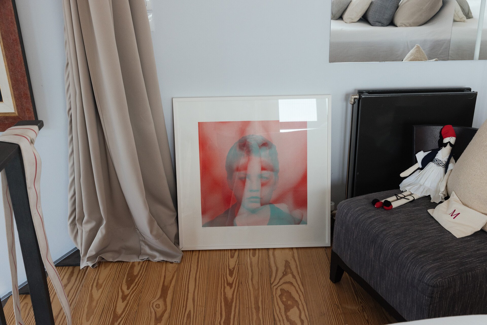 Το μάτι μου πέφτει σε μια φωτογραφία. Μαθαίνω ότι είναι limited edition του Mike Ruiz. «Tην πήρα σε δημοπρασία», θυμάται. Πιο ψηλά στέκει αγέρωχο ένα έργο του Σακαγιάν και δίπλα δυο έργα της Ελένης Βακιρτζή, που είναι φίλη της μητέρας του.