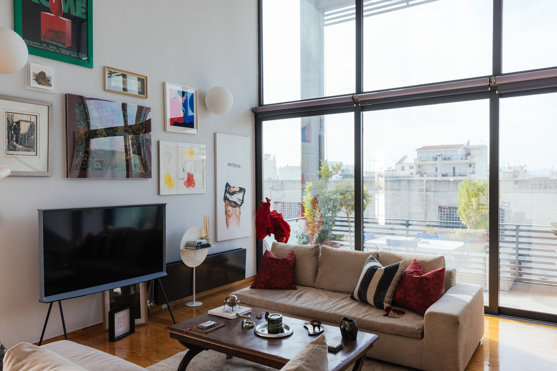 To σπίτι του Mιχάλη Στρατή ή Μάικ, όπως τον φωνάζουν οι φίλοι, είναι σε μια πολύ μοντέρνα πολυκατοικία στο Γκάζι. Το πρώτο πράγμα που αντικρίζω στην εξώπορτα είναι το αστραφτερό χαμόγελο του Μάικ που με περιμένει στο ασανσέρ. Όλοι οι άνθρωποι χαμογελούν, αλλά το δικό του χαμόγελο είναι σαν φάρος σε μια αγχωμένη Δευτέρα. Το λιλιπούτειο loft του είναι φωτεινό και χαρούμενο κι αυτό. Μόλις εξήντα τετραγωνικά, αλλά η έξυπνη διαρρύθμιση το κάνει να μοιάζει κατά πολύ μεγαλύτερο. Είναι ψηλοτάβανο, πολύ φωτεινό και μου δίνει μια αίσθηση τάξης και ευφορίας.