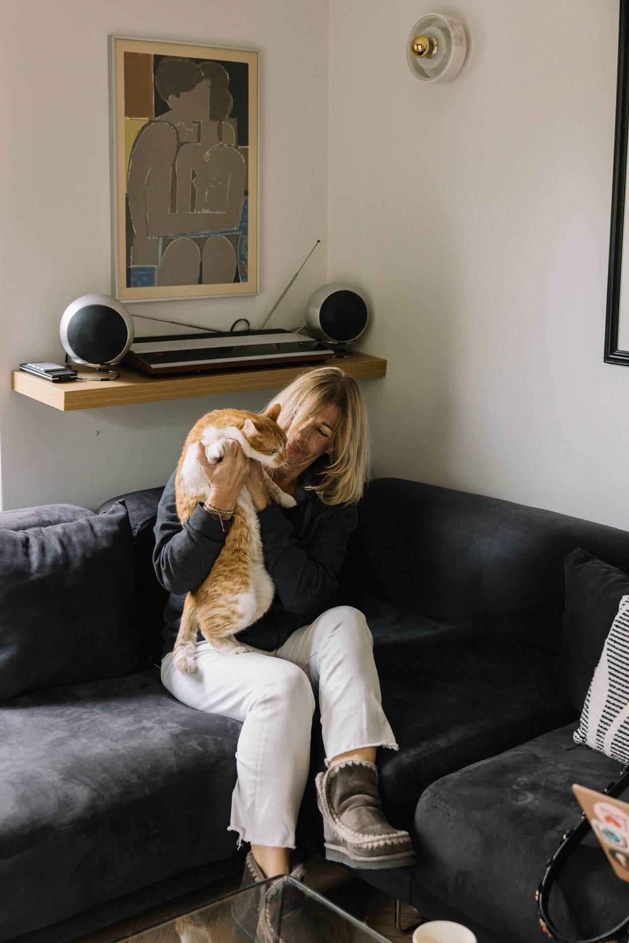 Οι καναπέδες, μου λέει, είναι ΙΚΕΑ και σχεδόν δικαιολογείται: «Έχουμε πέντε γάτες μέσα στο σπίτι και οκτώ στον κήπο. Είναι ουτοπικό να πιστεύουμε ότι θα τα βγάλει πέρα οποιοδήποτε ύφασμα». Μου δείχνει μια καρέκλα αντίκα σε στυλ Λουδοβίκου την οποία έντυσε με ένα ανθεκτικό ύφασμα σουέτ που το προτείνουν για γάτες και πάλι κάποιο γατί κατάφερε και το έσκισε. Έχει πάρει απόφαση ότι θα είναι φθαρμένα τα έπιπλα και θα ζει με τρίχες. «Χαλάλι», αναφωνεί και ξέρω ότι το εννοεί γιατί γνωρίζω την αγάπη της για τα ζώα.