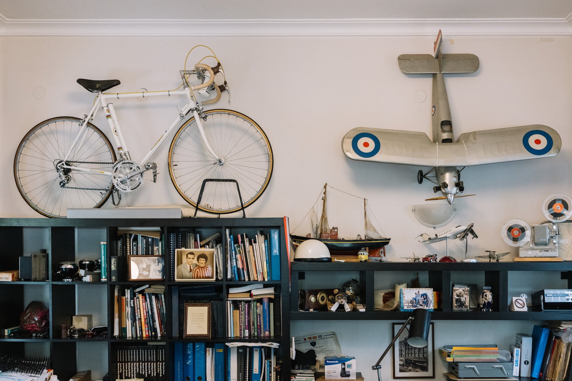 Στο γραφείο βλέπω κι άλλα «συναρμολογούμενα» που λειτουργούν διακοσμητικά. Ένα εντυπωσιακό πολεμικό αεροπλάνο στον τοίχο το είχε φτιάξει όταν ήταν δώδεκα χρονών. «Έκανα έξι μήνες να το φτιάξω», θυμάται. Μου δείχνει και κάτι τρενάκια που τα είχε φτιάξει και αυτά όταν ήταν παιδί. Η μπλούζα που έχει κορνιζάρει είναι από αγώνες με μηχανές στους οποίους έπαιρνε μέρος παλιά. Μου δείχνει την άλλη μηχανή. Είναι επίσης συλλεκτική BMW. Την έφτιαξε κι αυτή σχεδόν εξ ολοκλήρου. «Δεν τις βγάζεις πια στον δρόμο;» τον ρωτάω. Γελάει και μου απαντάει ότι πλέον «σπιτώθηκαν».