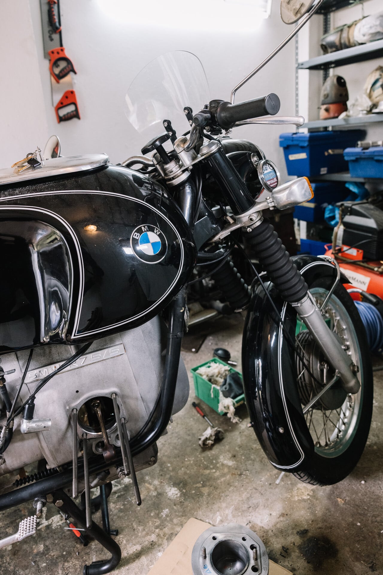 Όμως η πραγματική έκπληξη βρίσκεται στο εσωτερικό του. Δίπλα στο καθιστικό, μέσα στο γραφείο, υπάρχουν δυο συλλεκτικές μηχανές ΒMW. Ο Τάσος επισκευάζει παλιές μηχανές με πολύ μεράκι, και έχει πάει το χόμπι του σε άλλο επίπεδο. Το πρώτο πράγμα που ρωτάω λοιπόν είναι «τι είναι αυτές οι μηχανές και γιατί είναι “μουσειακά” τοποθετημένες εντός του σπιτιού;». Μαθαίνω ότι η μία είναι BMW του 1953. «Είναι πολύ σπάνια και αποτελείται από χίλια διακόσια πενήντα κομμάτια. Είναι μοντέλο R68 και R69, δηλαδή μεγάλης αξίας και σπανιότητας», λέει ο Τάσος. «Στην Ελλάδα ήρθε το 1974 και είχε ένα καλάθι στο πλάι. Την έφερε ένας Γερμανός και την πήρε μετά ένας βιοπαλαιστής από τον Ασπρόπυργο που κουβάλαγε με αυτήν ψάρια και δεν είχε ιδέα για την αξία της». «Δηλαδή πόσο κοστίζει μια τέτοια μηχανή;» ρωτάω αυθόρμητα. «Περίπου πενήντα με εξήντα χιλιάδες ευρώ», μου απαντάει και μένω εμβρόντητη. Του λέω ότι κι εγώ αν είχα μια μηχανή που κόστιζε εξήντα χιλιάδες ευρώ όχι μόνο θα την είχα μέσα στο σπίτι αλλά θα κοιμόμουν και μαζί της. Γελάμε. Μου εξηγεί ότι για εκείνον η πραγματική αξία είναι ότι την έφτιαξε σχεδόν από την αρχή. Κράτησε μόνο τον σκελετό, τον κινητήρα και τους τροχούς.