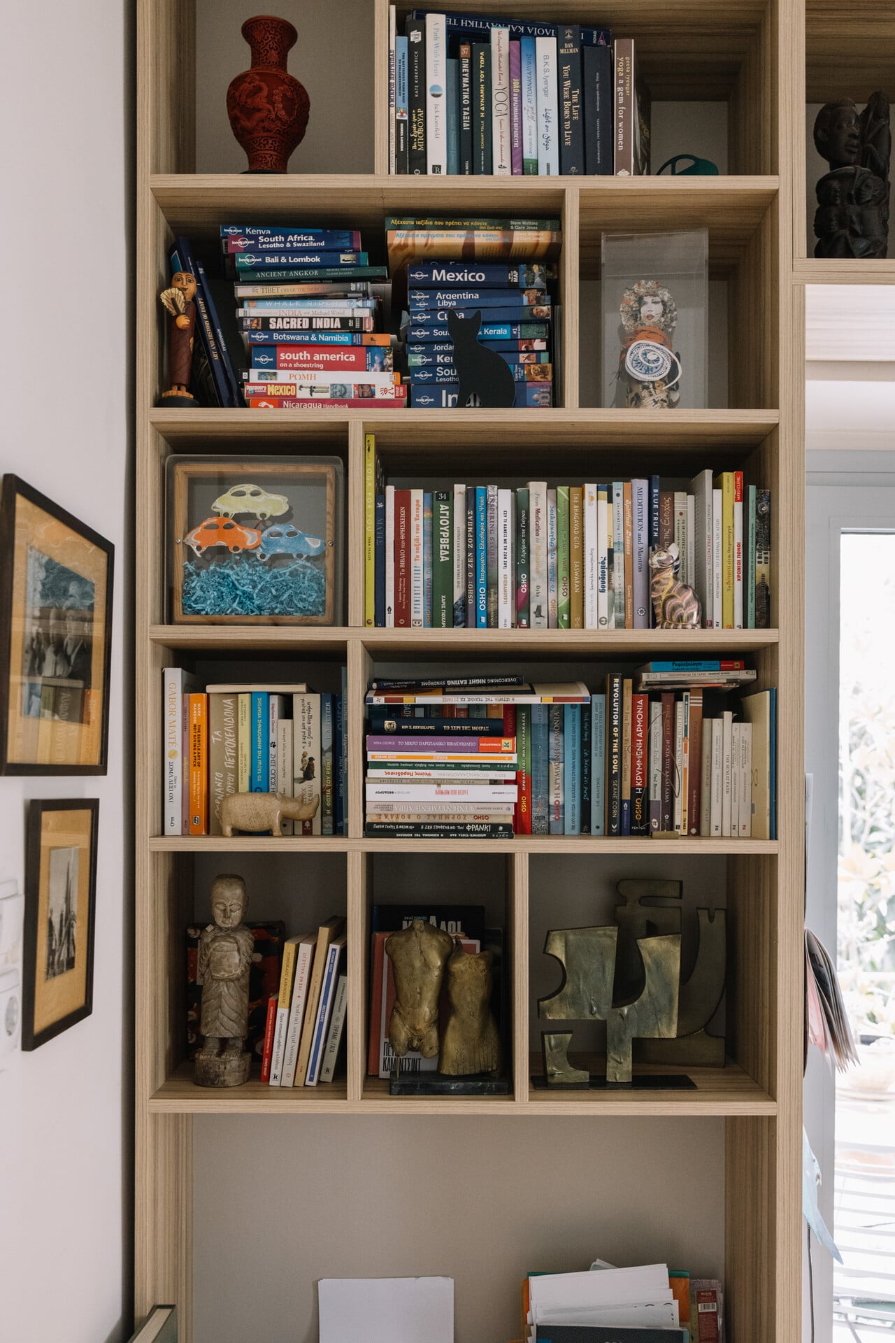 Το καθιστικό έχει κάτι το αγαπησιάρικο. Μια ωραία custom βιβλιοθήκη που έφτιαξε η αρχιτέκτονας Μαρία Κουτσουρίδου λειτουργεί και ως γραφείο της Αγνής. Ανάμεσα στα βιβλία ξεχωρίζουν διάφορα διακοσμητικά: ένα δέντρο του εικαστικού Παύλου Διονυσόπουλου, τρία μπρούντζινα της εικαστικού Φρόσως Μιχαλέα, ένα ξυλόγλυπτο ενός Κουβανού καλλιτέχνη, αγαλματίδια από την Αφρική, το ρολόι της γιαγιάς της Αγνής, ένα αεροπλανάκι του εικαστικού Διαμαντή Αϊδίνη, ένα θιβετιανό ευχολόγιο. Όλα αυτά μαζί είναι σαν ένα δικό της σύμπαν αναμνήσεων. Στους τοίχους, έργα του Σικελιώτη, του Μόραλη και ενός Ισπανού καλλιτέχνη που της έκανε δώρο ο κολλητός της.