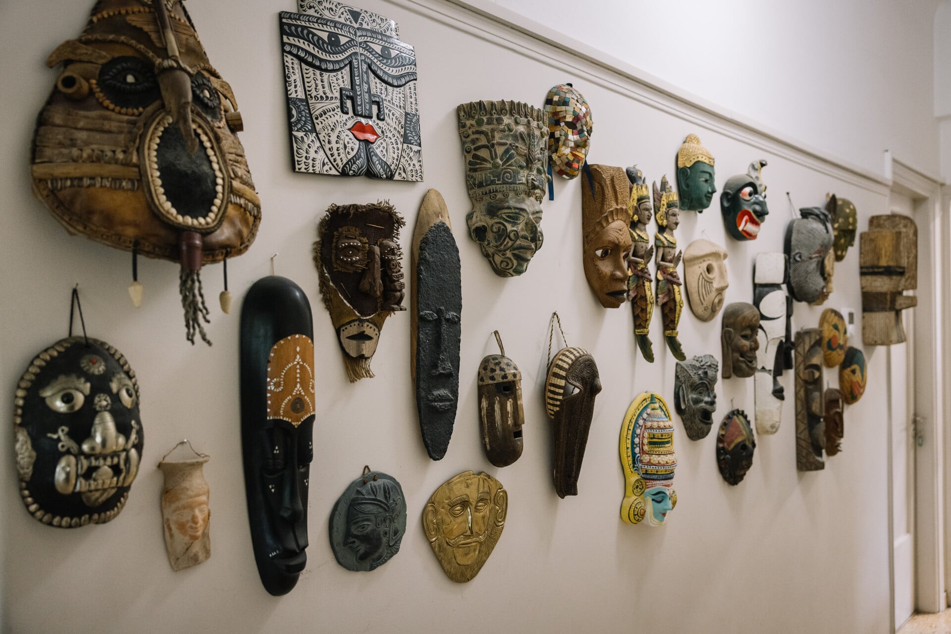 Στέκομαι στον διάδρομο που είναι γεμάτος μάσκες από τα ταξίδια τους. Η Αγνή απαριθμεί: Ναμίμπια, Βιετνάμ, Σενεγάλη, Αίγυπτος, Καμπότζη, Λάος, Σουαζιλάνδη, Νικαράγουα, Παναμάς, Βενετία, Θιβέτ, Σρι Λάνκα, Αργεντινή, Βραζιλία, Ταϊλάνδη, Μπαλί, Κόστα Ρίκα, Μεξικό, Ινδία. «Έχετε πάει σε όλα αυτά τα μέρη;» ρωτάω έκπληκτη. Γνέφουν καταφατικά. Η συλλογή ξεκίνησε με μια μάσκα από το Μπαλί, πλέον έχουν μία και από τους Ζουλού· γενικά πάντα παίρνουν μία σε κάθε ταξίδι.