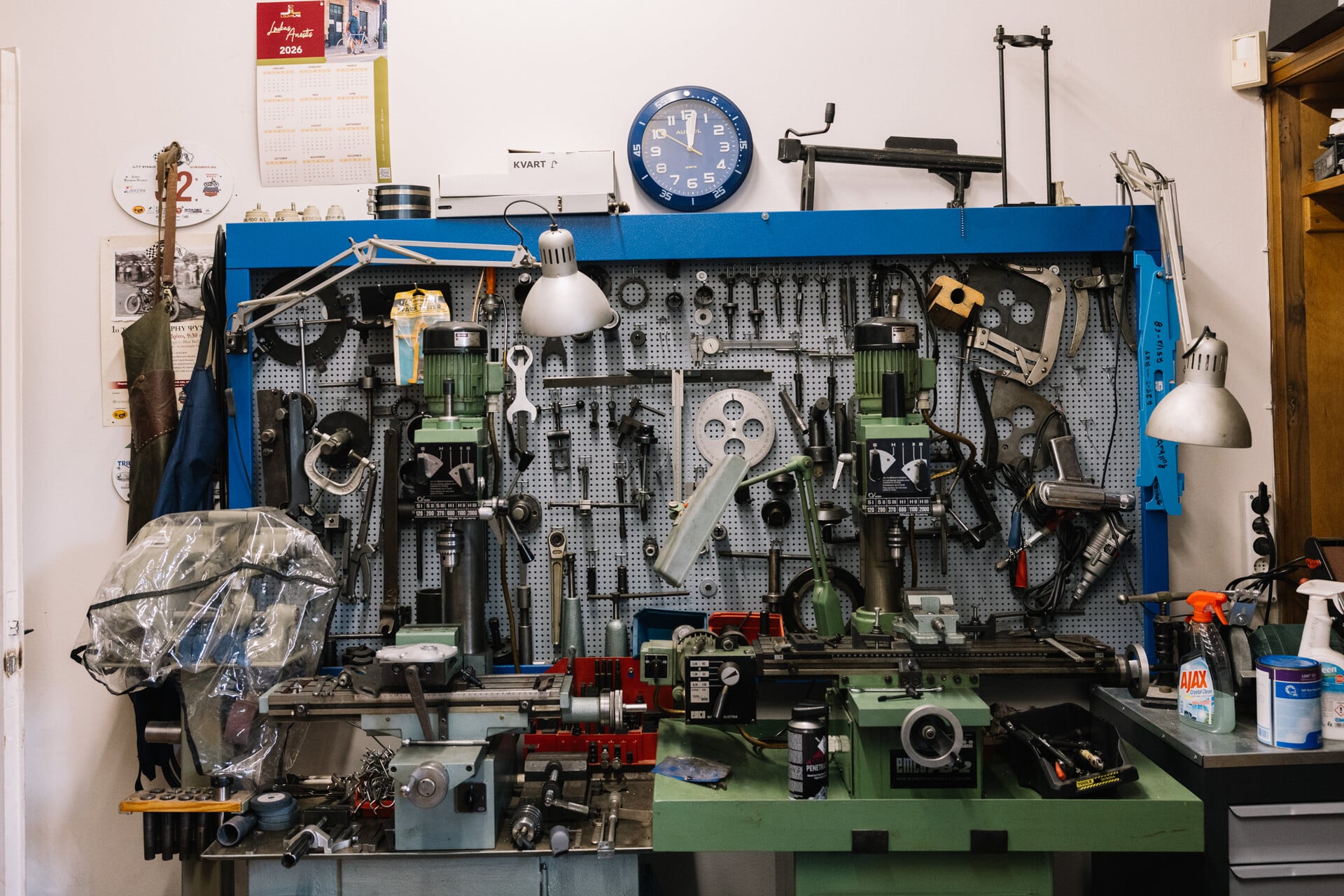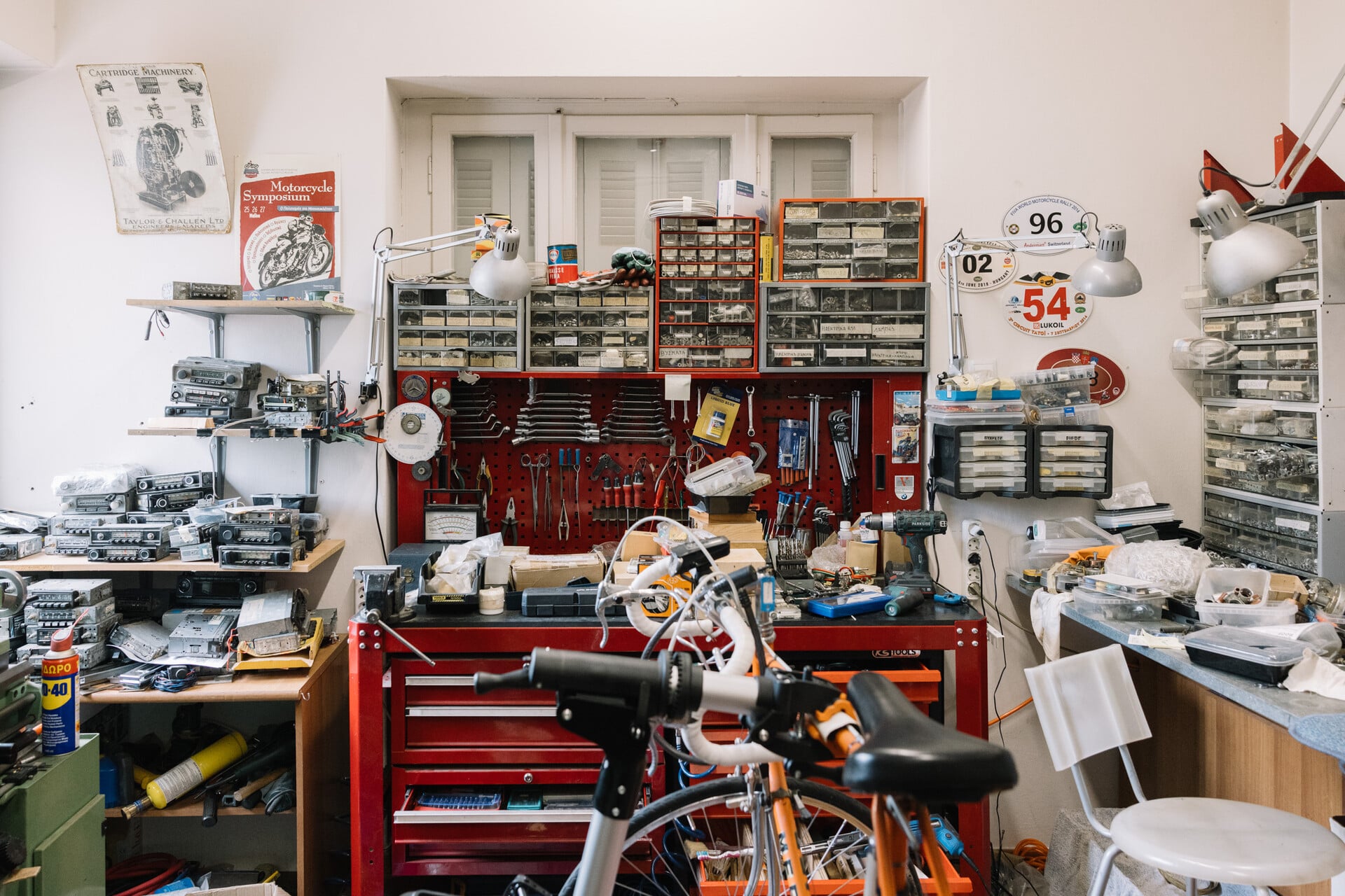 «Αυτά είναι εργαλεία της BMW από το 1950», λέει ο Τάσος. Έχει φρέζες, τόρνο, όλα αυστριακά, και μια συλλογή από παλιά ραδιόφωνα αυτοκινήτων, κυρίως της Μercedes. Έχει μεράκι να τα φτιάχνει. Του λέω ότι θαυμάζω την υπομονή του και ότι εγώ δεν έχω ούτε να στρίψω βίδα. Μου δείχνει και κάποια εργαλεία που ανήκαν στον στρατό της Αλγερίας και πήγε μέχρι εκεί για να τα πάρει. «Πώς και δεν έκανες το “συνεργείο” σου εκτός σπιτιού;» τον ρωτάω. «Γιατί ήθελα να μπορώ να δουλεύω ό,τι ώρα ήθελα, ακόμα και αργά τη νύχτα», εξομολογείται.