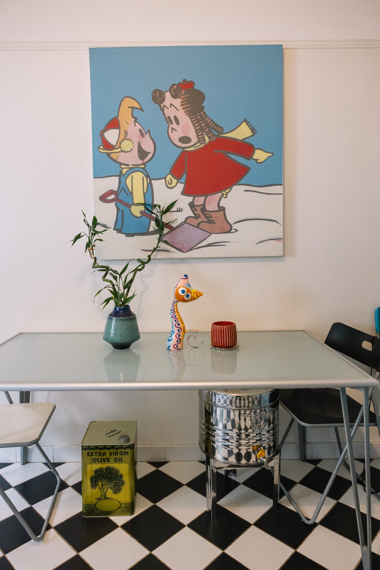 Η κουζίνα είναι πολύ cosy, με ασπρόμαυρο πλακάκι στο πάτωμα και γαλάζια ντουλάπια. Έχουν κρατήσει το μάρμαρο στον νεροχύτη και βγάζει κάτι νοσταλγικό χωρίς να δείχνει παλιά. Παιχνιδιάρικη διάθεση δίνει και η Μικρή Λουλού, το παλιό κόμικ, στον τοίχο. Τα μπάνια τα άλλαξαν. «Το μόνο στο οποίο δεν αντέχω την παλαιότητα είναι η τουαλέτα», λέει κατηγορηματικά η Αγνή.