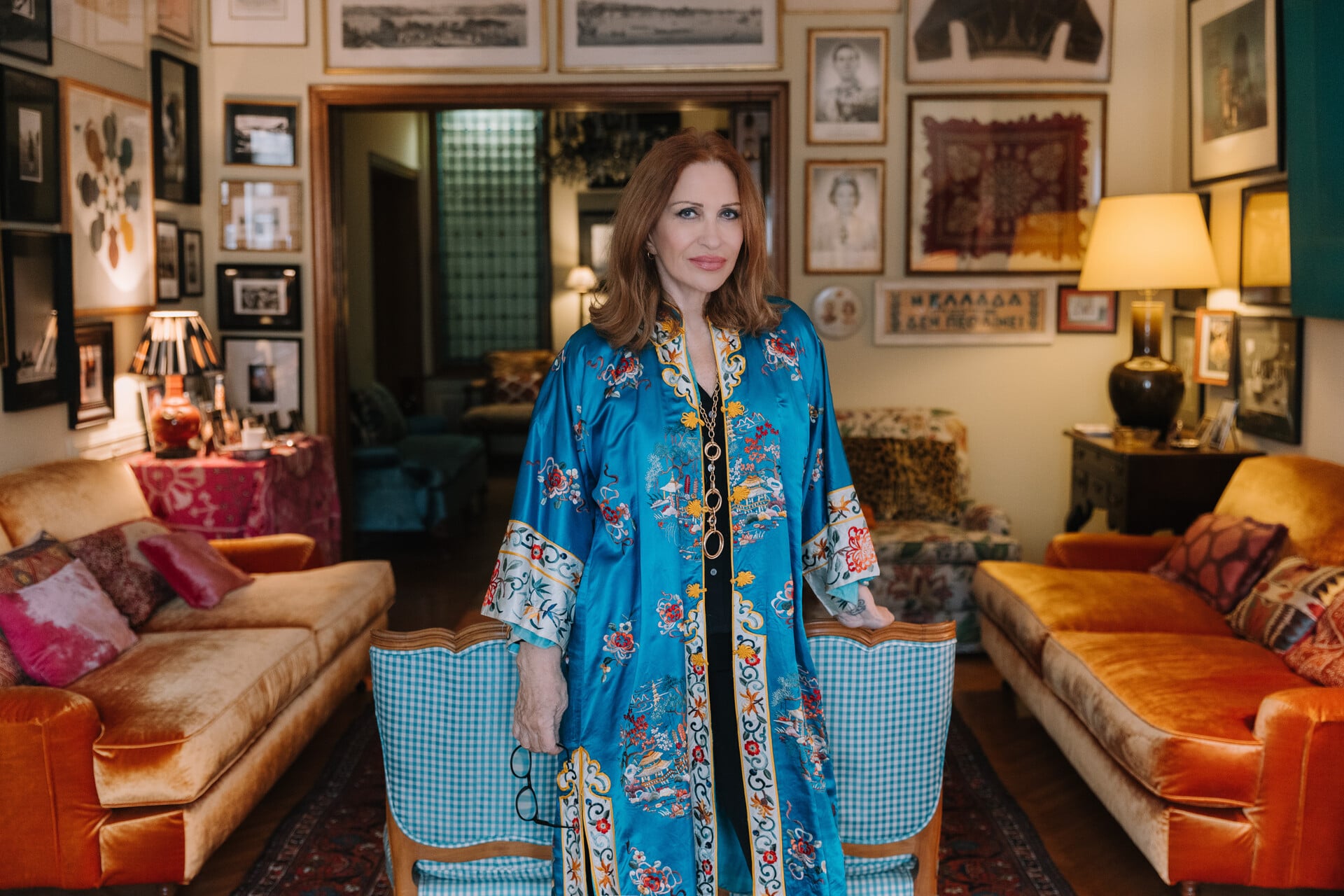 Περνάμε στο πολύχρωμο γραφείο της, που είναι γεμάτο κοσμήματα από ταξίδια και φωτογραφίες. «Πού βολεύεσαι πιο πολύ στο σπίτι;» τη ρωτάω. «Όπου βρω», απαντά αφοπλιστικά, οδηγώντας με στο TV room, έναν ακόμη μικρό κόσμο μέσα στο σπίτι.