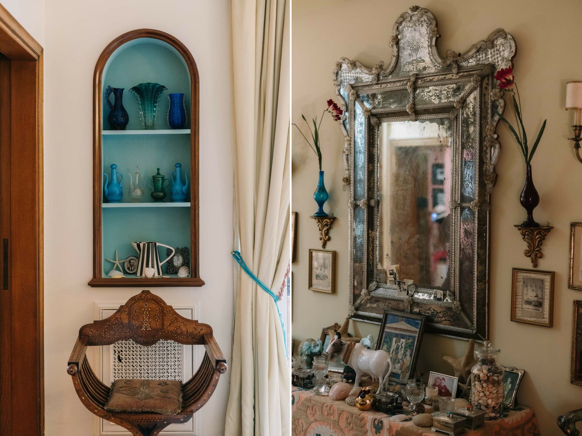 Το σύμπαν της Calliope δεν αντιγράφεται. Το σπίτι της είναι σαν ταχύρρυθμο σεμινάριο αισθητικής. Βρίσκεται σε κεντρικό δρόμο με θέα στον Εθνικό Κήπο, είναι λουσμένο στο φως και αποπνέει αρμονία. Το αντιλαμβάνομαι ως ταξίδι, σαν κάπου να προσγειώθηκα. Είναι γεμάτο αναφορές από τη μόδα, τη φωτογραφία και τα ταξίδια της. Η ίδια άλλωστε έχει μάθει να παρατηρεί τον κόσμο μέσα από αυτά τα διαδοχικά layers εικόνων, υφών και πολιτισμών.
