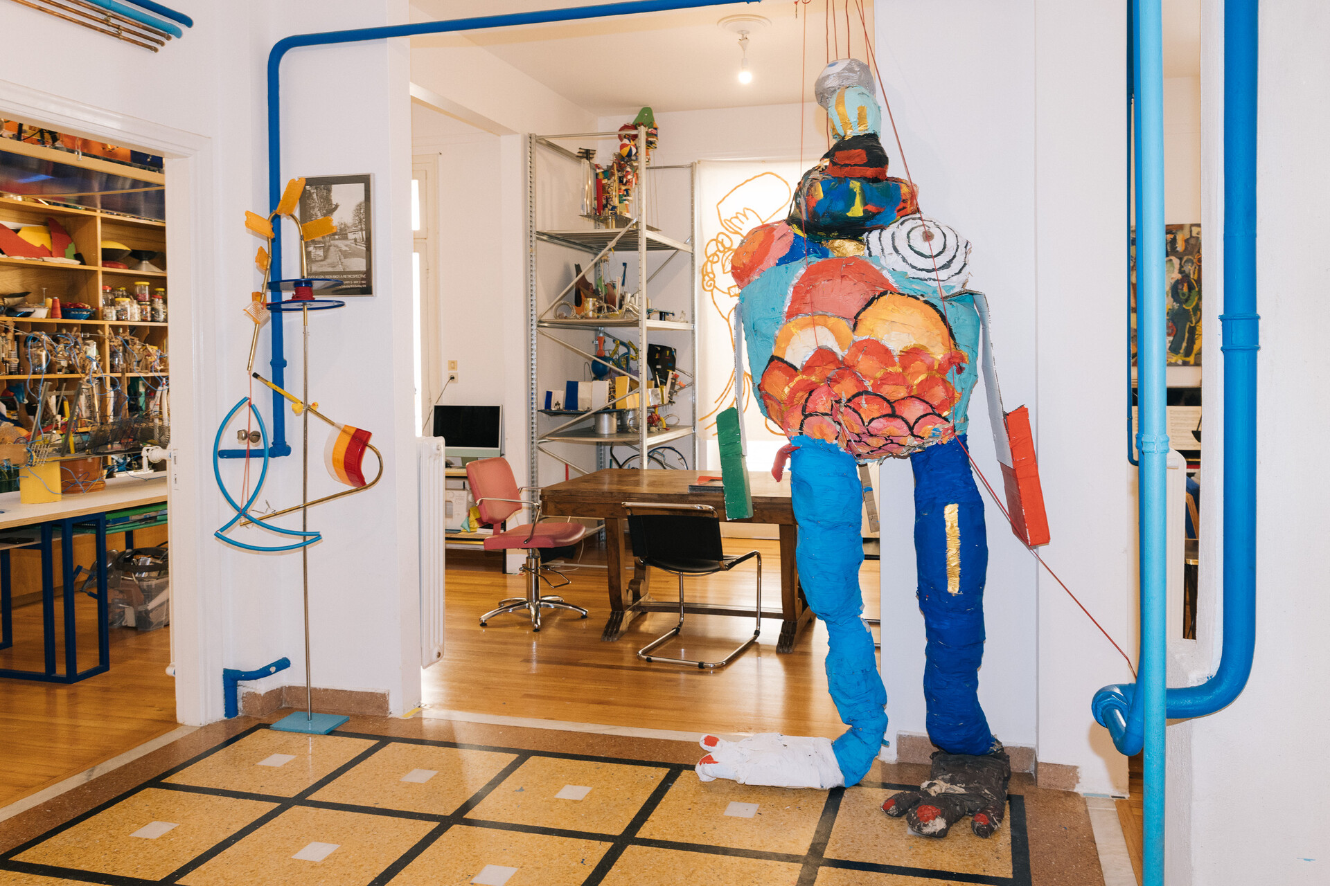 Στο σπίτι κυριαρχεί ένα πανύψηλο γλυπτό. Μαθαίνω ότι το λένε Μπαμ. Επειδή φεύγουν συχνά για art residency, ήθελαν τα παιδιά να βρίσκουν κάτι όταν επιστρέφουν, να υπάρχει ένα σημείο αναφοράς. Έφτιαξαν, λοιπόν, αυτό το τοτέμ μαζί με τη μεγάλη τους κόρη.