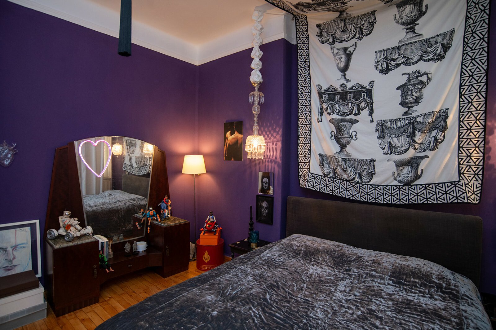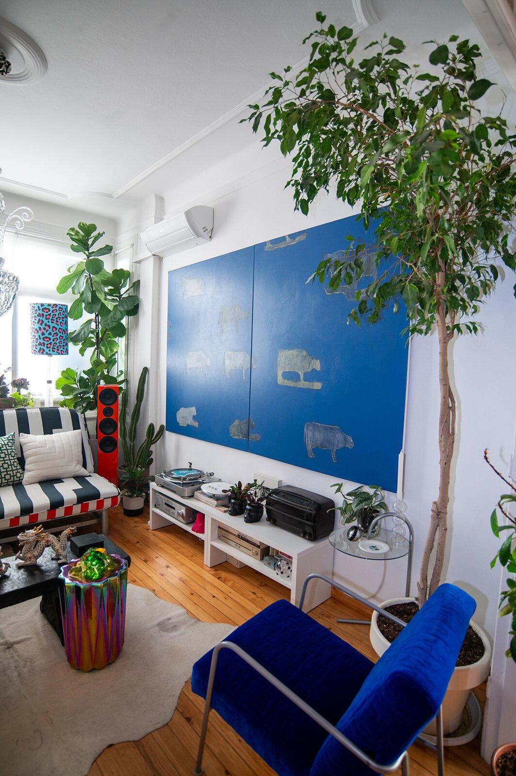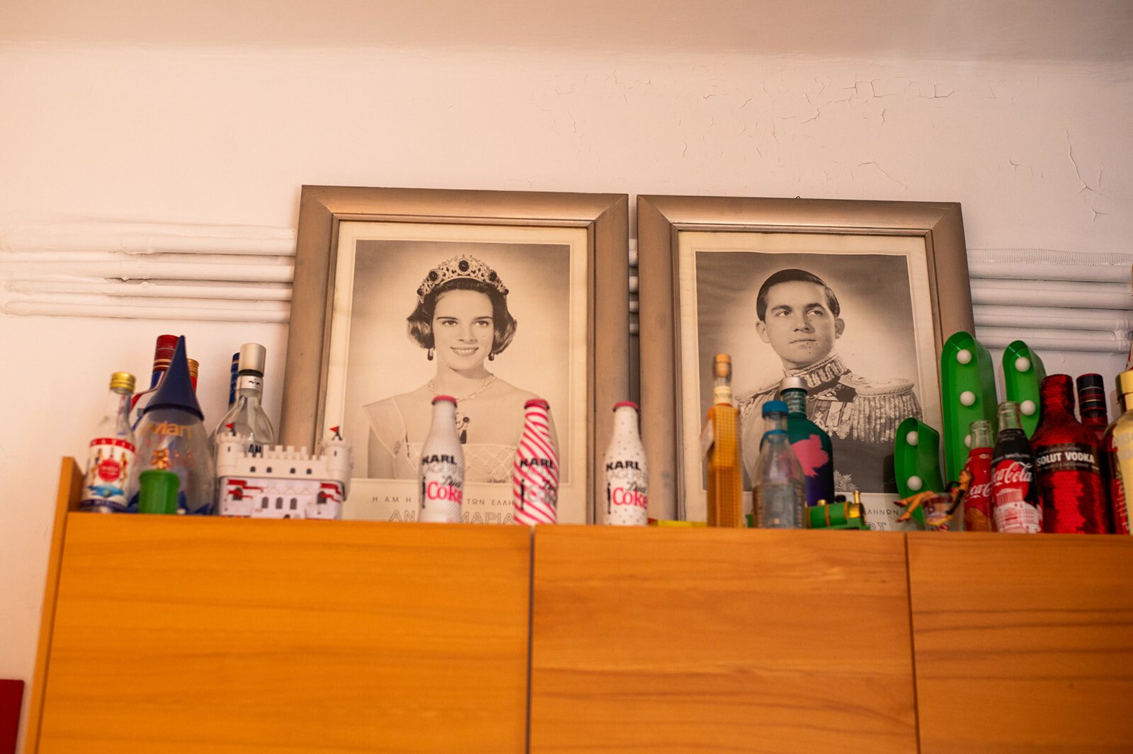 «Αν το σπίτι είχε φωνή, τι θα σου έλεγε;» τον ρωτάω. Σχεδόν αιφνιδιάζεται και κομπιάζει, ακούγεται σαν να λέει «ευχαριστώ». «Ευχαριστώ;» τον ρωτάω για να καταλάβω καλύτερα τι εννοεί. «Ναι, “ευχαριστώ”, αλλά με την έννοια της συμπεριληπτικότητας, και εννοώ τον τρόπο που συνδύασα αντικείμενα αρ νουβό, αρ ντεκό, ποπ αρτ και τρας με εξώφυλλα δίσκων, μπουκάλια, τους πίνακές μου και τα πορτρέτα των τέως βασιλιάδων, που τα έβαλα επίτηδες όχι λόγω φρονήματος αλλά για το κιτς του πράγματος. Έχω αντικείμενα, ιστορίες και ένα σωρό συναισθηματικά και ευτελή αντικείμενα, πολλά από τα οποία τα κουβάλησα από το Λονδίνο, όπου έζησα κοντά μια δεκαετία».