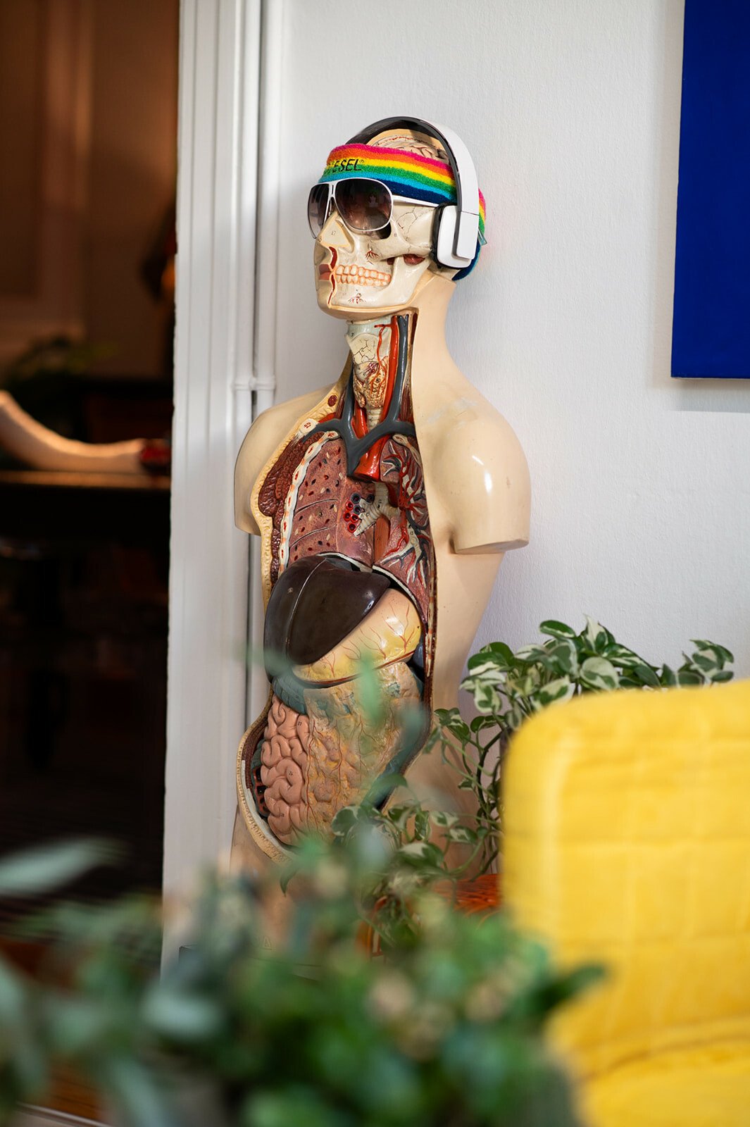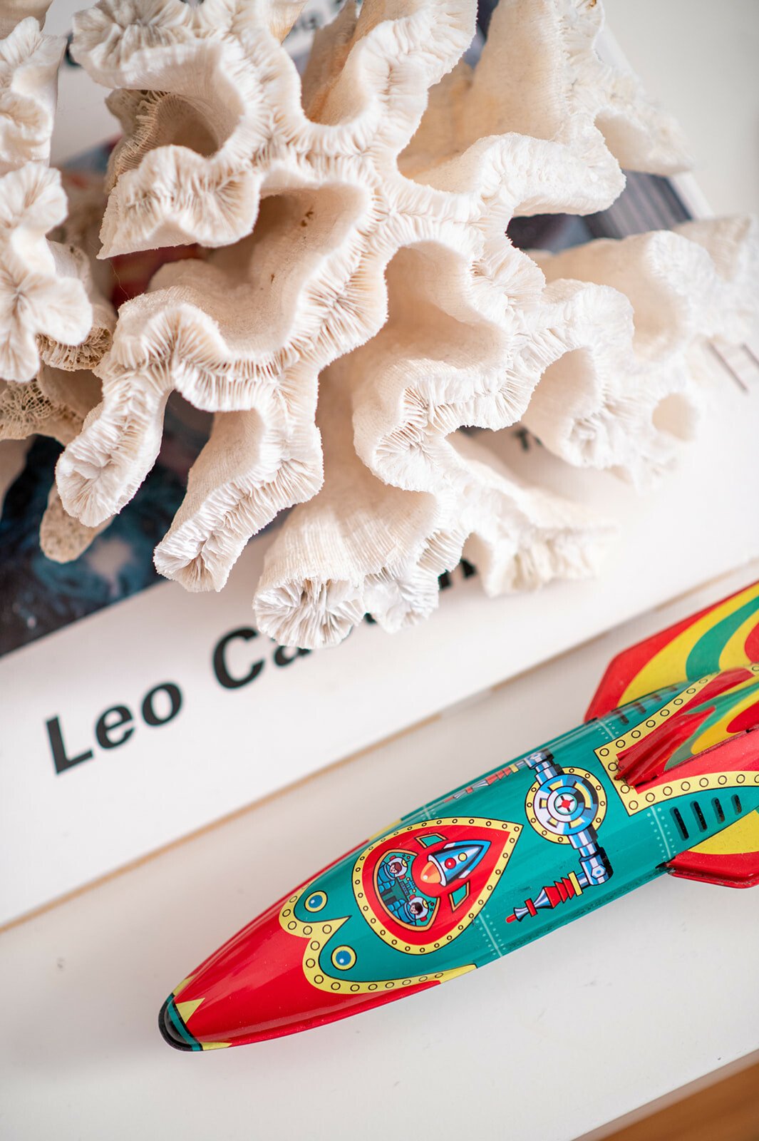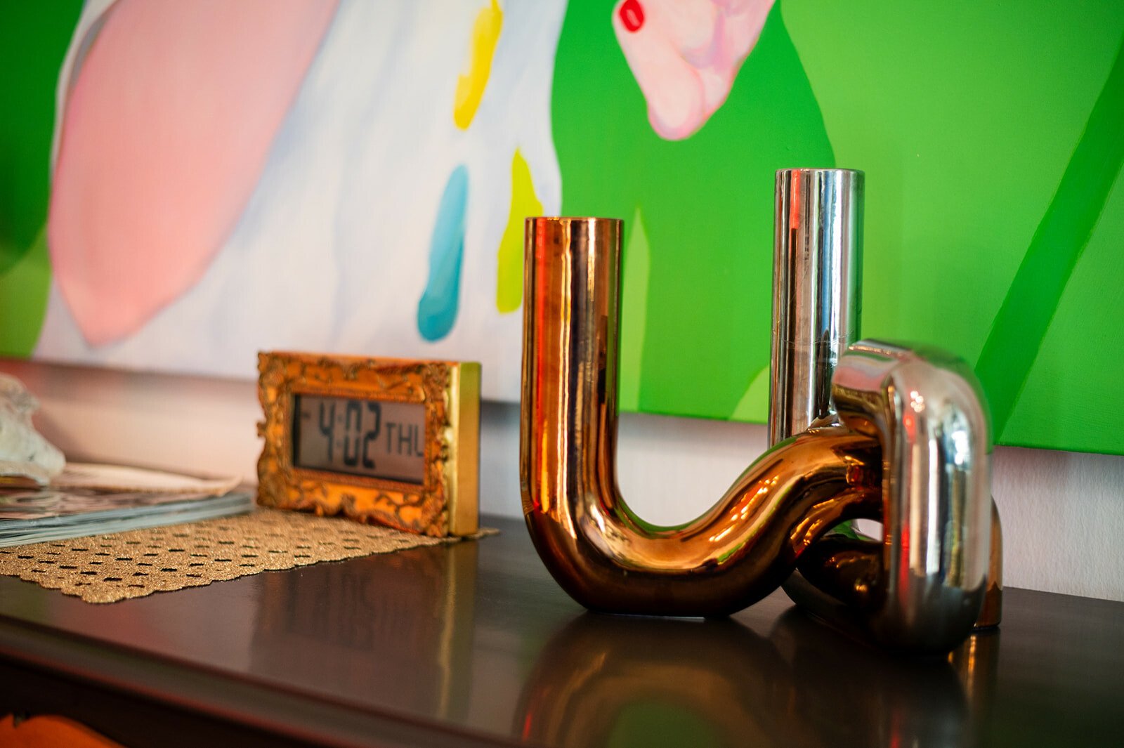«Αν το σπίτι είχε φωνή, τι θα σου έλεγε;» τον ρωτάω. Σχεδόν αιφνιδιάζεται και κομπιάζει, ακούγεται σαν να λέει «ευχαριστώ». «Ευχαριστώ;» τον ρωτάω για να καταλάβω καλύτερα τι εννοεί. «Ναι, “ευχαριστώ”, αλλά με την έννοια της συμπεριληπτικότητας, και εννοώ τον τρόπο που συνδύασα αντικείμενα αρ νουβό, αρ ντεκό, ποπ αρτ και τρας με εξώφυλλα δίσκων, μπουκάλια, τους πίνακές μου και τα πορτρέτα των τέως βασιλιάδων, που τα έβαλα επίτηδες όχι λόγω φρονήματος αλλά για το κιτς του πράγματος. Έχω αντικείμενα, ιστορίες και ένα σωρό συναισθηματικά και ευτελή αντικείμενα, πολλά από τα οποία τα κουβάλησα από το Λονδίνο, όπου έζησα κοντά μια δεκαετία».