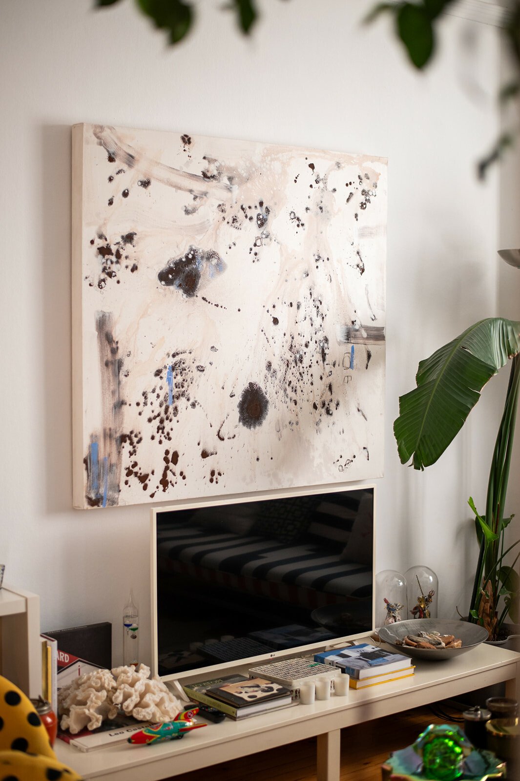 Τον ρωτώ τι είναι για εκείνον το σπίτι και μου απαντά το καταφύγιό του – ξέρει ότι δεν είναι καθόλου πρωτότυπη η απάντηση, αλλά δεν μπορεί να σκεφτεί κάτι πιο ταιριαστό. Μου εξηγεί ότι μέσα στο διαμέρισμα είναι και το εργαστήριό του, οπότε θα μπορούσαμε να πούμε ότι το σπίτι λειτουργεί και ως «δημιουργική σπηλιά». «Κλείνομαι με τις ώρες στο εργαστήριο, χάνομαι στον χωροχρόνο και στη δημιουργία», λέει.