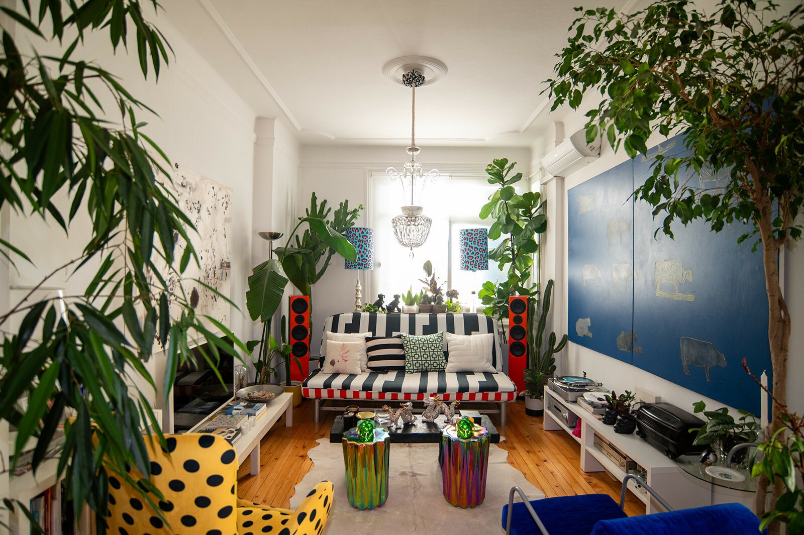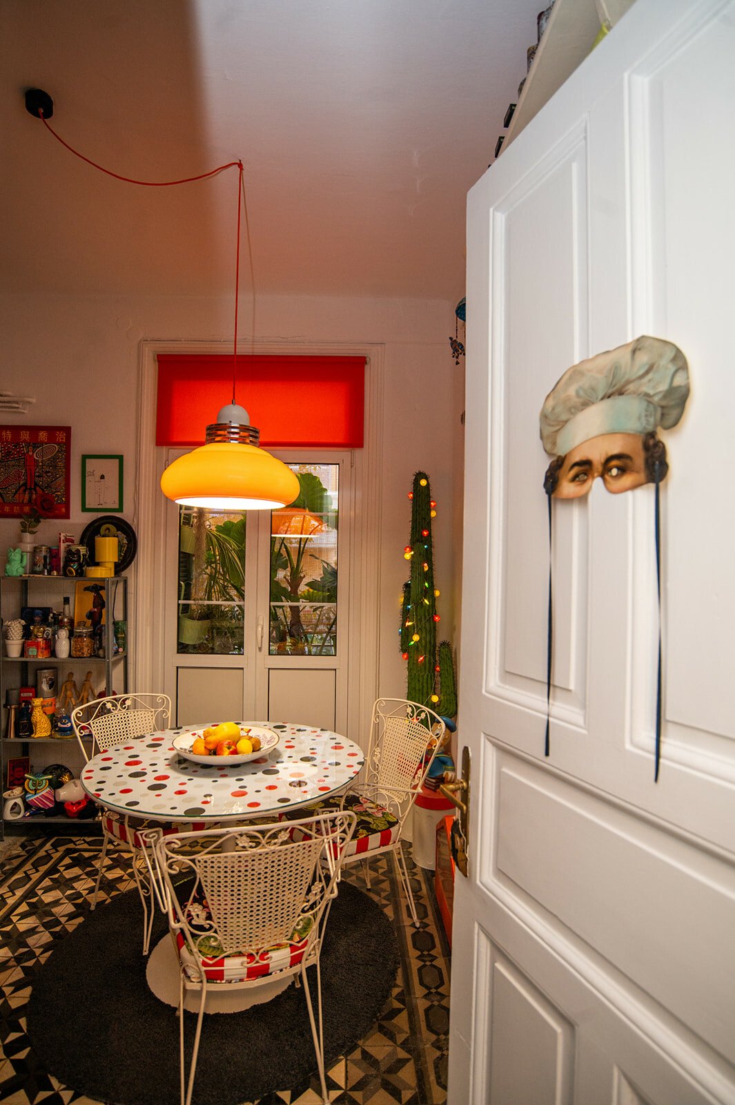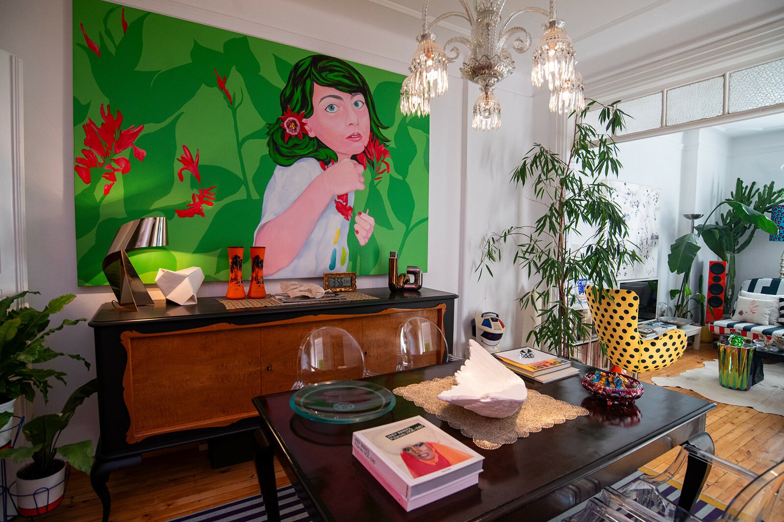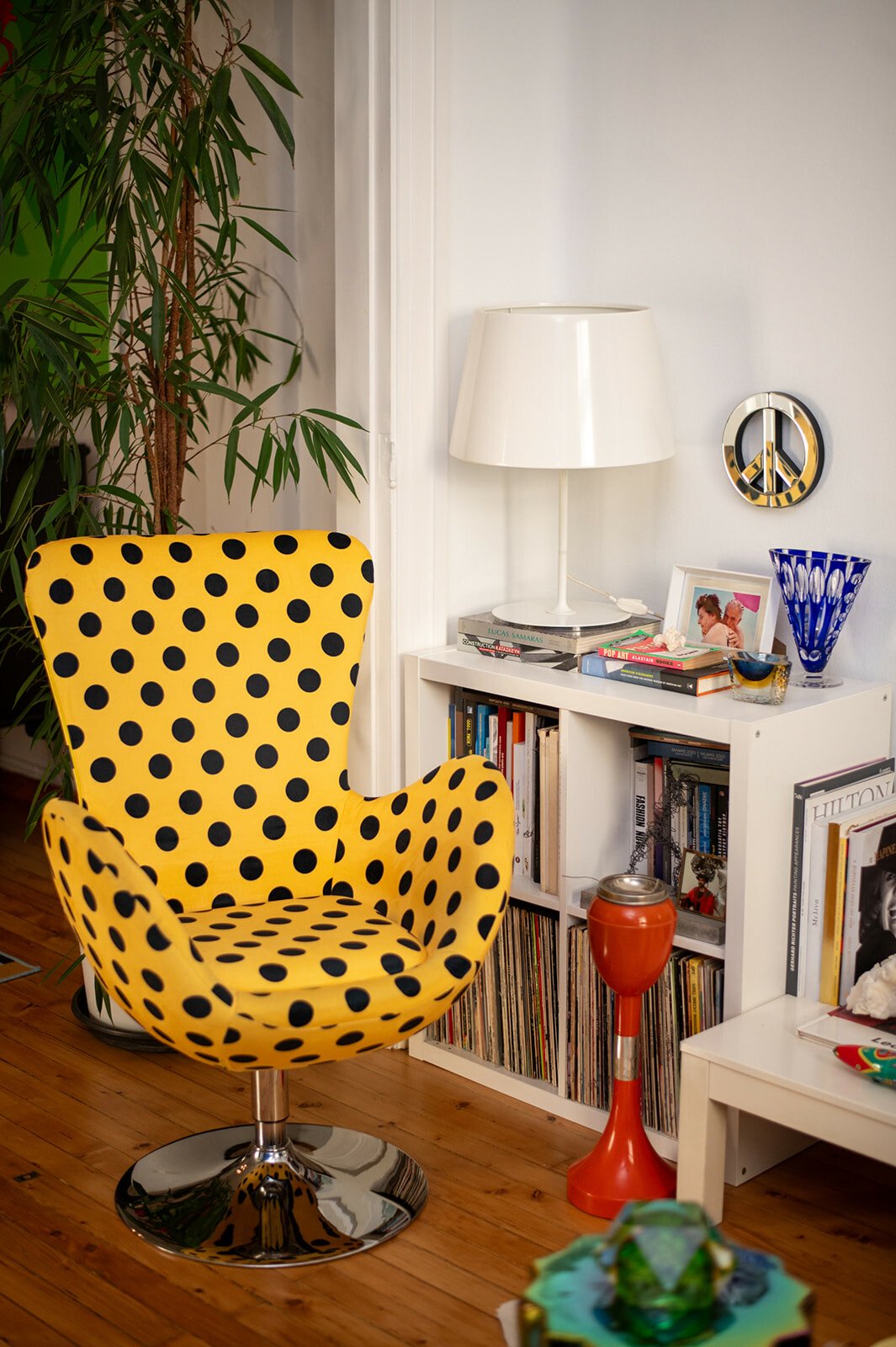 Τον ρωτάω για τα όμορφα έπιπλά του. Tο μάτι μου πέφτει στα πορτοκαλί ηχεία. Ήταν coup fe foudre, λέει, λόγω χρώματος, είναι της τεχνολογίας της Heco. Του λέω ότι ερωτεύτηκα την κίτρινη πολυθρόνα με τα μαύρα πουά. Είναι custom made, αγορασμένη από τη Retro so it is. Τη χάζευε, λέει, μέσα στην καραντίνα, και τελικά την απέκτησε. Τα φωτιστικά είναι αγορασμένα από παλιατζίδικα της Τοσίτσα και του θυμίζουν την παιδική του ηλικία. Το φουτουριστικό φωτιστικό της κουζίνα, όπως και οι κρυστάλλινες λάμπες στο καθιστικό, είναι από τον Θανάση Μαυρομάτη του Junk shop στην Καλαμαριά.