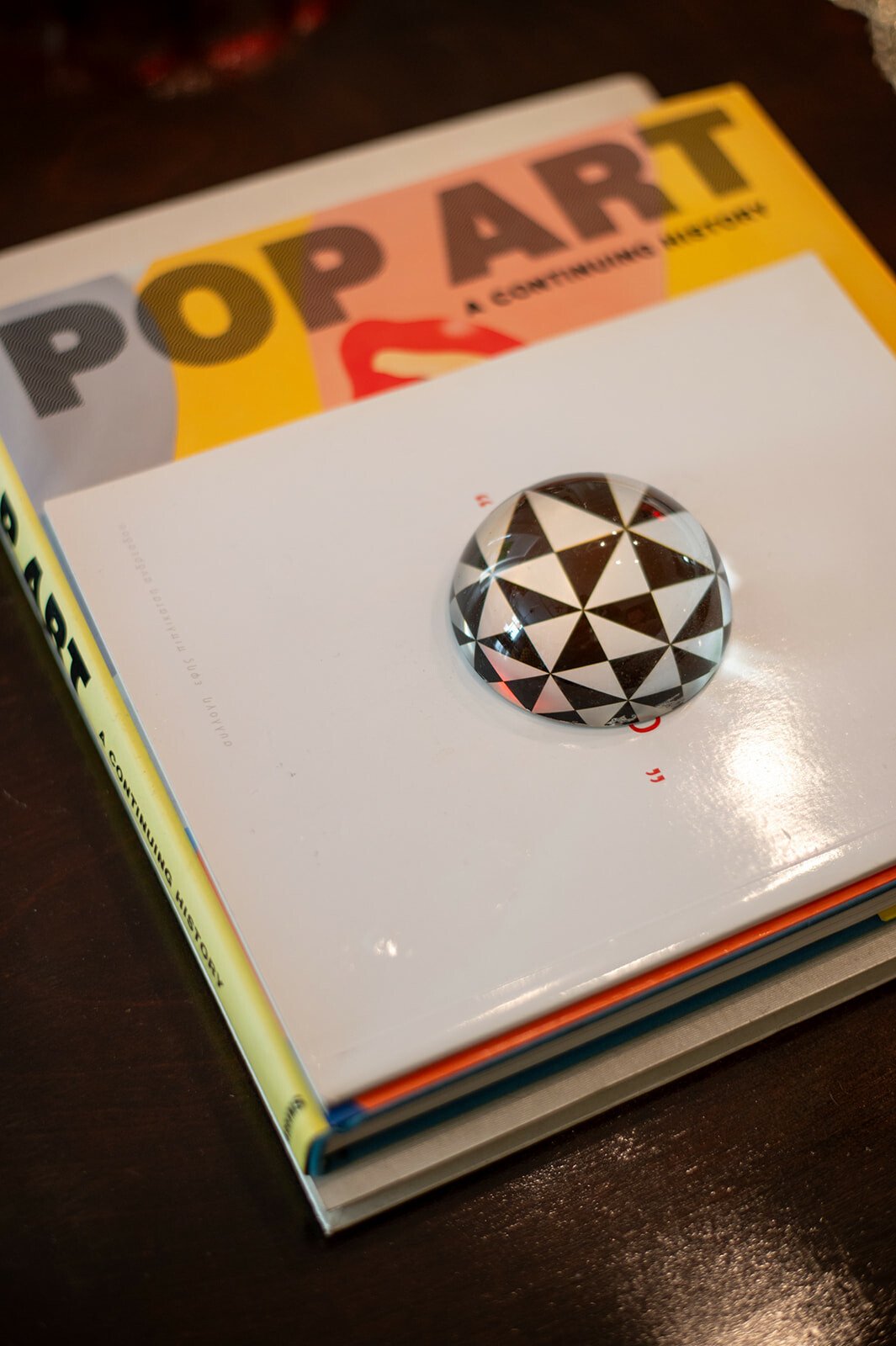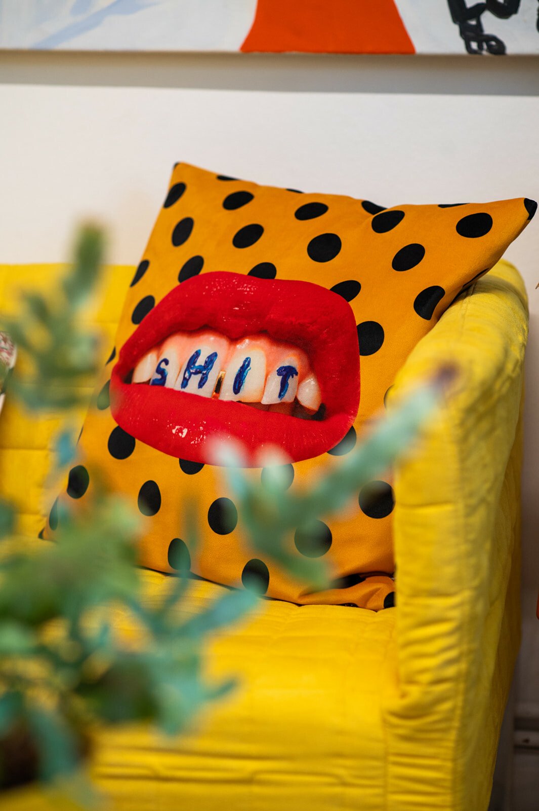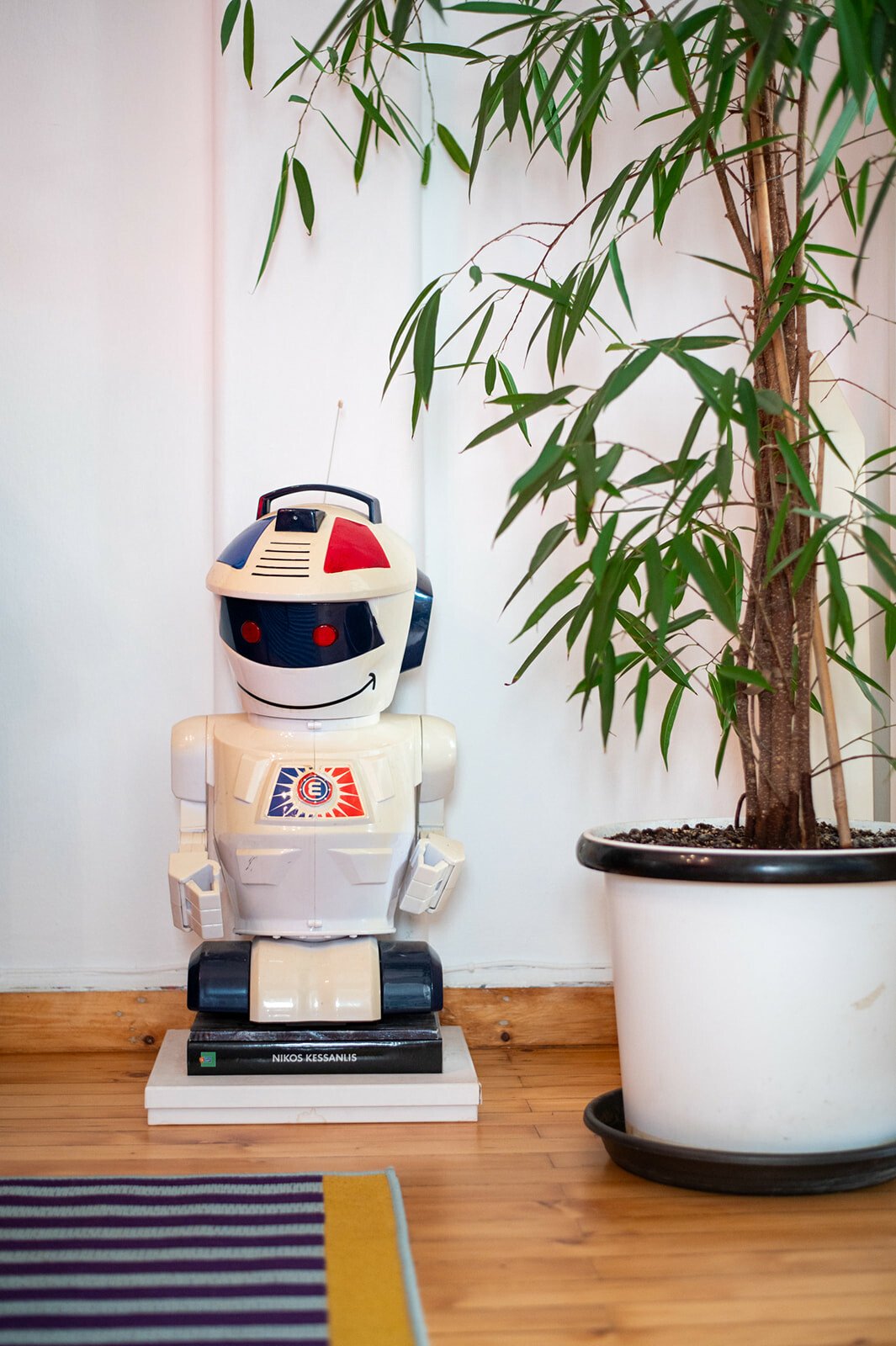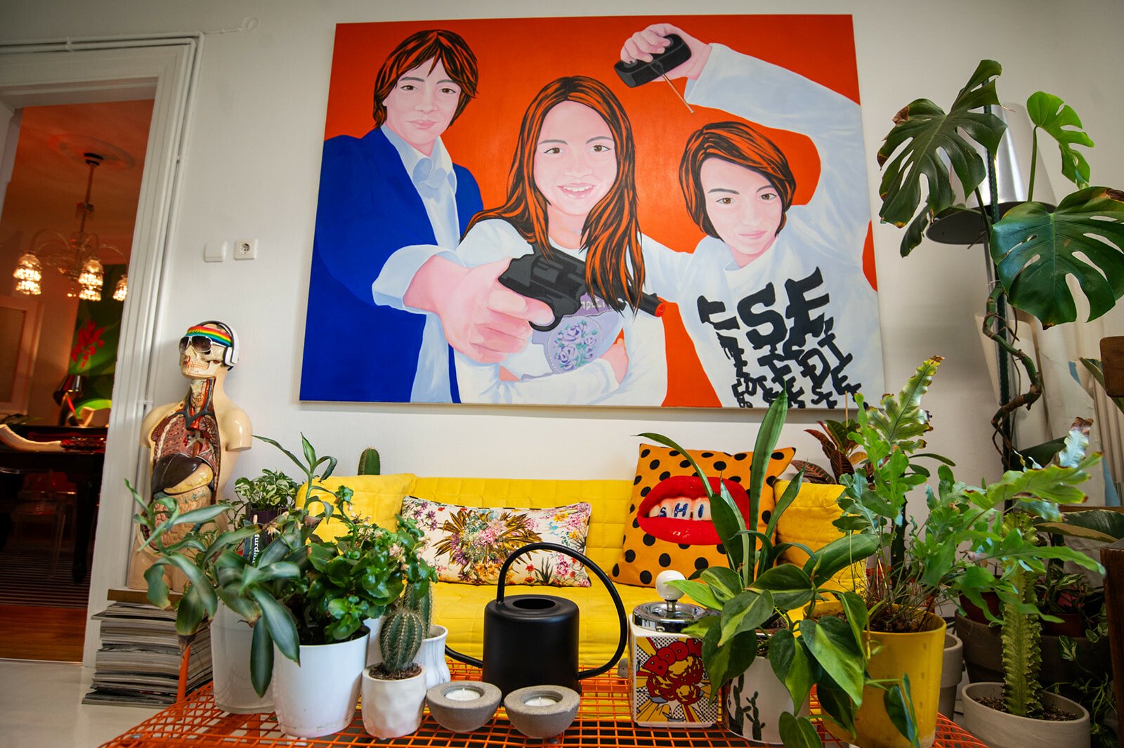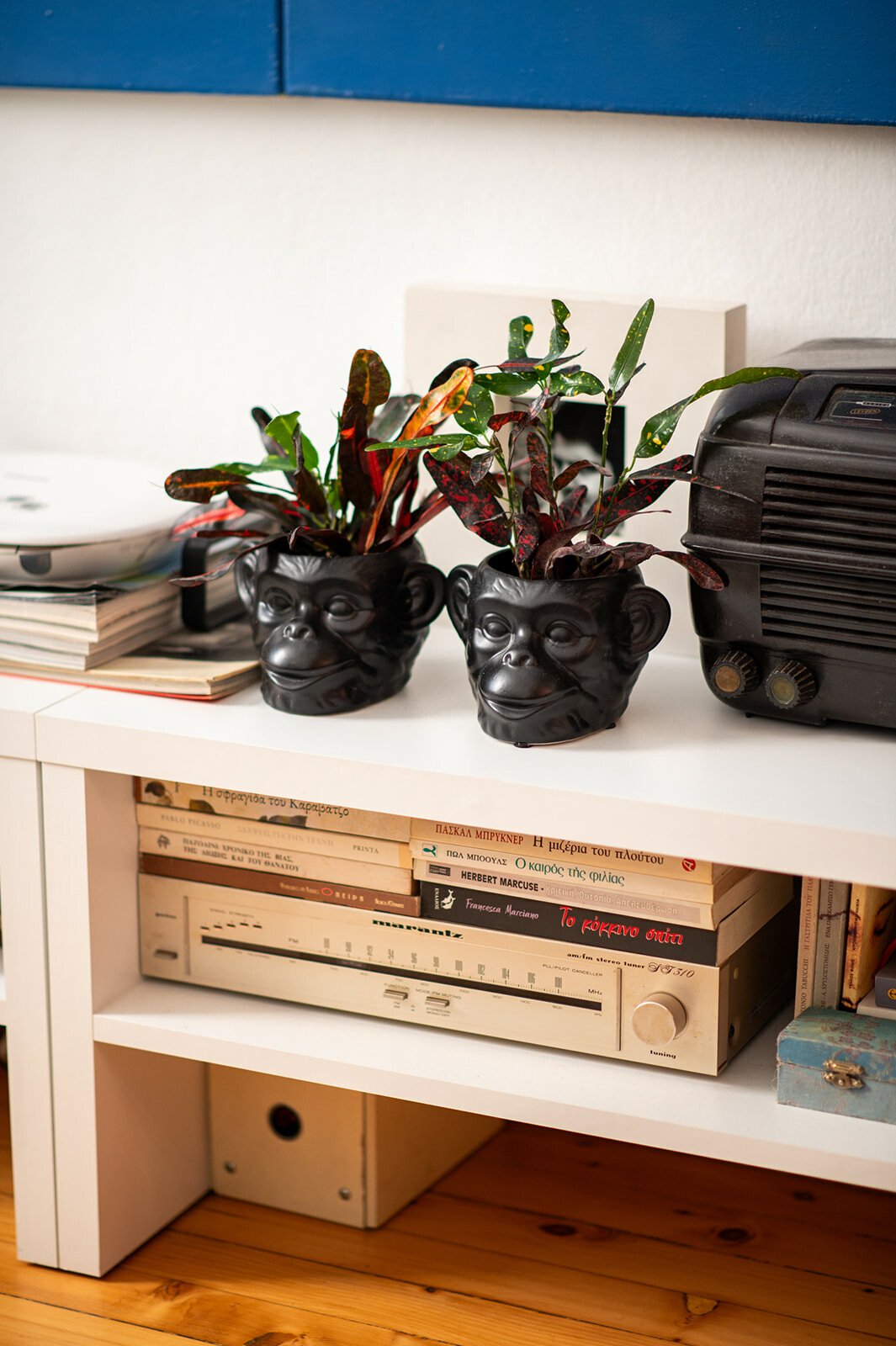 Τον ρωτάω για τα όμορφα έπιπλά του. Tο μάτι μου πέφτει στα πορτοκαλί ηχεία. Ήταν coup fe foudre, λέει, λόγω χρώματος, είναι της τεχνολογίας της Heco. Του λέω ότι ερωτεύτηκα την κίτρινη πολυθρόνα με τα μαύρα πουά. Είναι custom made, αγορασμένη από τη Retro so it is. Τη χάζευε, λέει, μέσα στην καραντίνα, και τελικά την απέκτησε. Τα φωτιστικά είναι αγορασμένα από παλιατζίδικα της Τοσίτσα και του θυμίζουν την παιδική του ηλικία. Το φουτουριστικό φωτιστικό της κουζίνα, όπως και οι κρυστάλλινες λάμπες στο καθιστικό, είναι από τον Θανάση Μαυρομάτη του Junk shop στην Καλαμαριά.