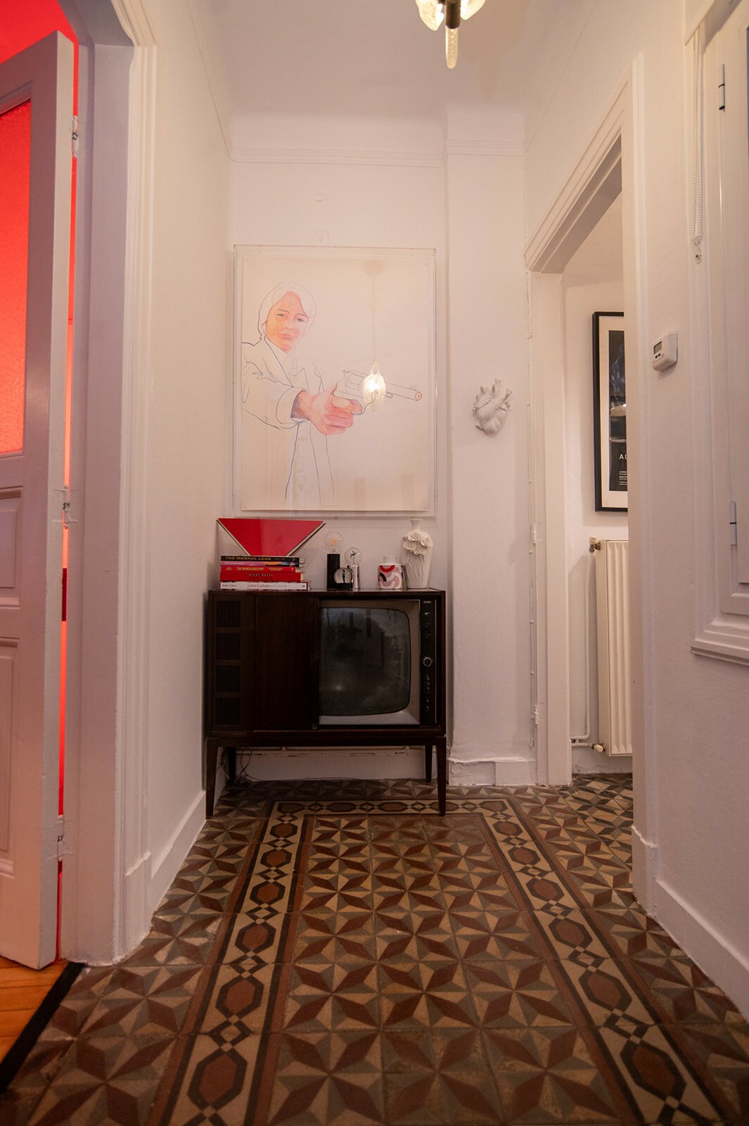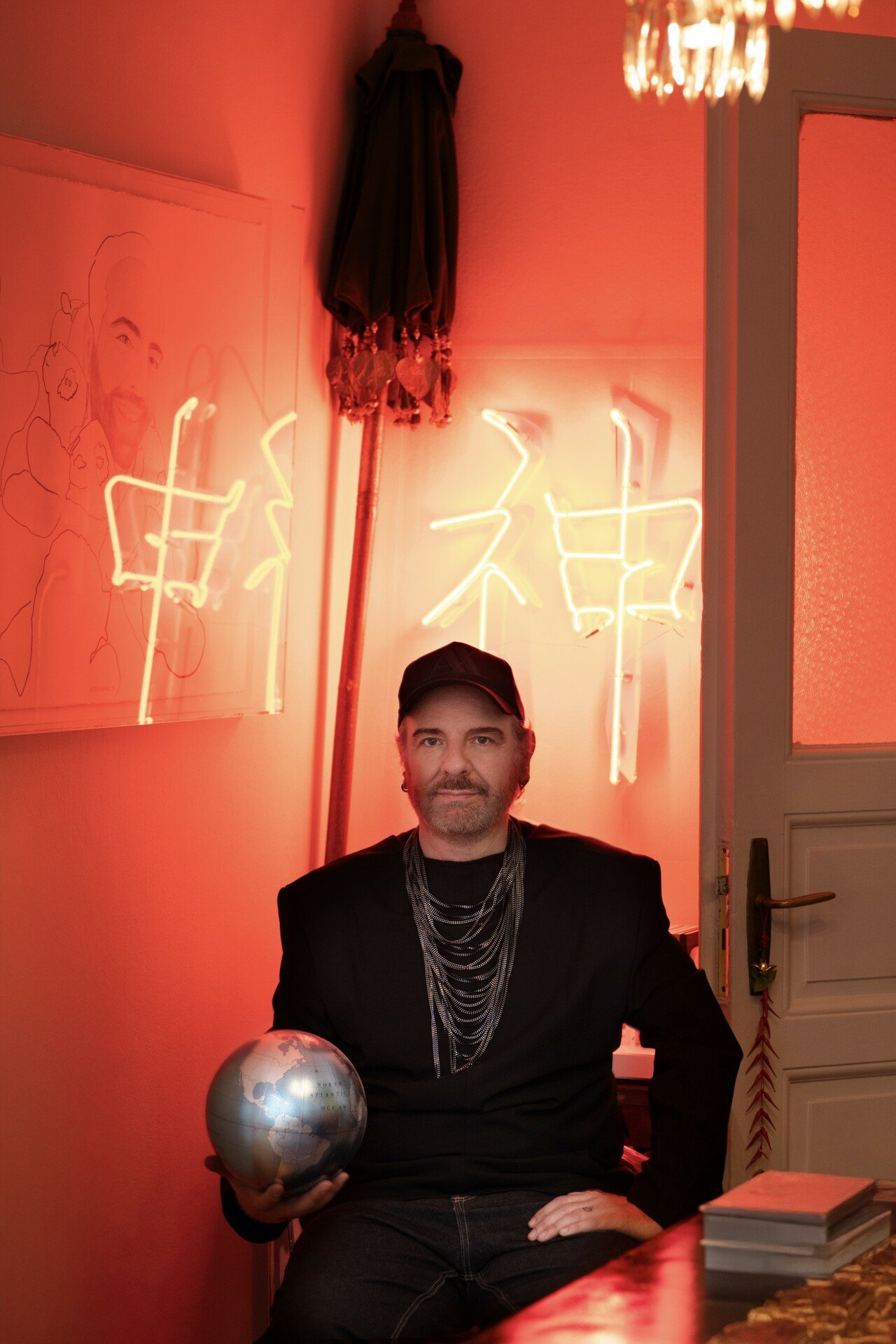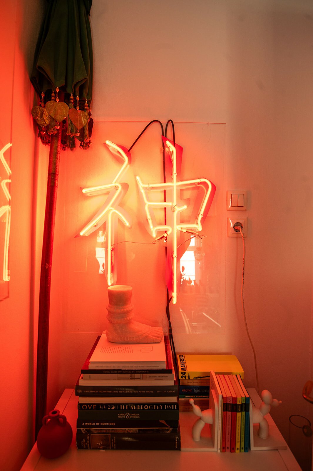 Το νέον με το κινέζικο ιδεόγραμμα που σημαίνει «αγάπη» είναι του Νίκου Ρακκά. Μου εξηγεί ότι πολλά χρηστικά αντικείμενα, όπως βάζα και πιάτα, τα έφερε προίκα από το πατρικό του.