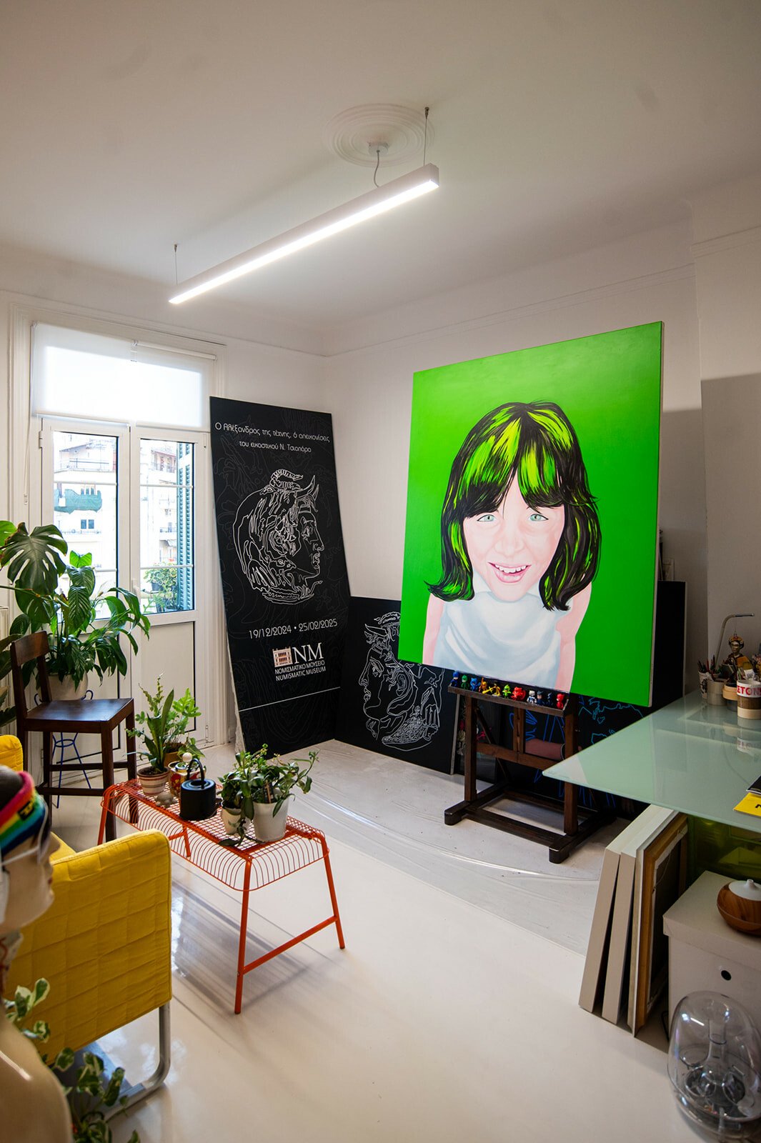 Πέρα από τις ώρες που δημιουργεί, όμως, όλος ο υπόλοιπος χώρος είναι χώρος αγάπης, δηλώνει. Τον ρωτάω γιατί τον ονομάζει έτσι και μου εξηγεί ότι στο σπίτι έρχονται συνέχεια όσοι αγαπά. Του αρέσει να είναι γεμάτο με φίλους και αγαπημένους συγγενείς, με όσους νιώθει κοντά. «Είναι ένα σπίτι εξωστρεφές. Σαν να με παίρνει απ’ το χέρι και να μου λέει “έλα, ας δώσουμε λίγη χαρά στον πεσιμιστή μονόχνοτο καλλιτέχνη που κρύβεις μέσα σου”». Γελάμε.