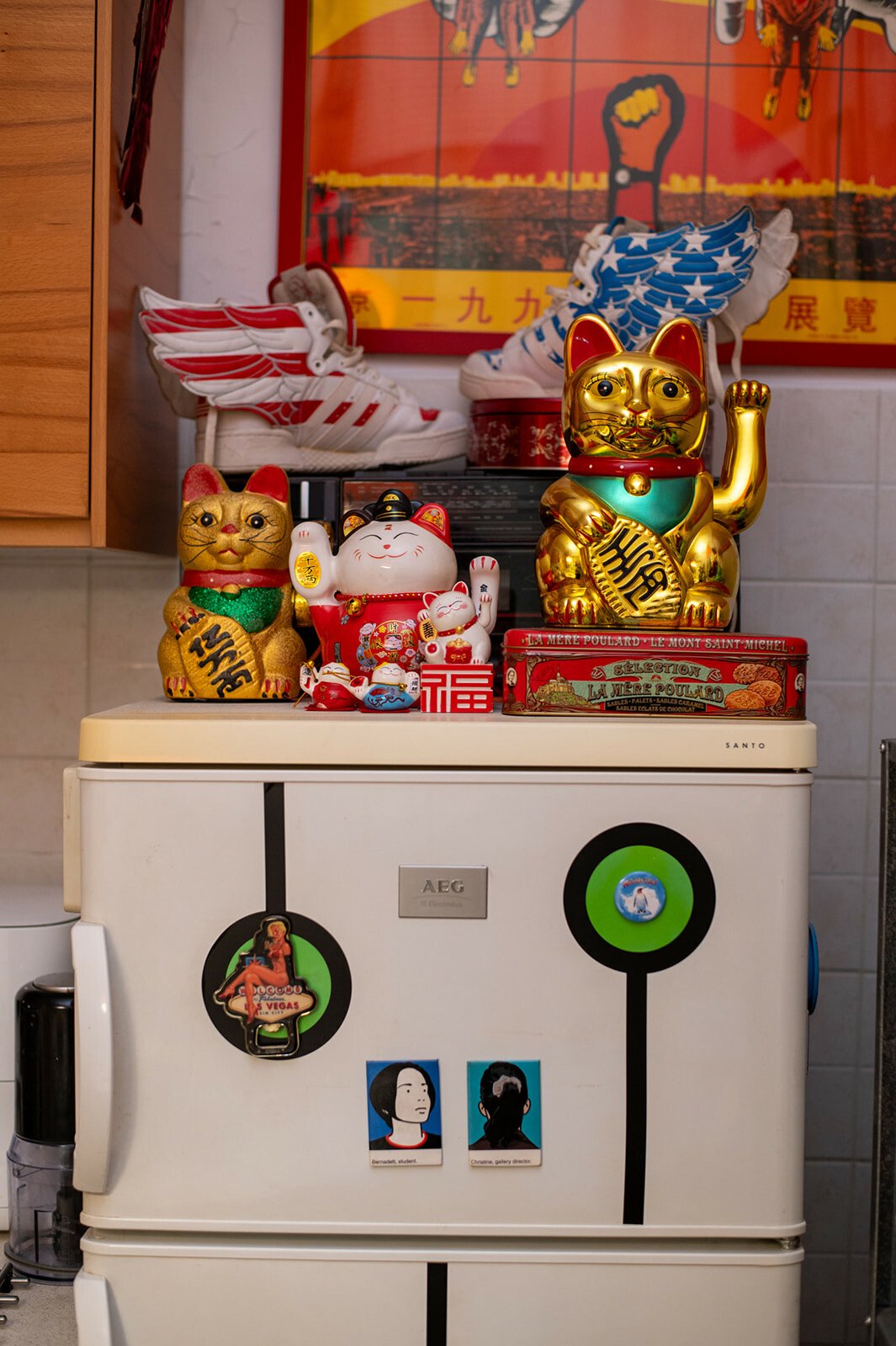 Στην κουζίνα του υπάρχουν συλλεκτικά μπουκάλια από ποτά και, άκουσον άκουσον, κίτρινα κουτάκια Coca-Cola από την επέτειο εκατό χρόνων του Selfridges. Το μάτι μου πέφτει και σε μια υπογεγραμμένη αφίσα από τους Gilbert & George.